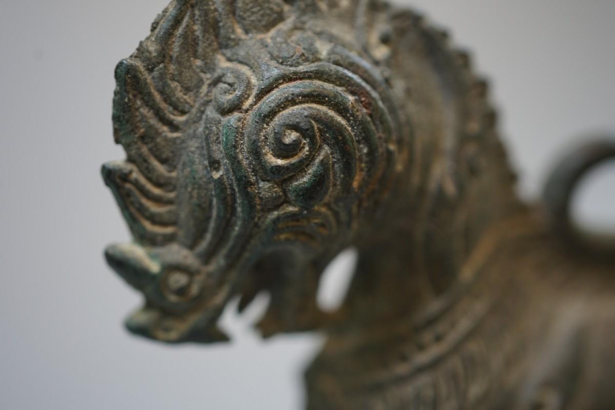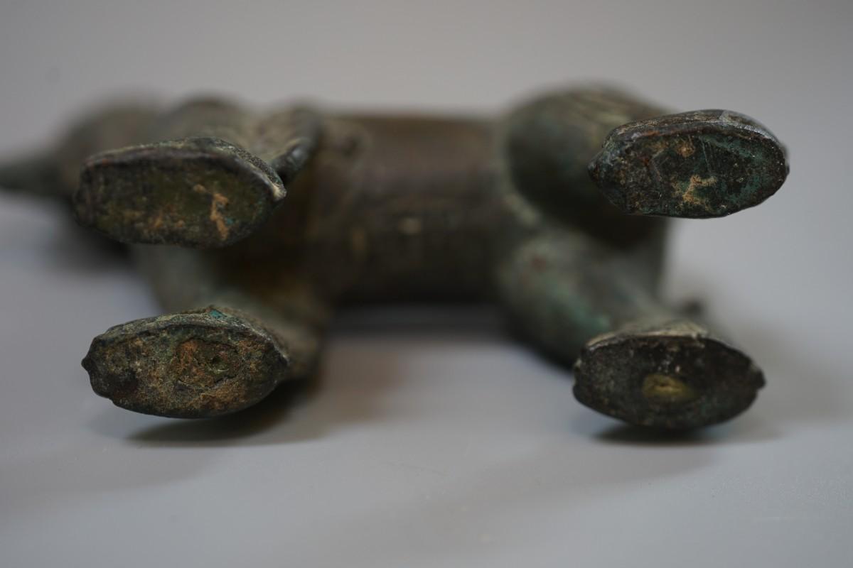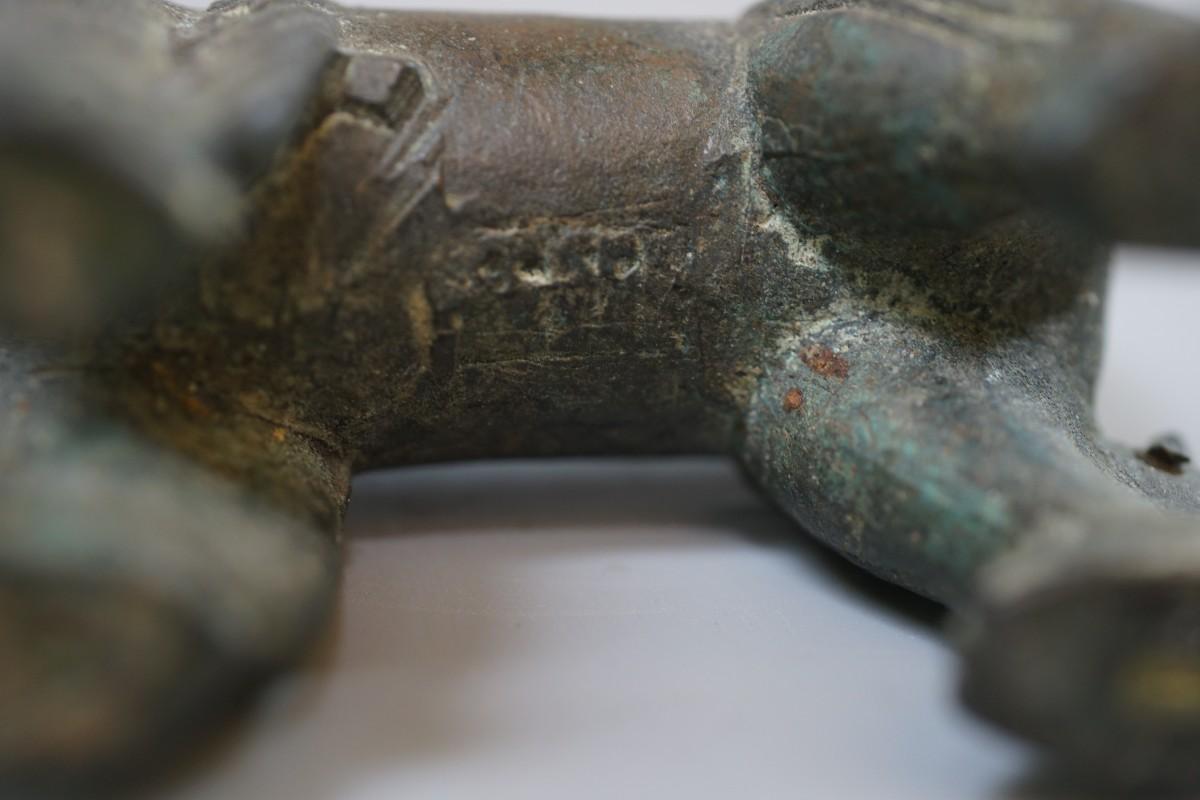 this piece appears to have age to the bronze. There is a two line stamp on the bottom that has wear and can not make it out.