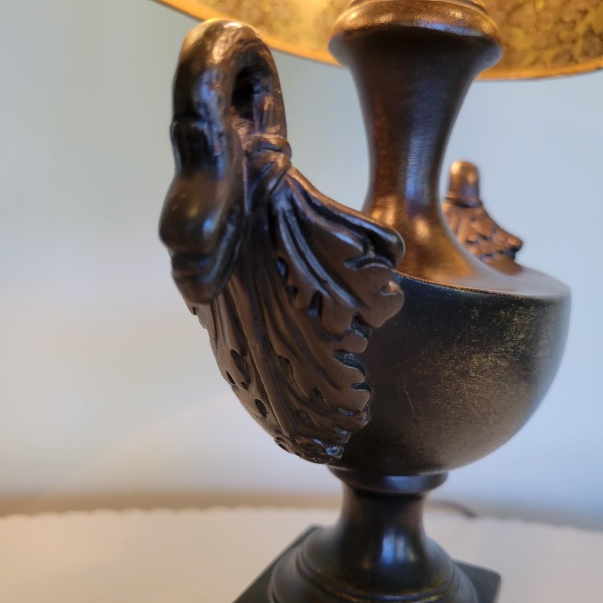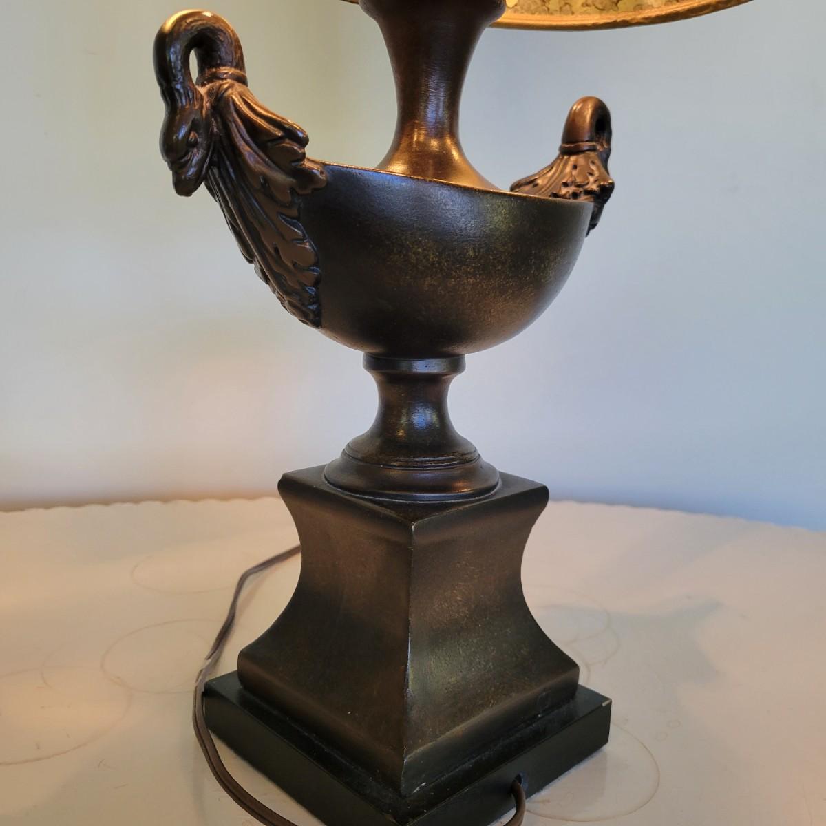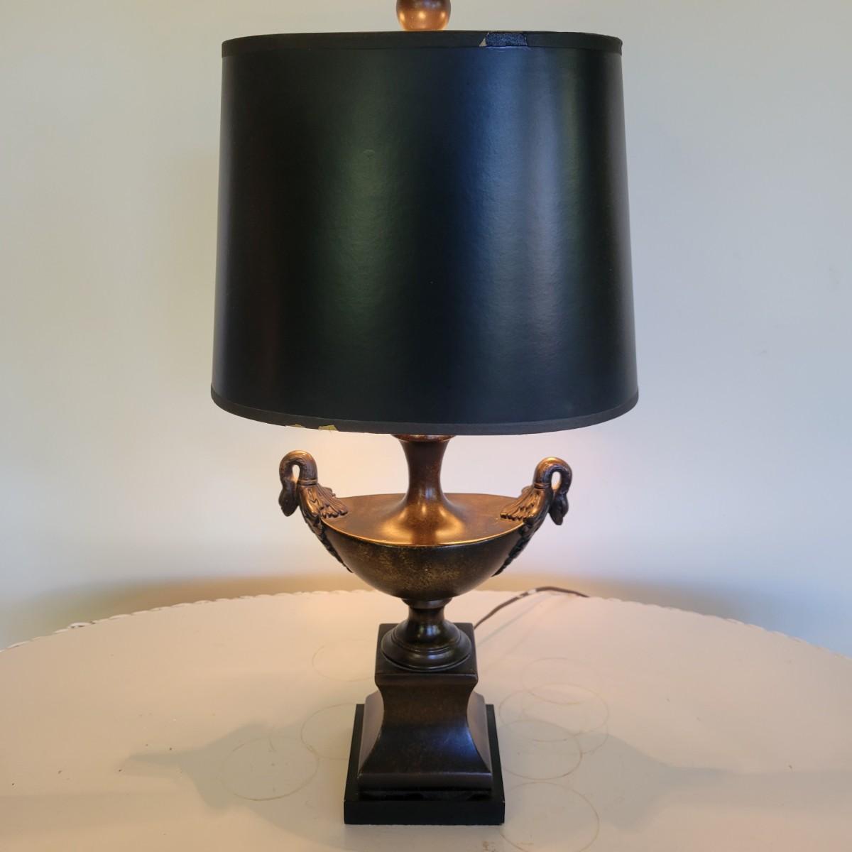 A small lamp in good condition with only a slight amount of damage on the shade and a small area missing paint, see image. This lamp appears to be made of brass and has a bronze-colored finish. It is shaped like a Grecian urn and has a black paper shade with a metallic interior. Measures approximately 8" x 4.5" x 21". Shipping available. Shipping can be costly. We suggest calling our local UPS with dimensions and getting an estimate before bidding: (828) 252-6930.