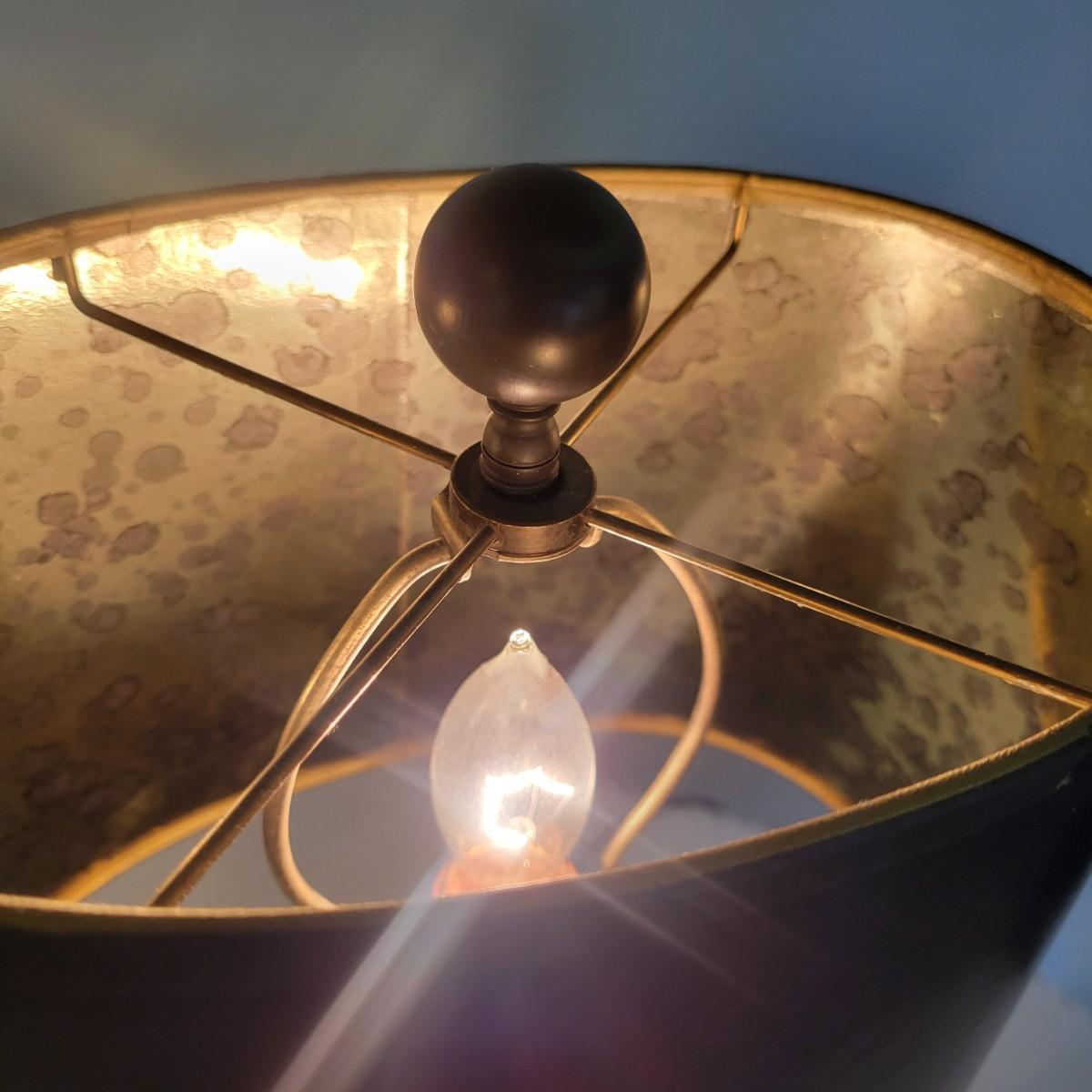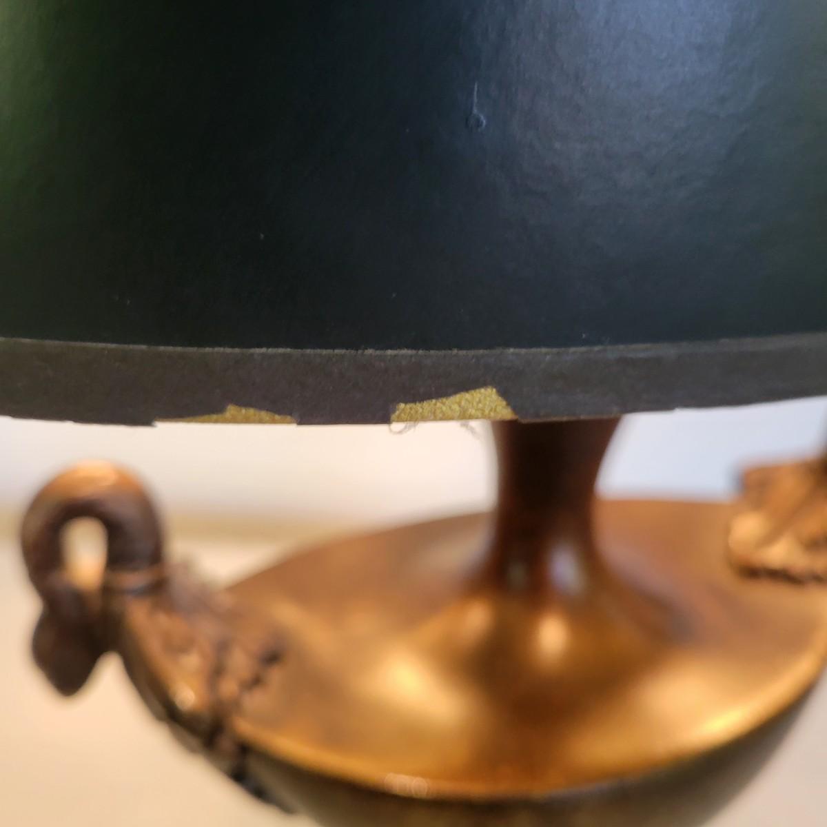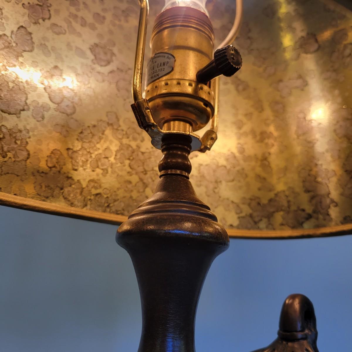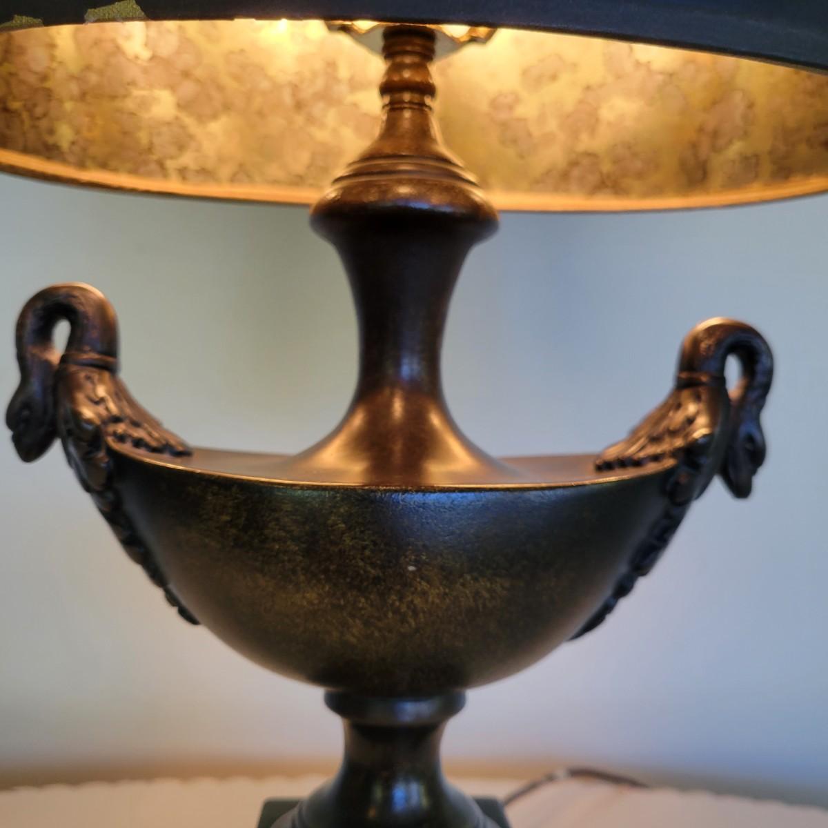 A small lamp in good condition with only a slight amount of damage on the shade and a small area missing paint, see image. This lamp appears to be made of brass and has a bronze-colored finish. It is shaped like a Grecian urn and has a black paper shade with a metallic interior. Measures approximately 8" x 4.5" x 21". Shipping available. Shipping can be costly. We suggest calling our local UPS with dimensions and getting an estimate before bidding: (828) 252-6930.