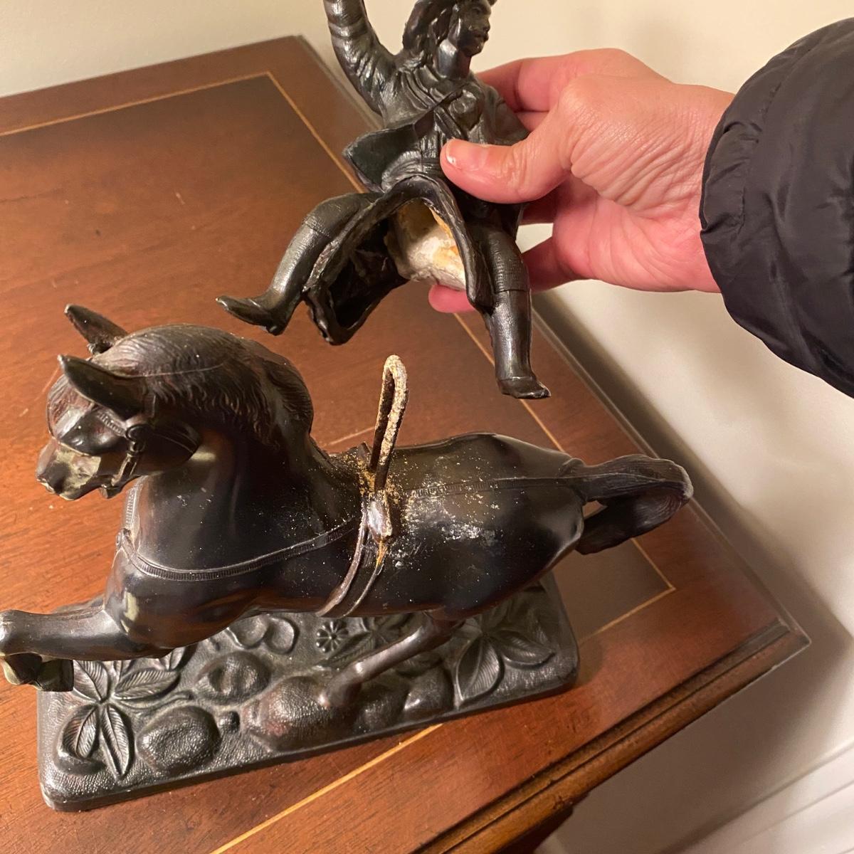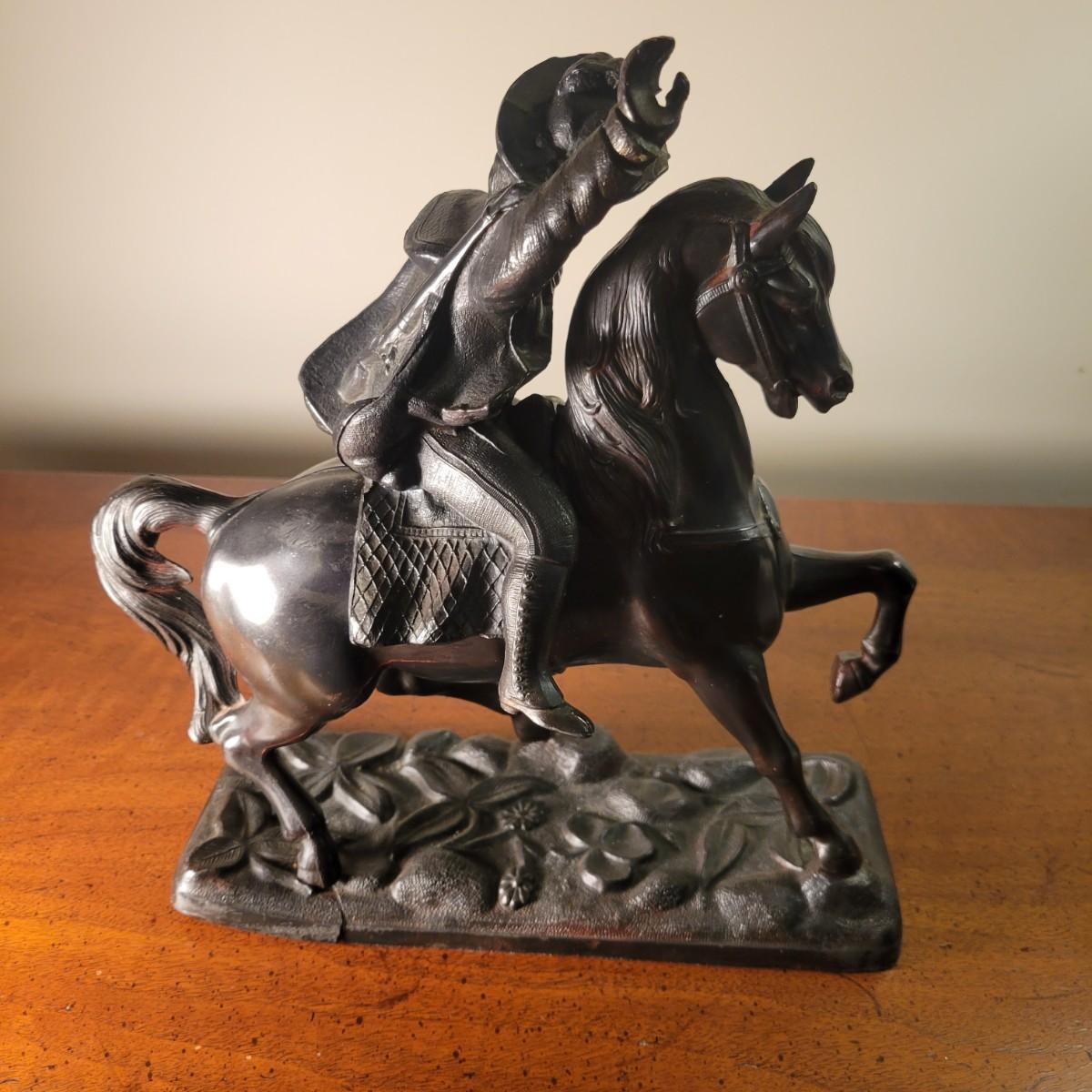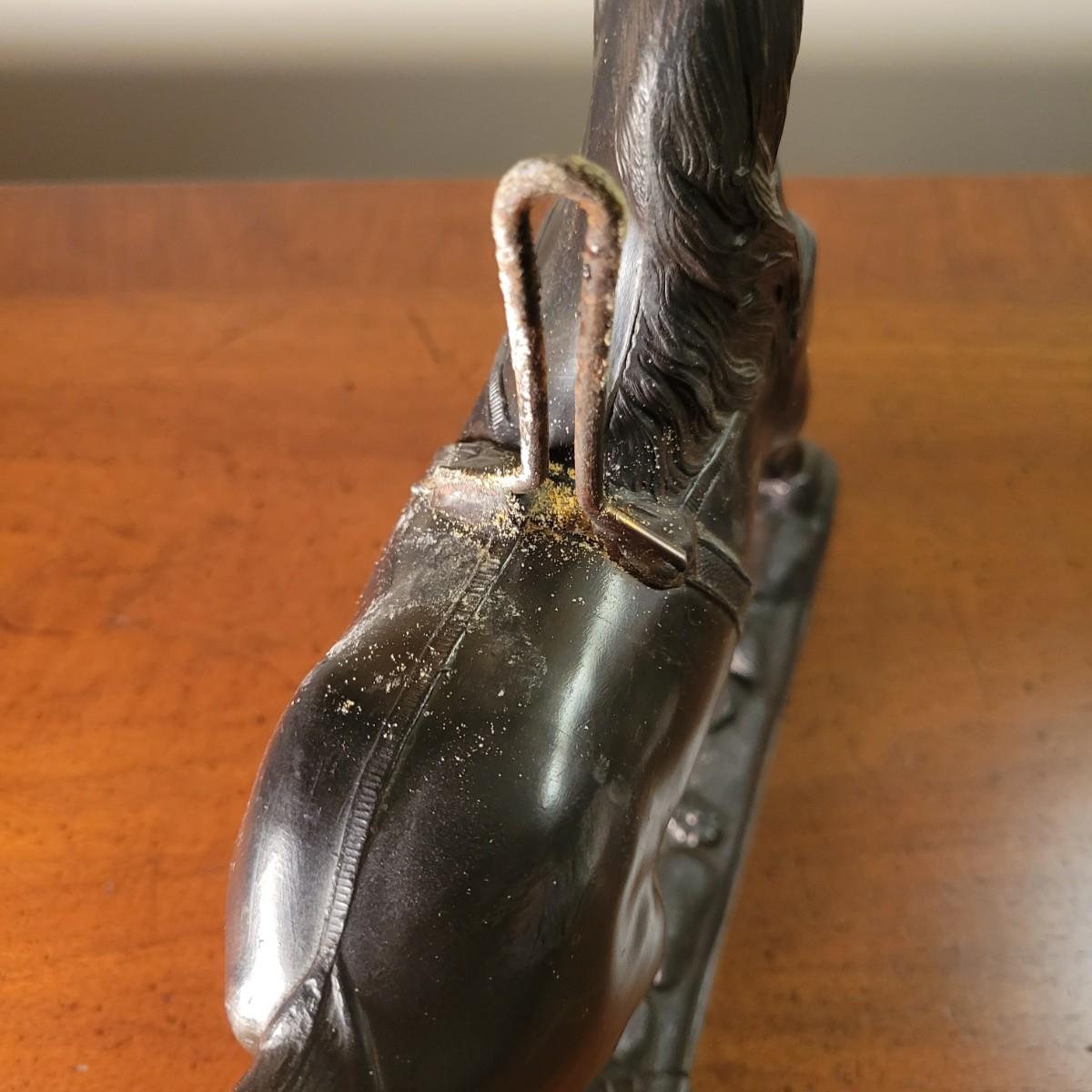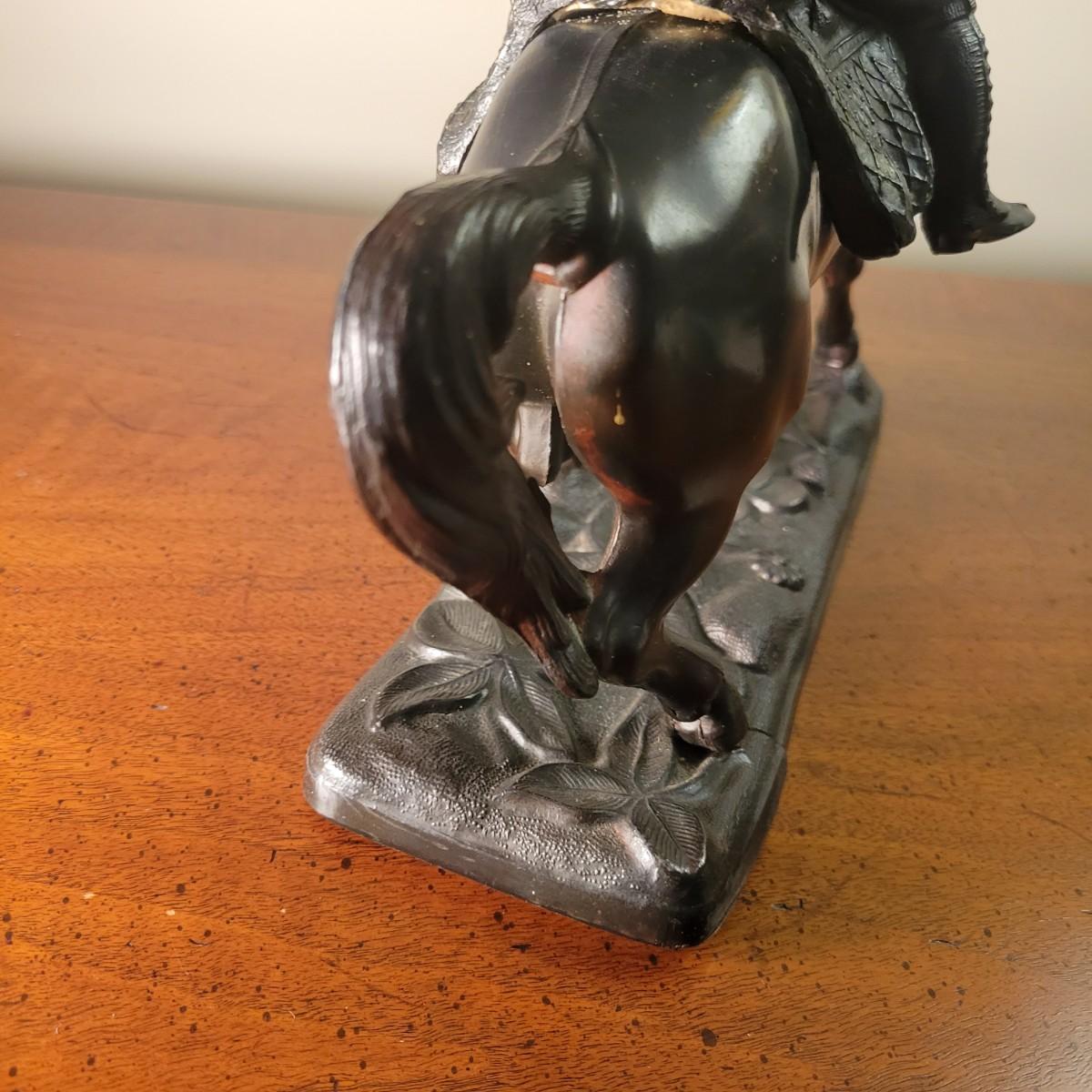 A bronze horse and rider statue in good condition, but it does have a small crack on its base and appears to be missing possibly a sword from the rider. This statue features a prancing horse with a rider that is detachable. Piece measures approximately 9.5" x 3.5" x 9.5". Shipping available