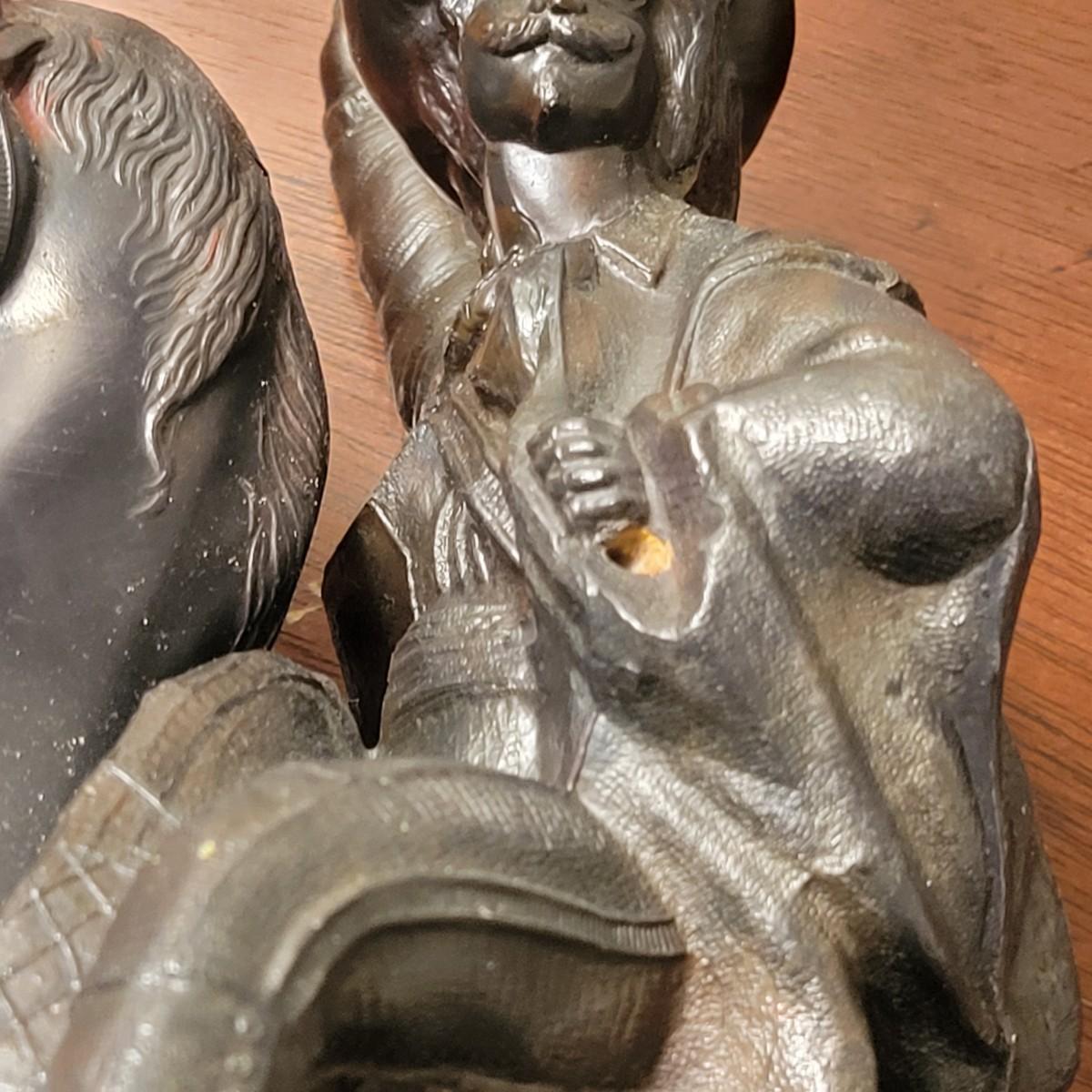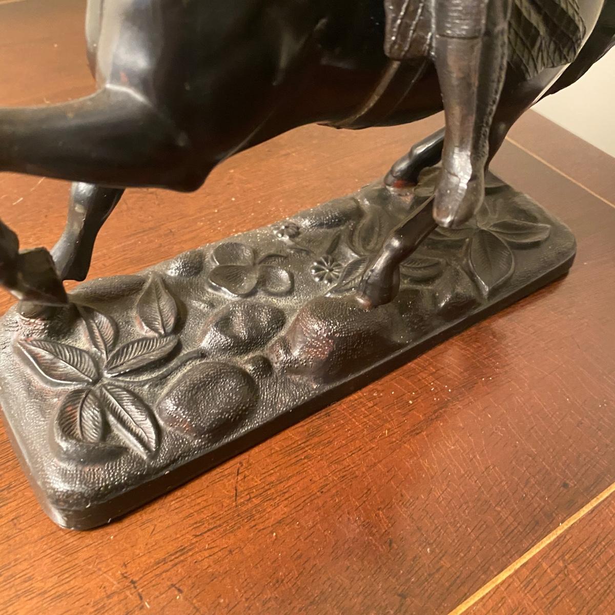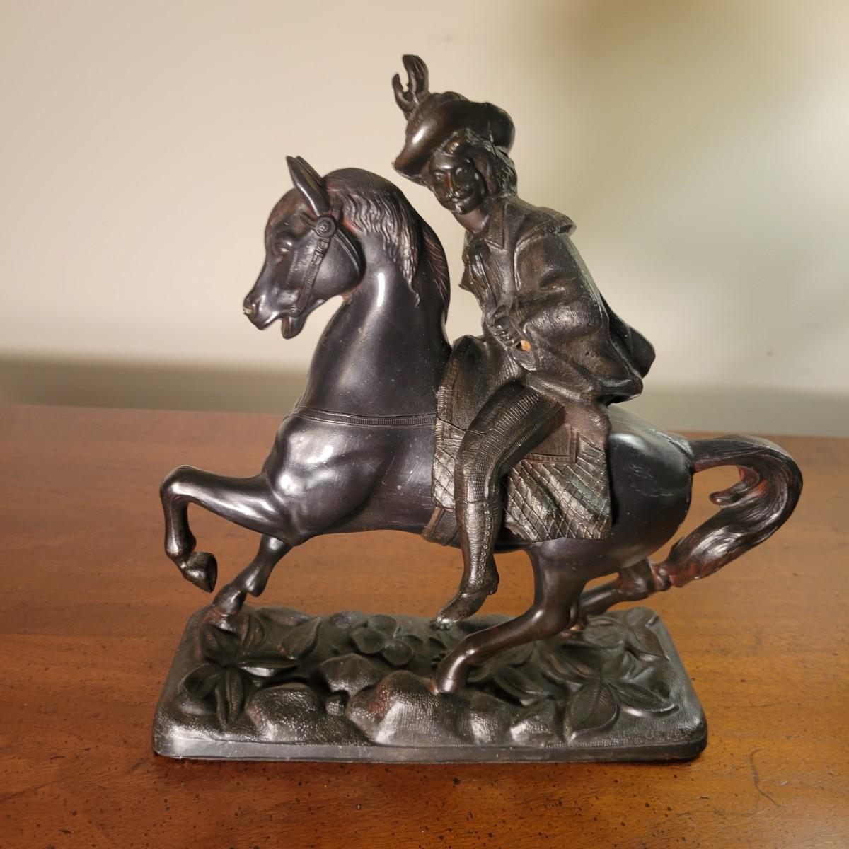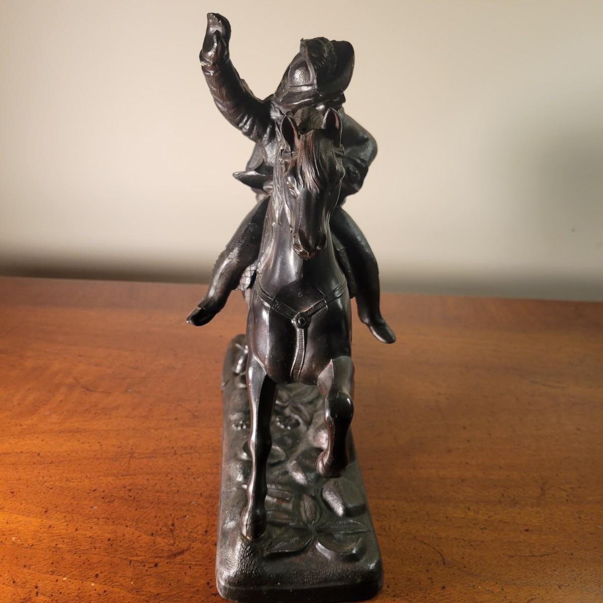 A bronze horse and rider statue in good condition, but it does have a small crack on its base and appears to be missing possibly a sword from the rider. This statue features a prancing horse with a rider that is detachable. Piece measures approximately 9.5" x 3.5" x 9.5". Shipping available