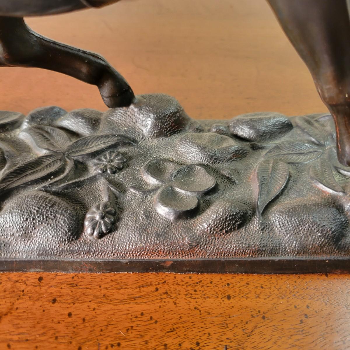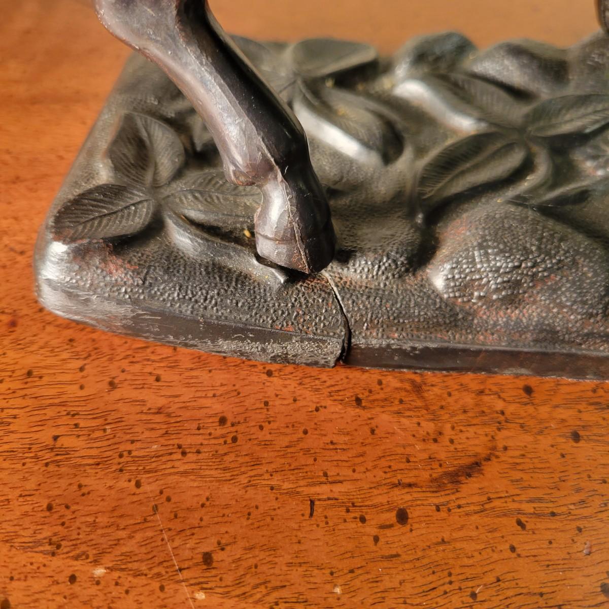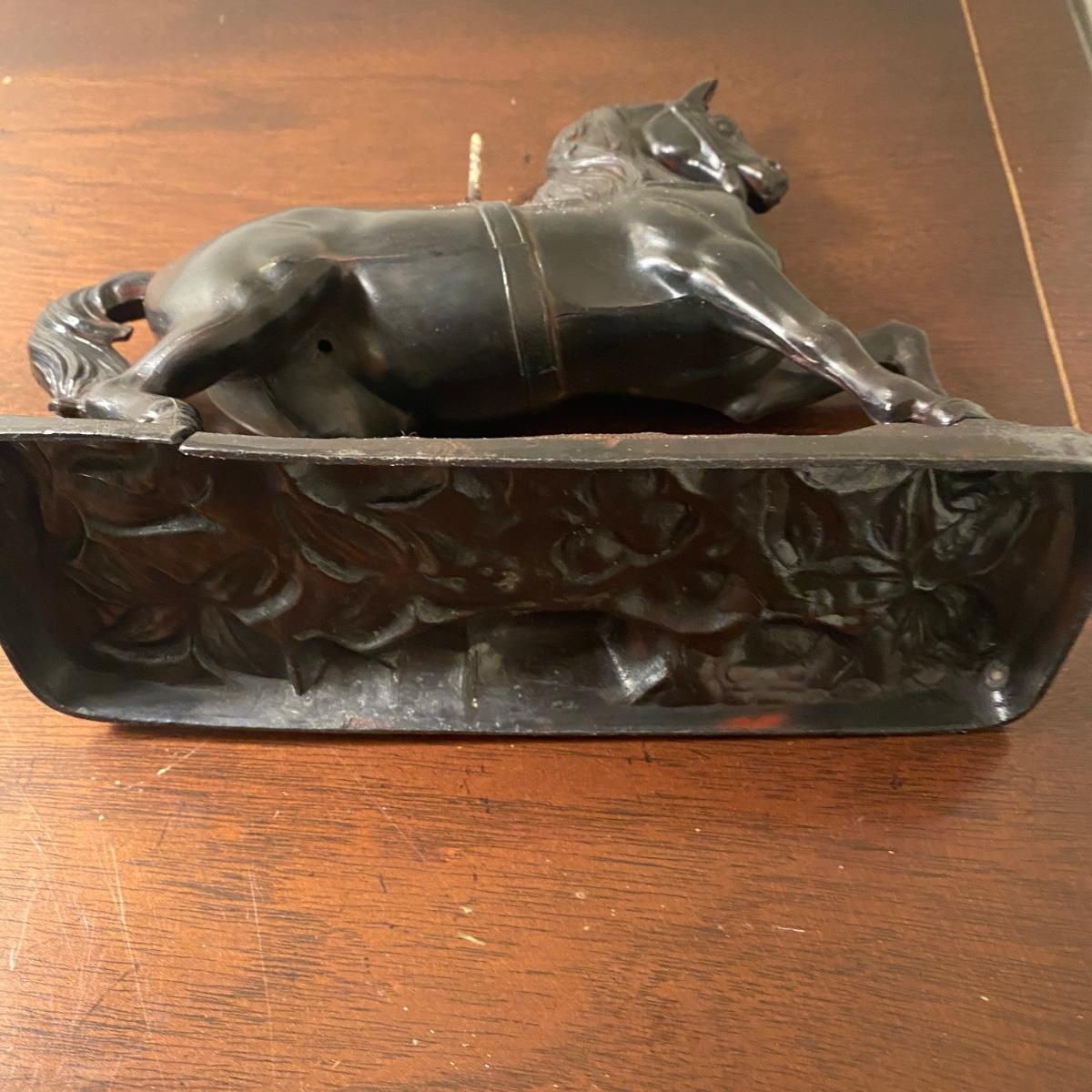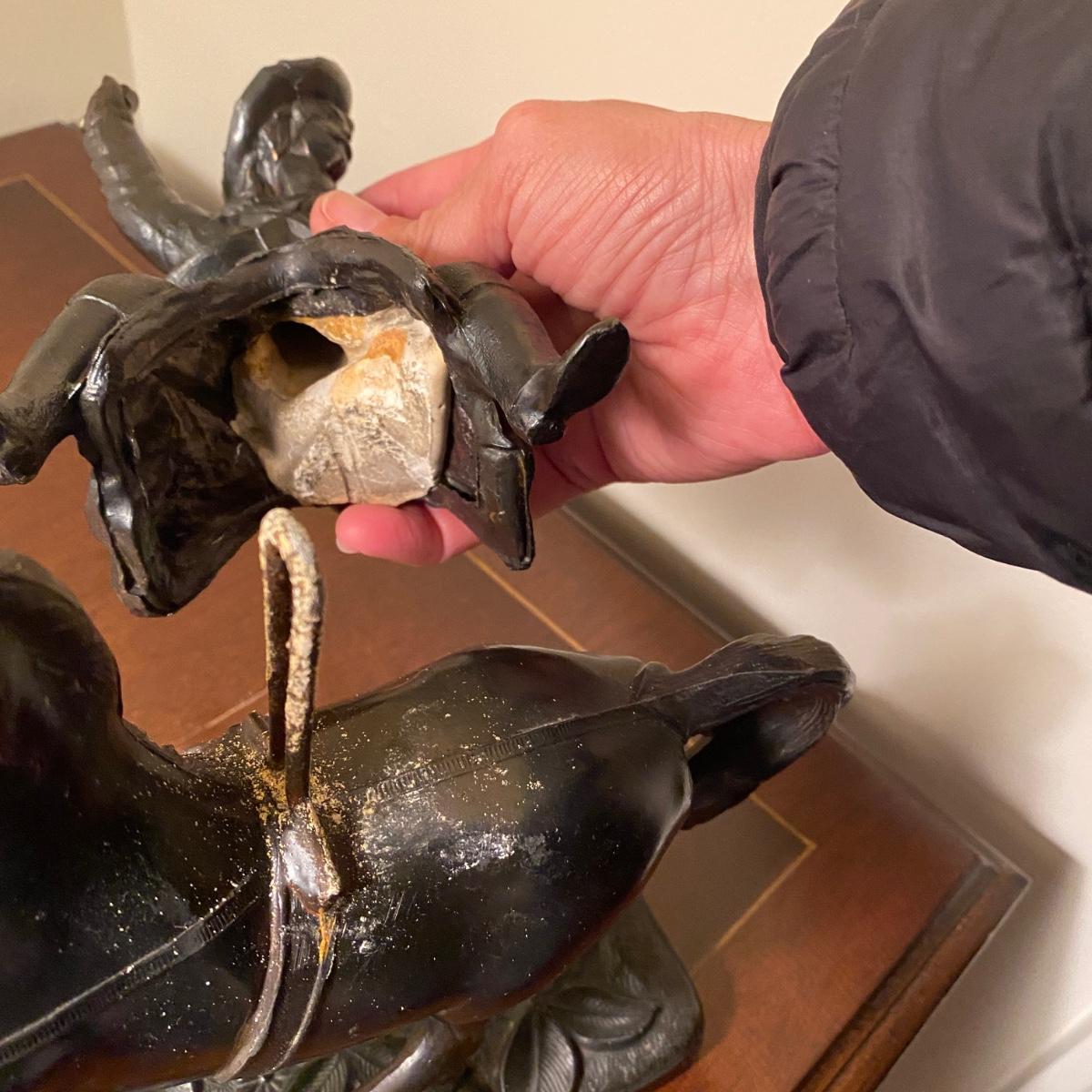 A bronze horse and rider statue in good condition, but it does have a small crack on its base and appears to be missing possibly a sword from the rider. This statue features a prancing horse with a rider that is detachable. Piece measures approximately 9.5" x 3.5" x 9.5". Shipping available