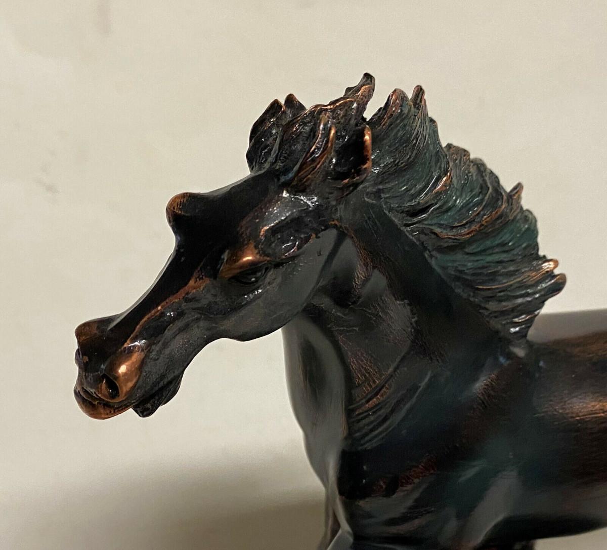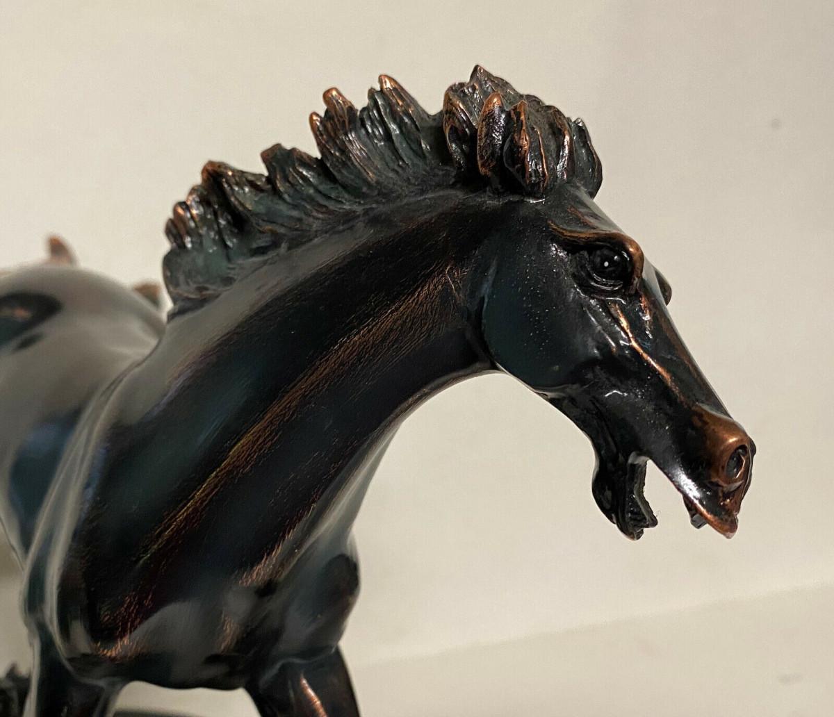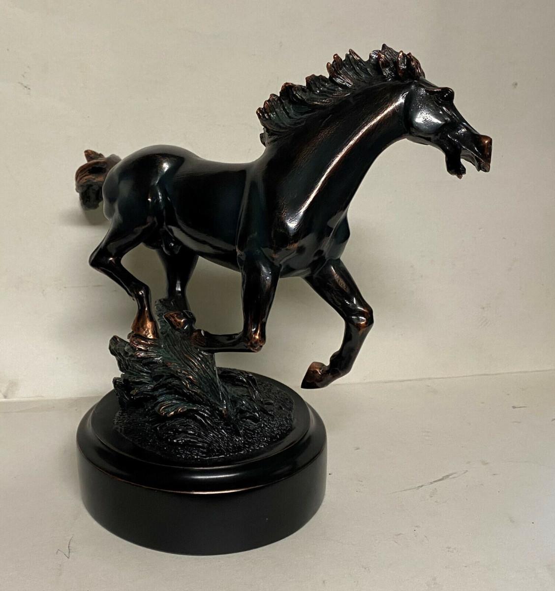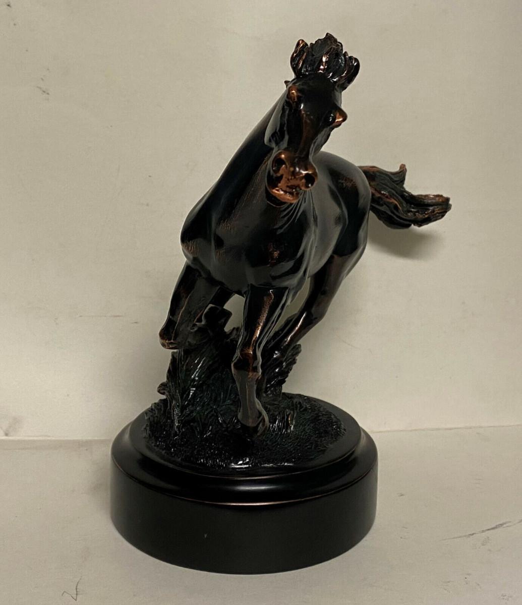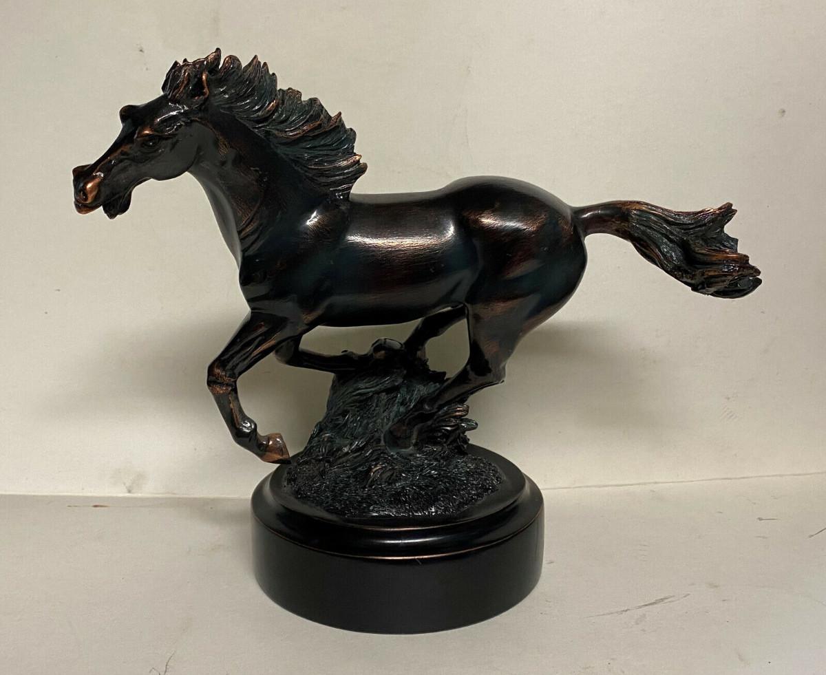 In excellent condition here is a hand-painted polyresin statue of a running Mustang with a true Bronze-effect...Nicely detailed Stallion...Height 8.5"..width 10.5"...This Wild Horse I believe is by the Eurpean Design Studio.