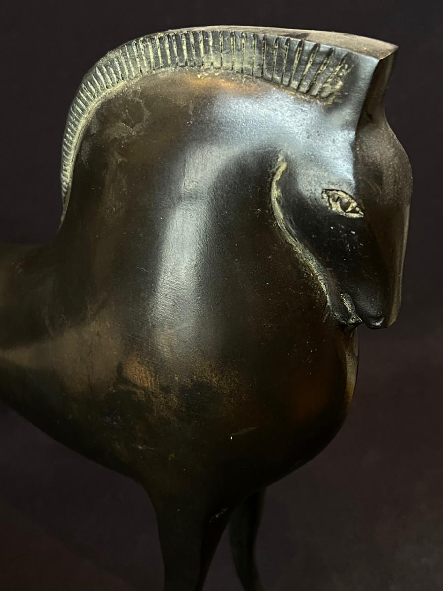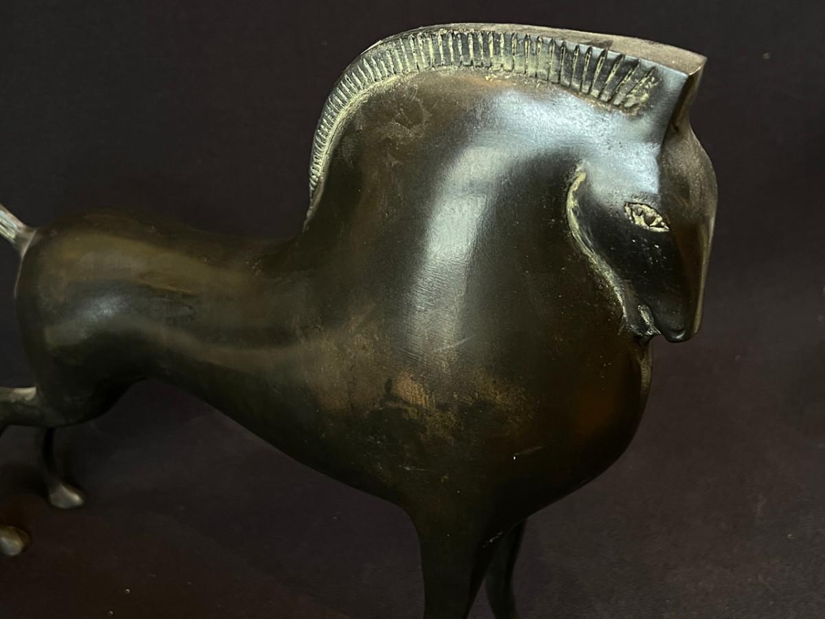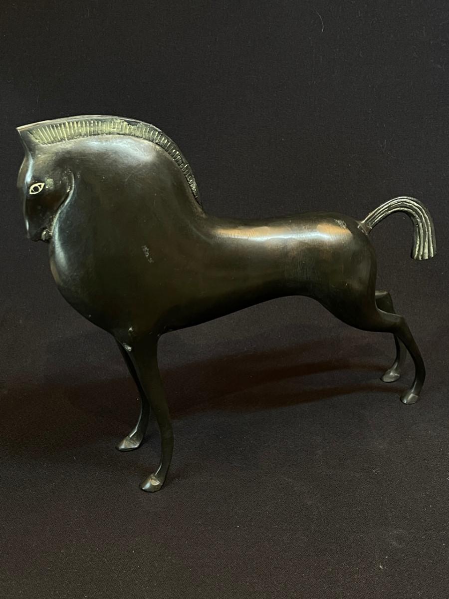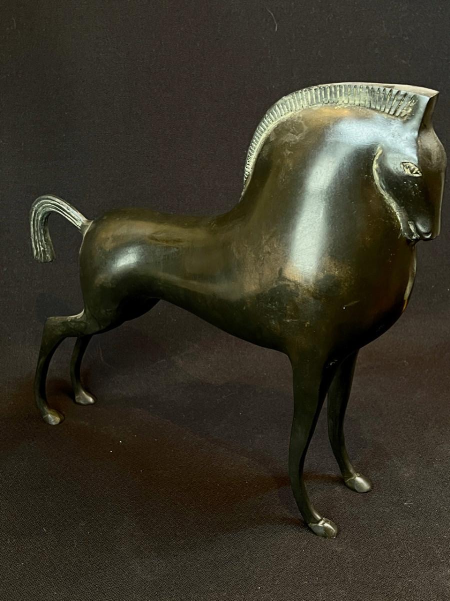 The subject item is a free standing Etruscan-style horse figure with exaggerated chest, tucked chin, and extended tail, standing on slightly elongated, spindly legs. A lightly applied antiqued patina finishes the look