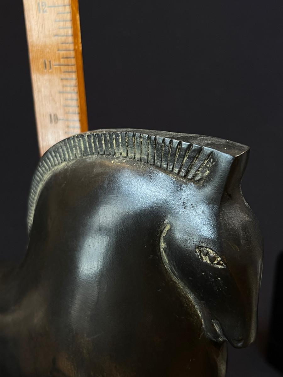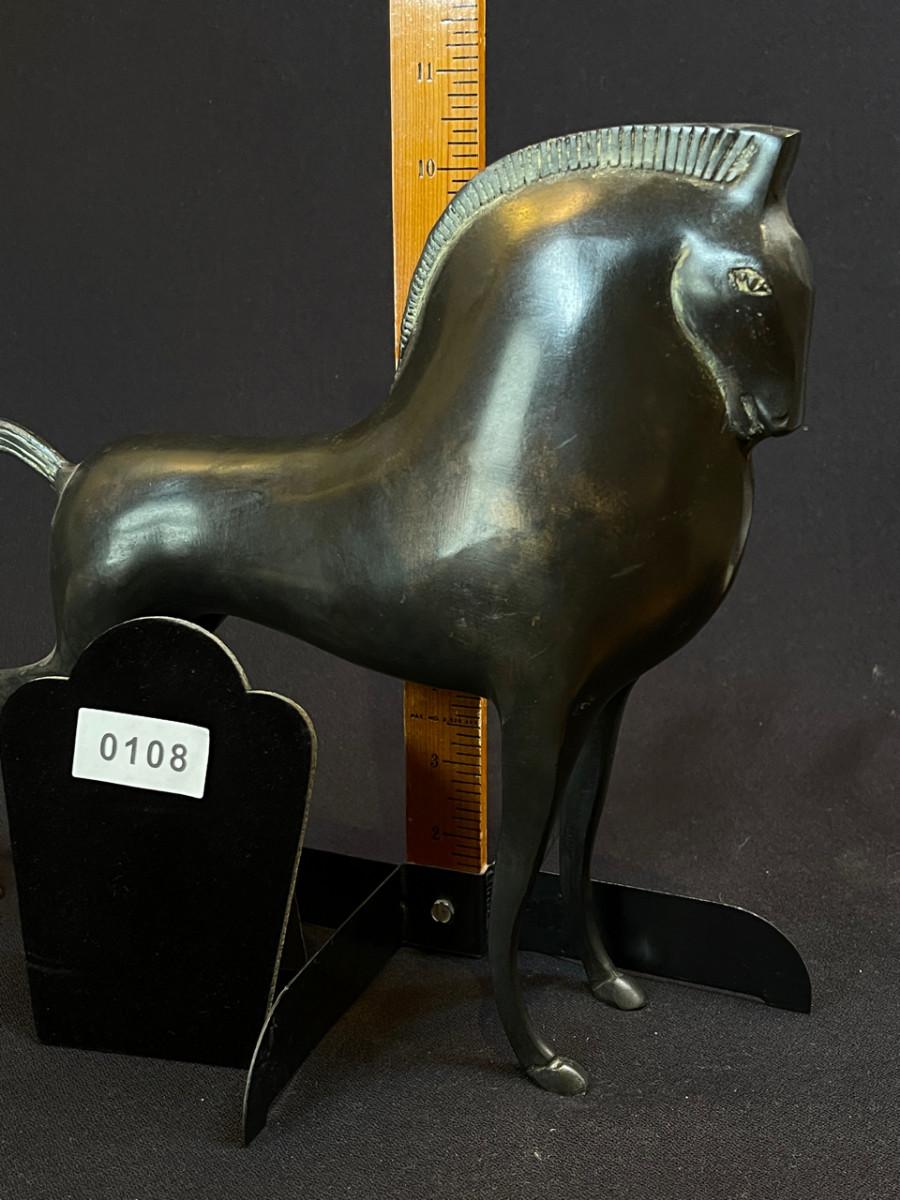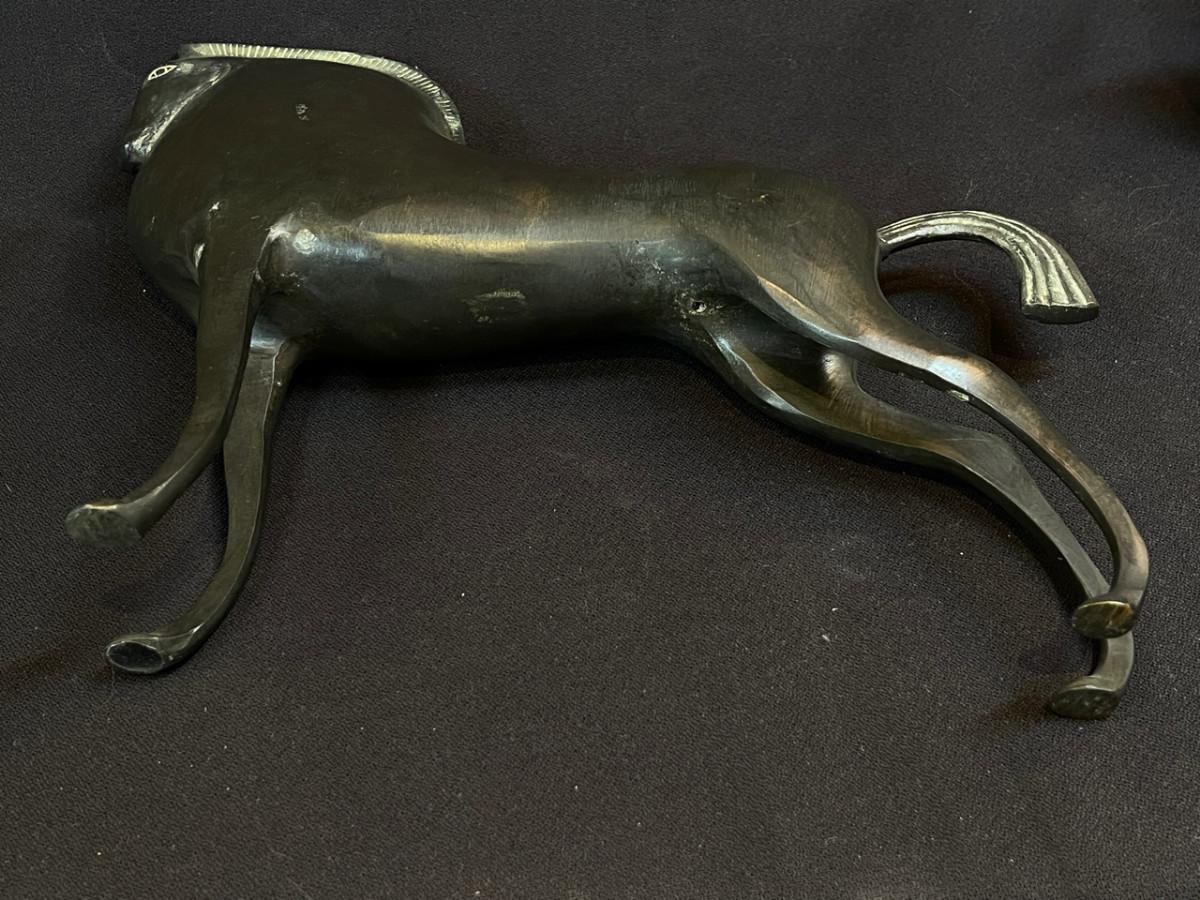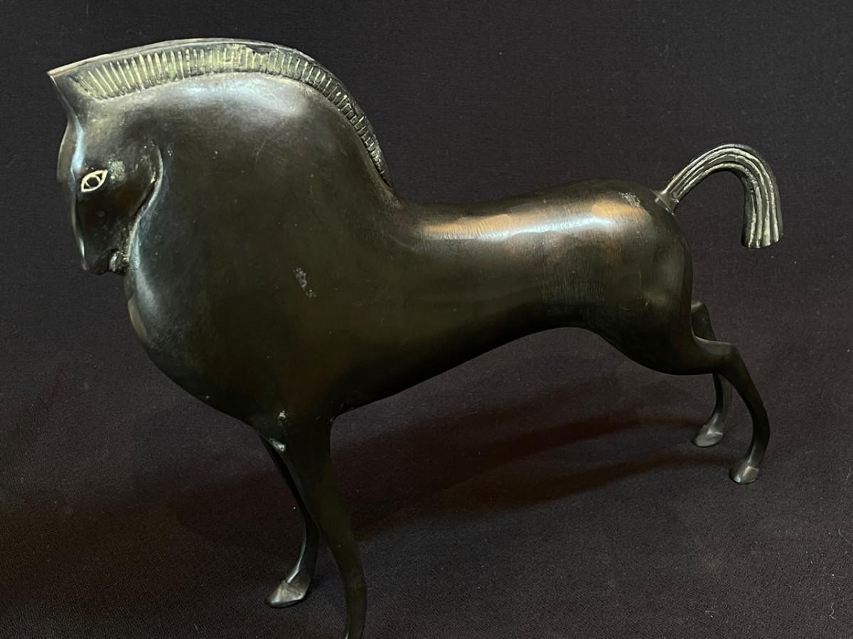 The subject item is a free standing Etruscan-style horse figure with exaggerated chest, tucked chin, and extended tail, standing on slightly elongated, spindly legs. A lightly applied antiqued patina finishes the look