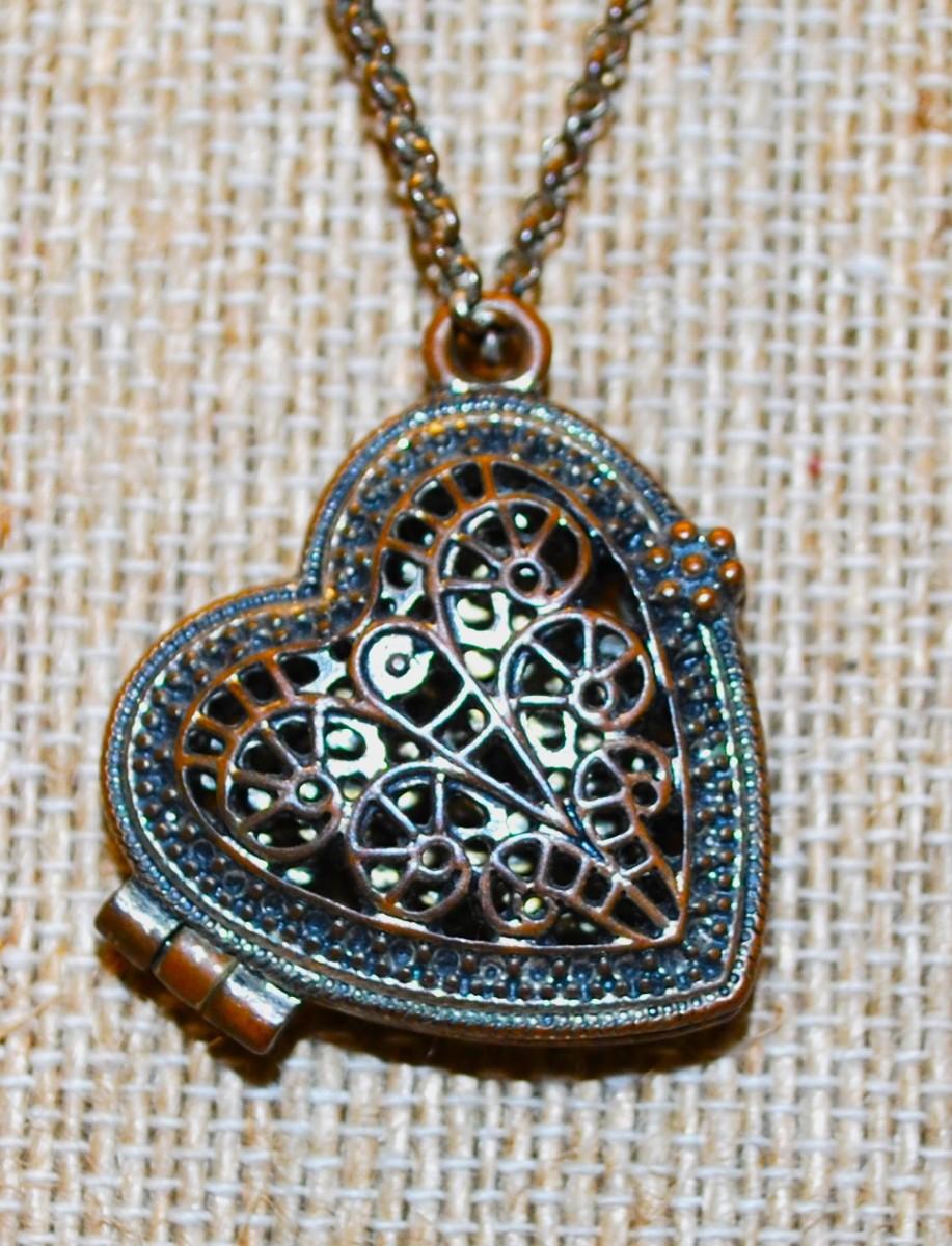 Bronze & Filigree Style Heart Locket Hinged PENDANT (1" x ¾") on a Dark Necklace Chain 20" L