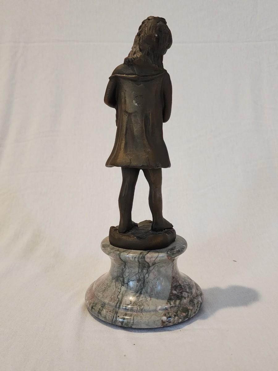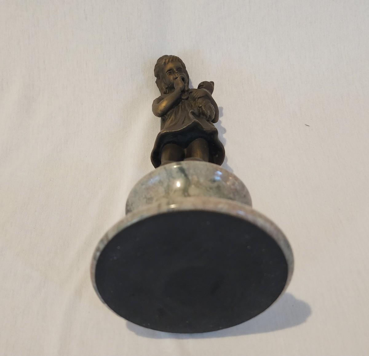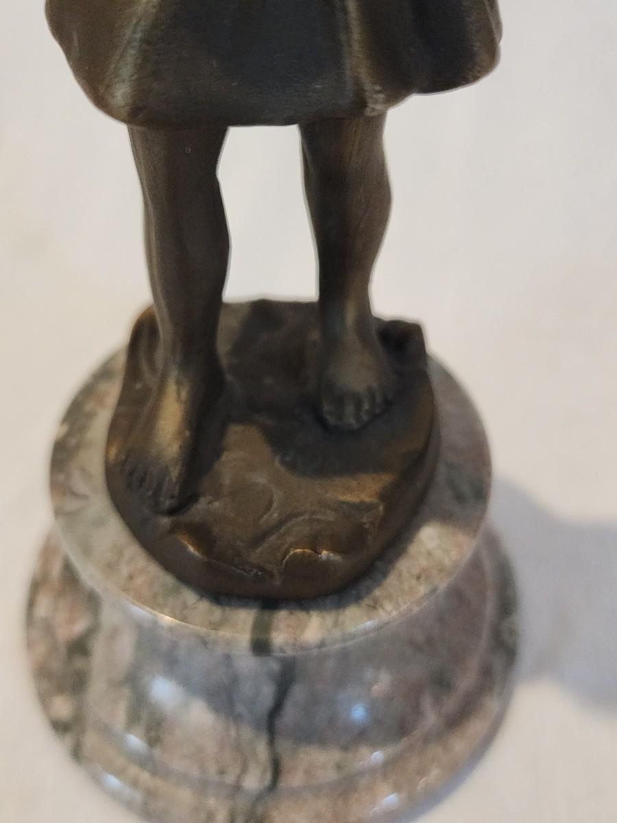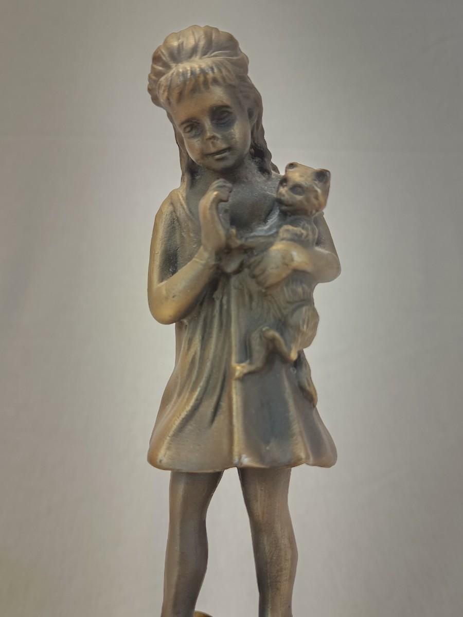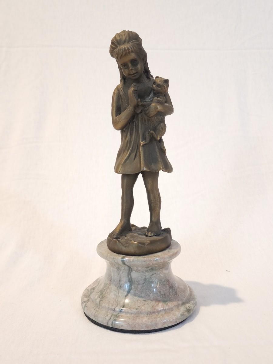 Sweet little bronze girl with cat statue on a gray marble base. Overall height 9". Bronze statue is 7", Marble base is 2".