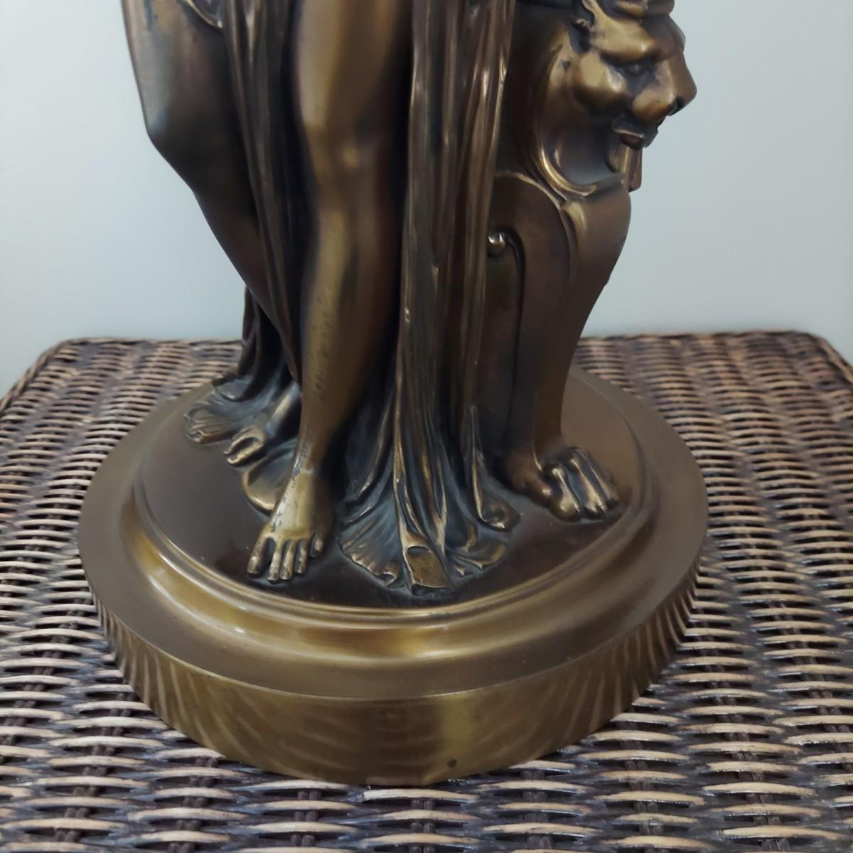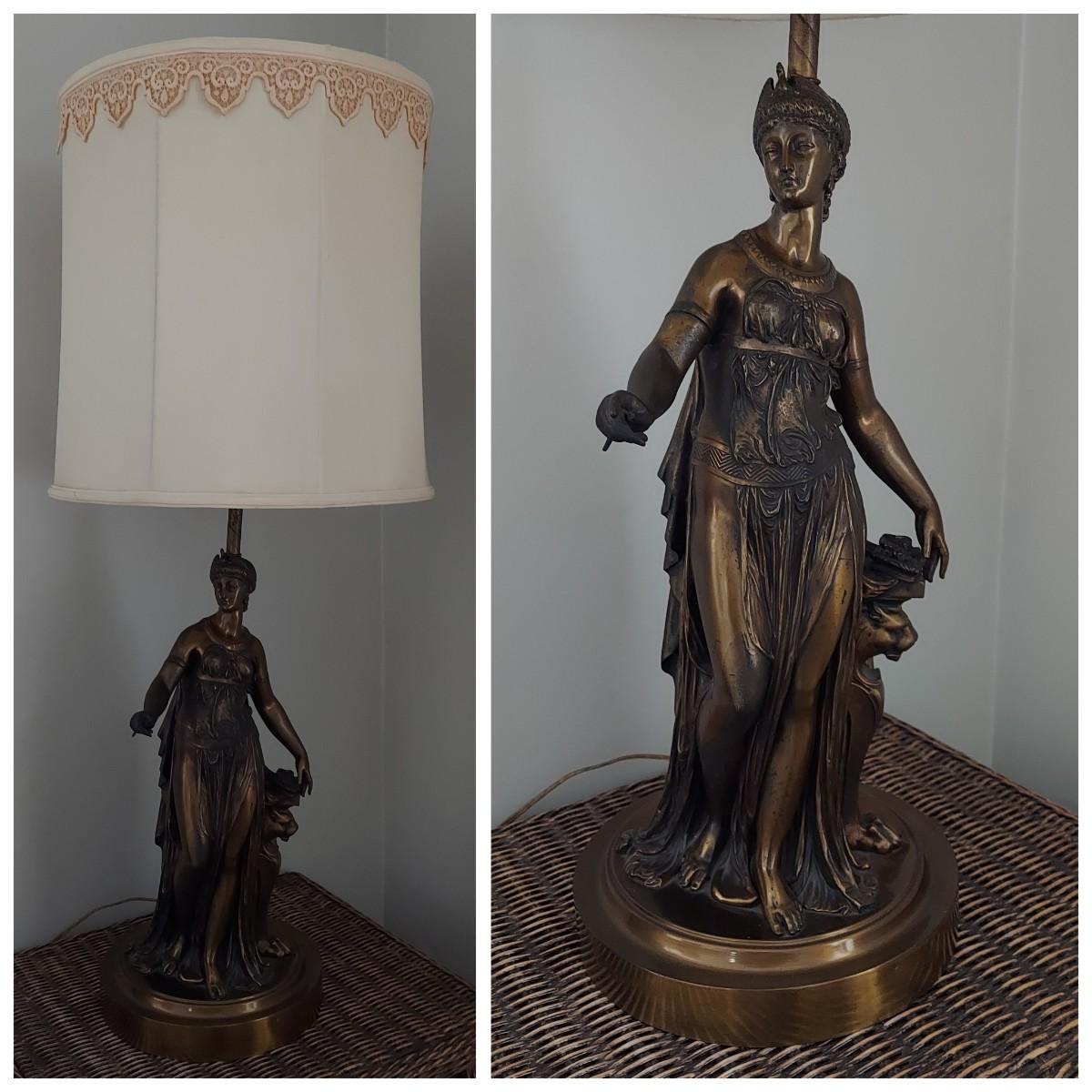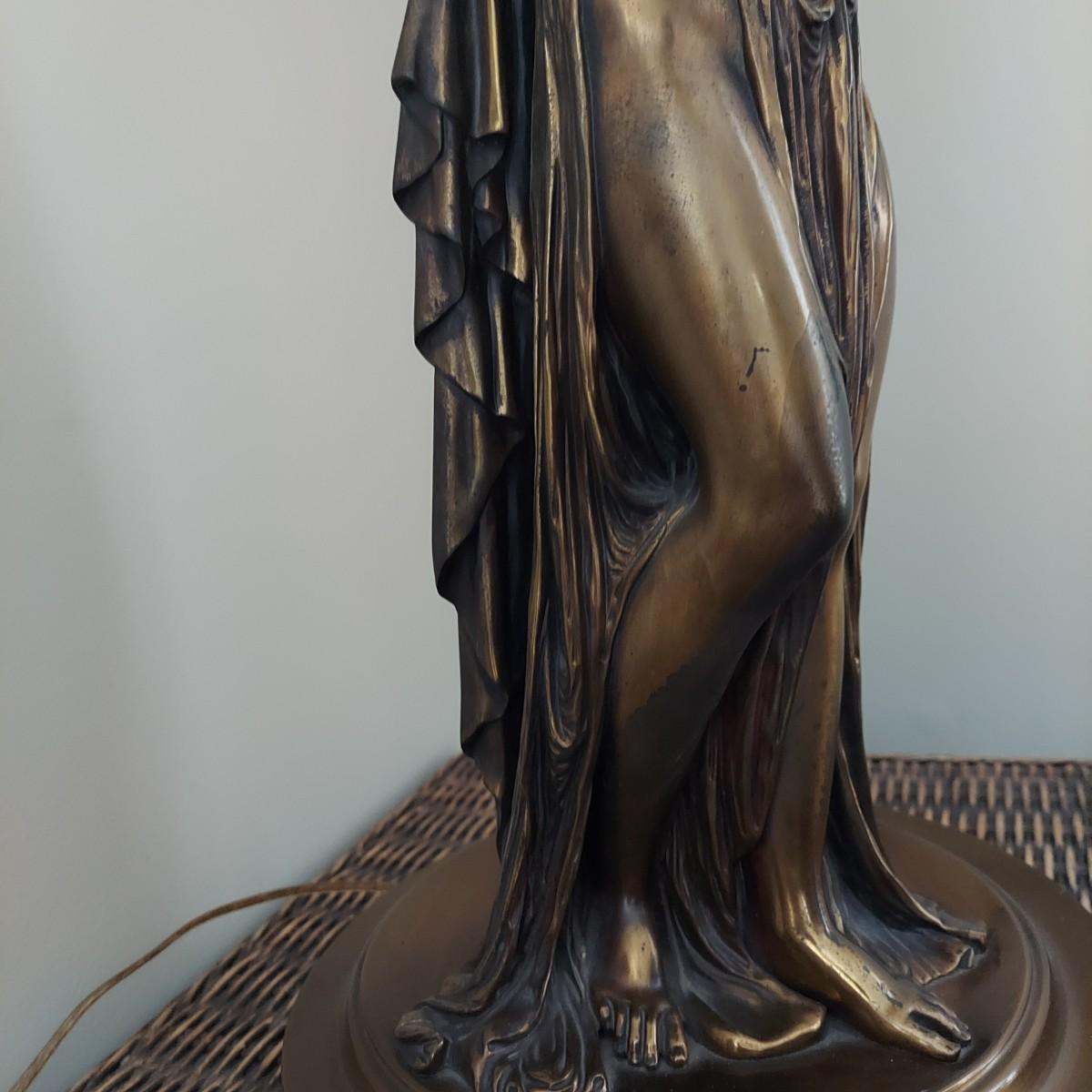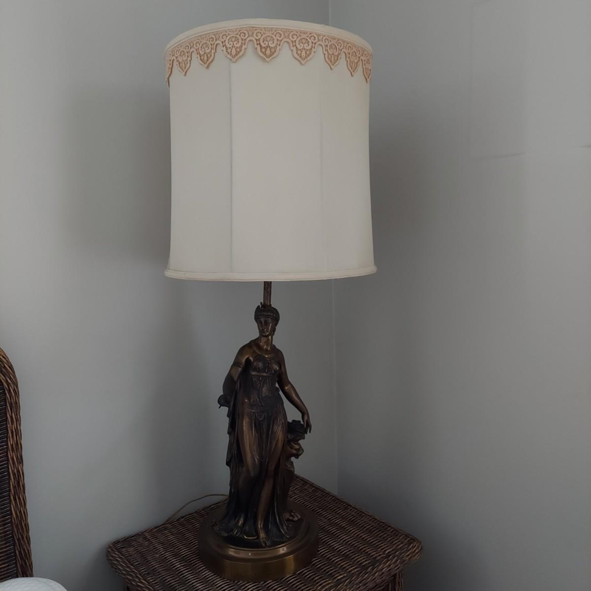 Beautiful lamp that appears to be a bronze figural goddess sculpture with a cloth shade. Lamp measures 10"D x 38"H. Shade measures 15"D across. Has a 3-way switch. Piece is heavy. The base is beginning to come away from the body of the sculpture. It is still securely attached, just a bit loose. Please see photos for details. Shipping available. Shipping certain items can be costly. We suggest contacting our preferred local shipping provider, Postage Express, with dimensions and getting an estimate before bidding: (828) 255-9250 or shipping@postageexpressnc.com