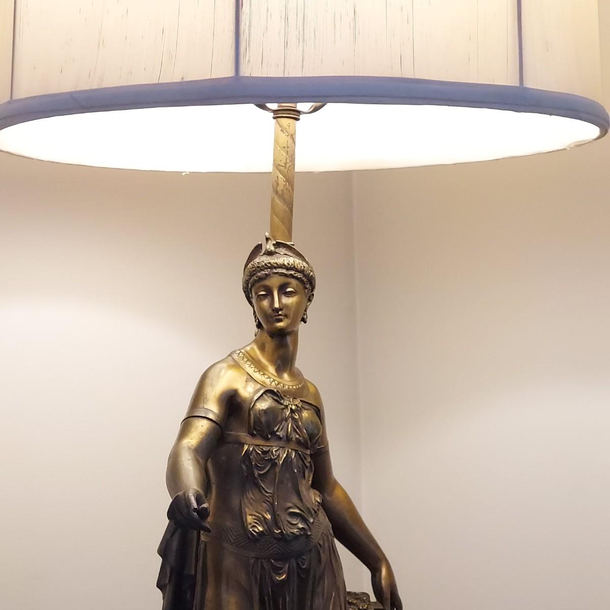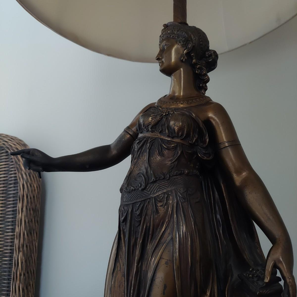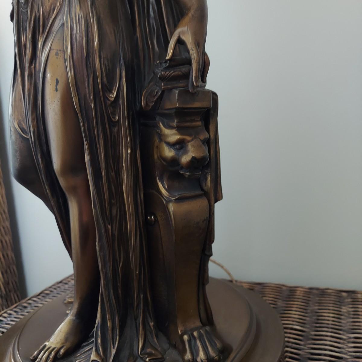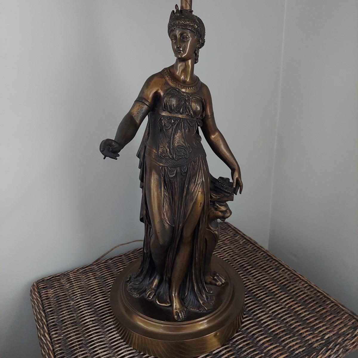 Beautiful lamp that appears to be a bronze figural goddess sculpture with a cloth shade. Lamp measures 10"D x 38"H. Shade measures 15"D across. Has a 3-way switch. Piece is heavy. The base is beginning to come away from the body of the sculpture. It is still securely attached, just a bit loose. Please see photos for details. Shipping available. Shipping certain items can be costly. We suggest contacting our preferred local shipping provider, Postage Express, with dimensions and getting an estimate before bidding: (828) 255-9250 or shipping@postageexpressnc.com