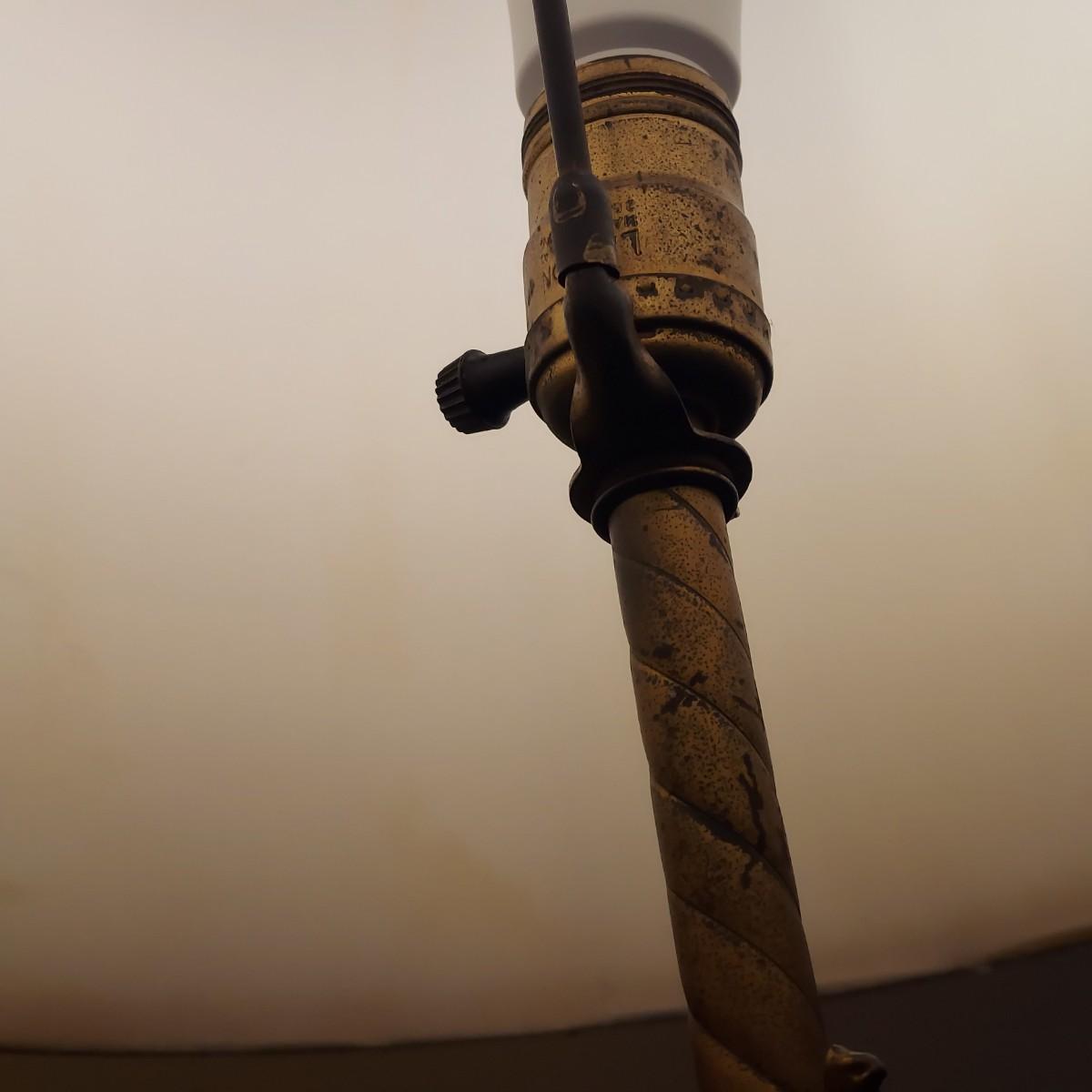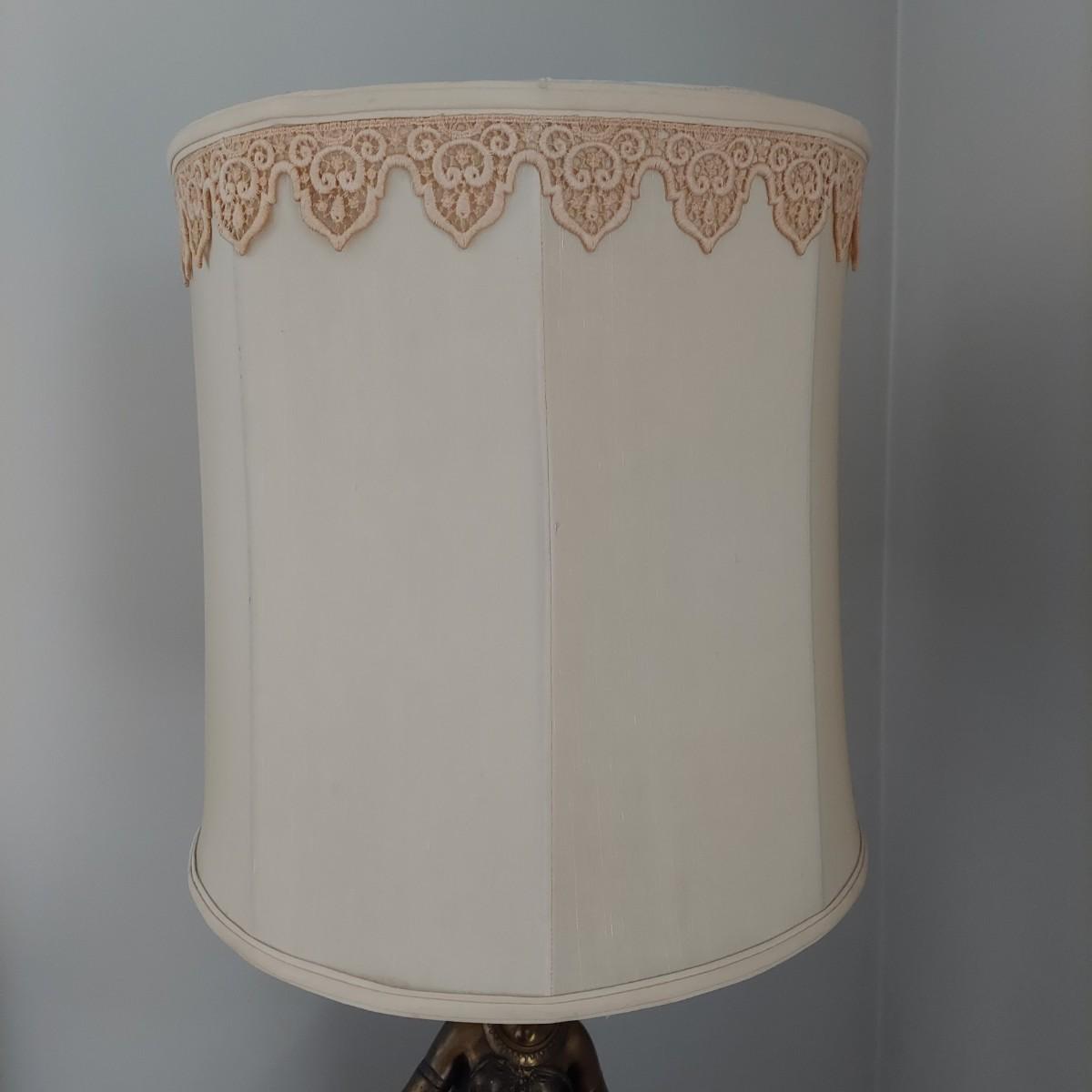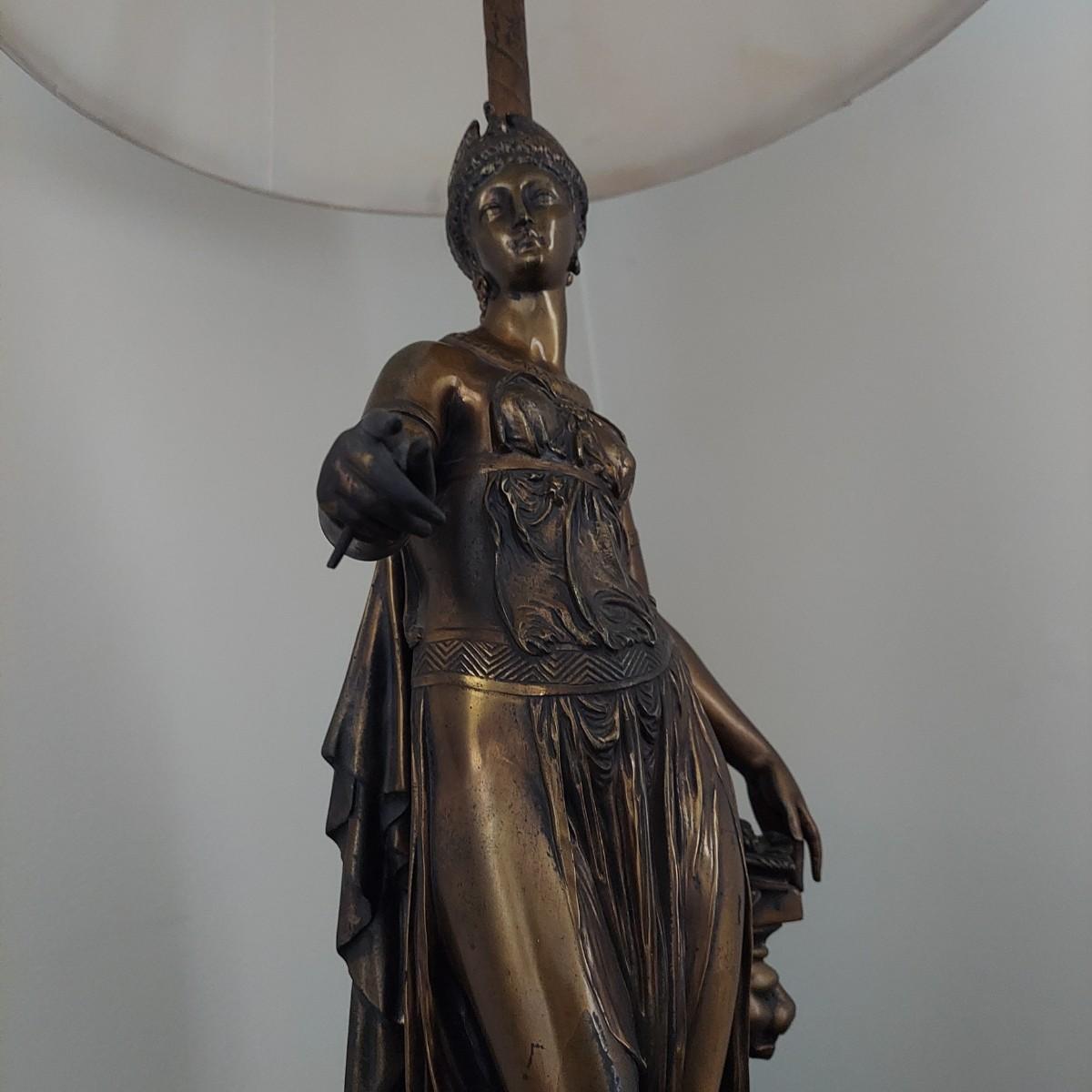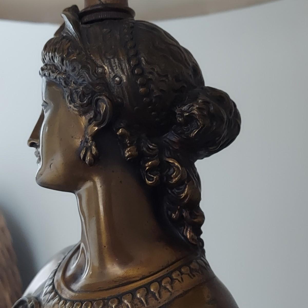 Beautiful lamp that appears to be a bronze figural goddess sculpture with a cloth shade. Lamp measures 10"D x 38"H. Shade measures 15"D across. Has a 3-way switch. Piece is heavy. The base is beginning to come away from the body of the sculpture. It is still securely attached, just a bit loose. Please see photos for details. Shipping available. Shipping certain items can be costly. We suggest contacting our preferred local shipping provider, Postage Express, with dimensions and getting an estimate before bidding: (828) 255-9250 or shipping@postageexpressnc.com