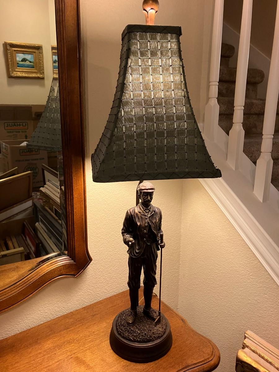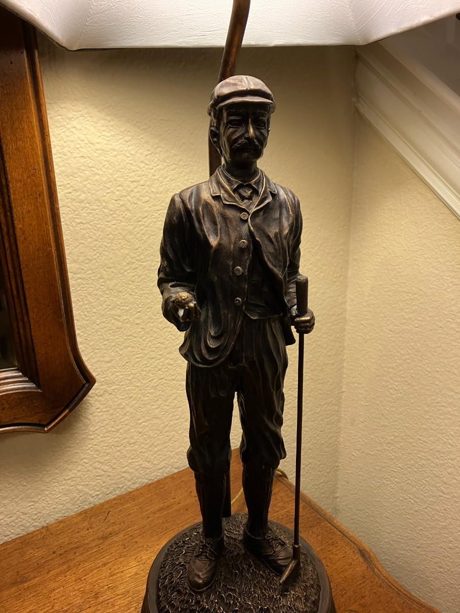 Unique vintage Bombay Company bronze statue of a golfer turned into a functional lamp with black shade. 32" H