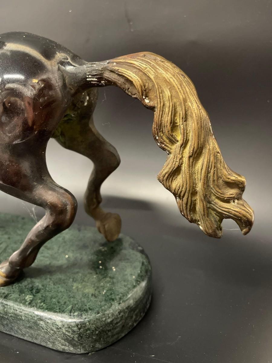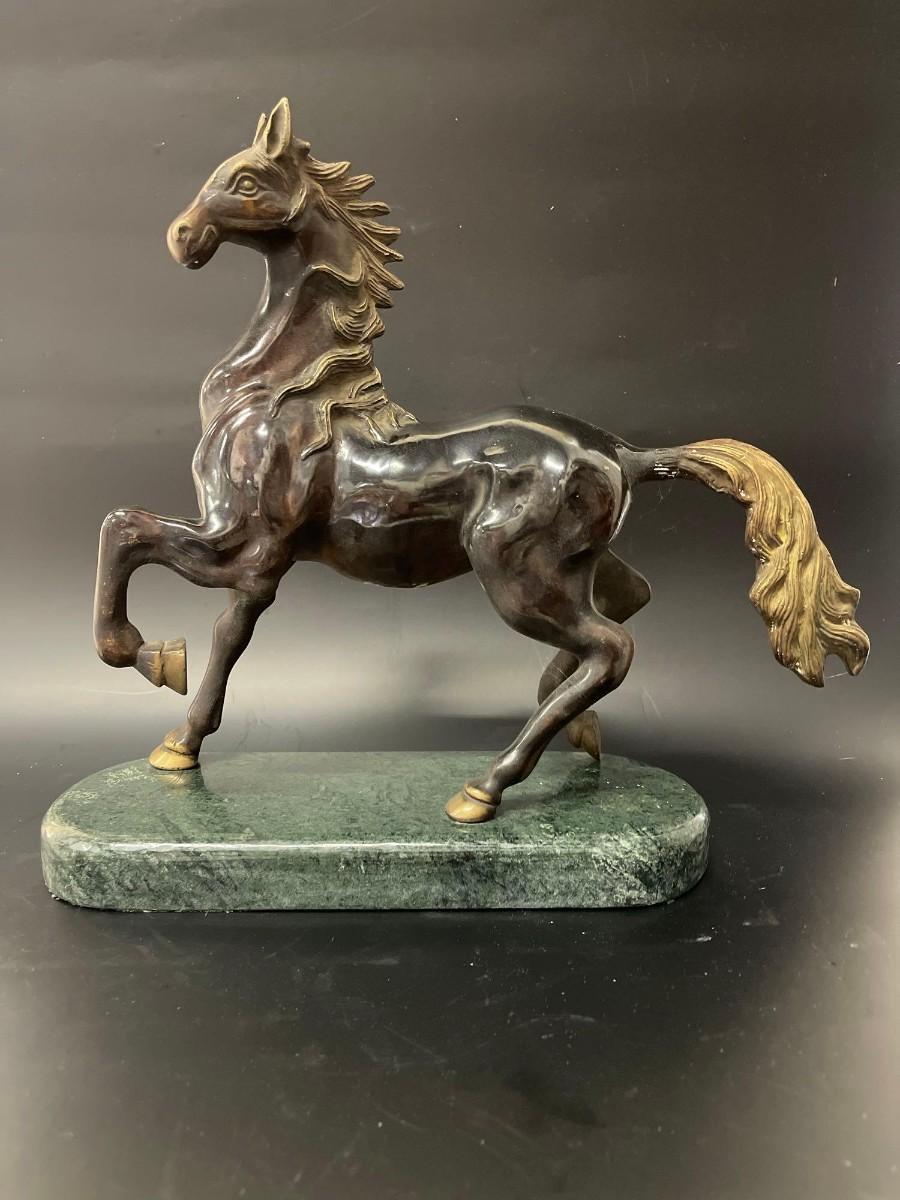 <p>Bronze Horse Sculpture on Marble Base. 13” high x 14” wide. Very good condition. Minor chipping on the rear of the base. </p>