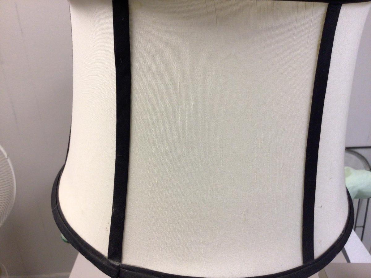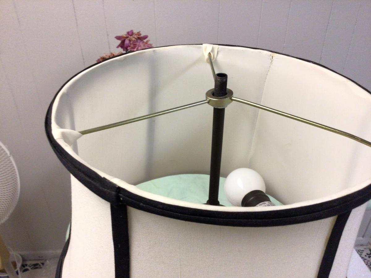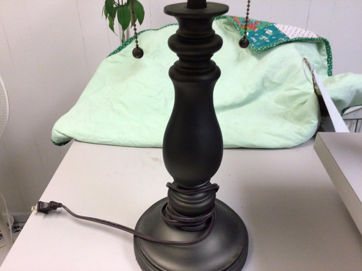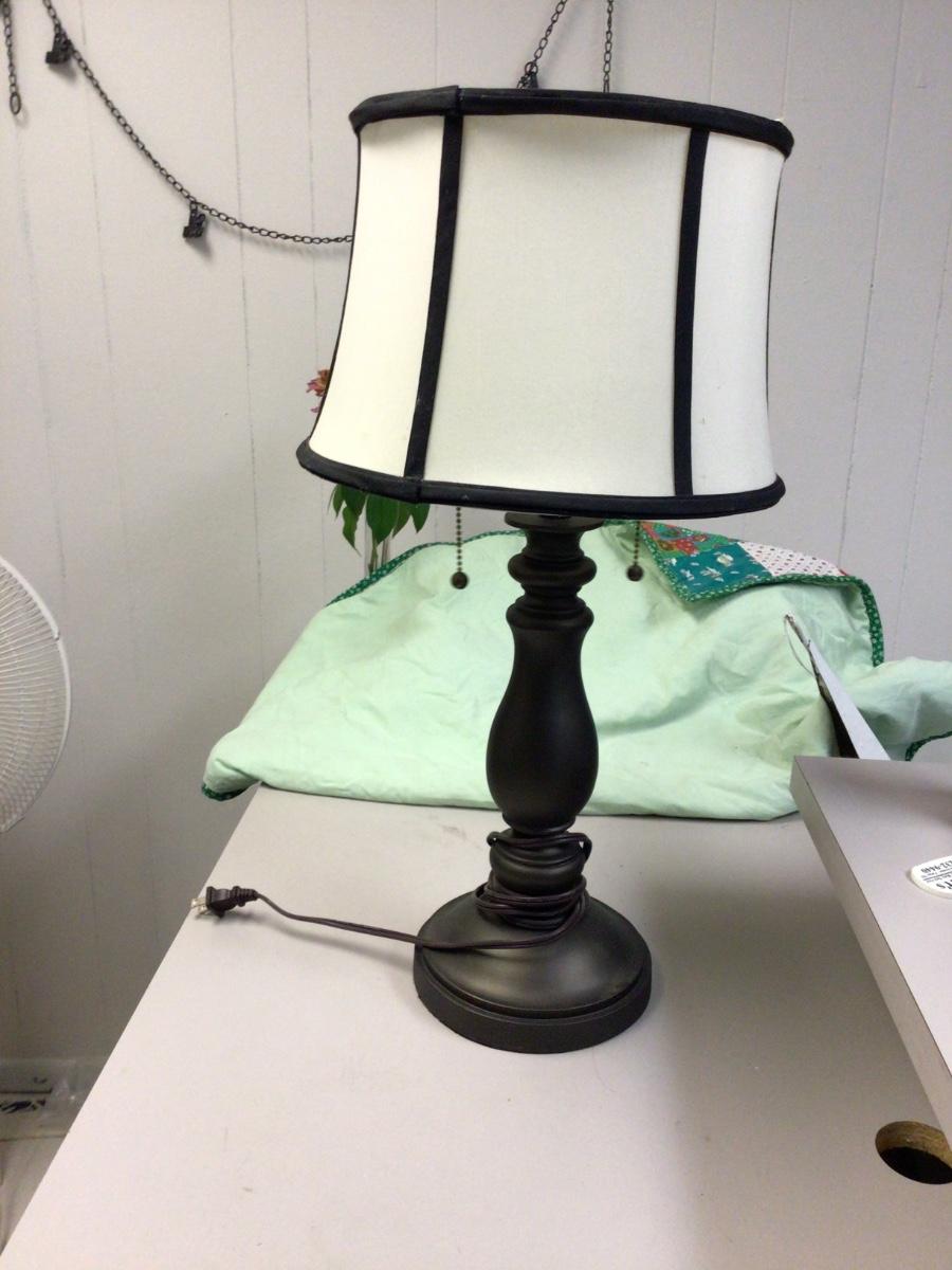 This is a great bronze lamp with two light and two pulls. It has a great white and black lamp shade.