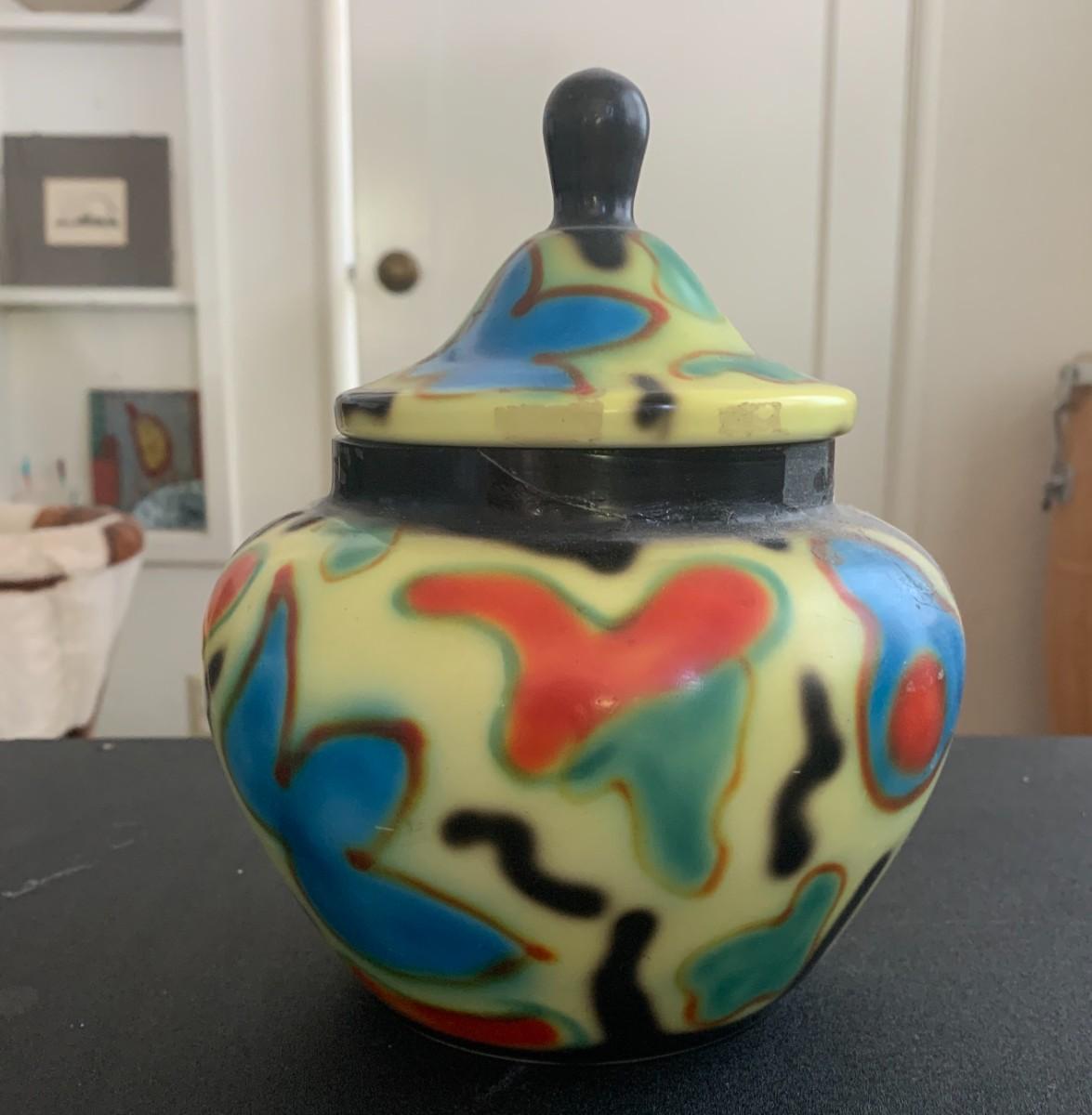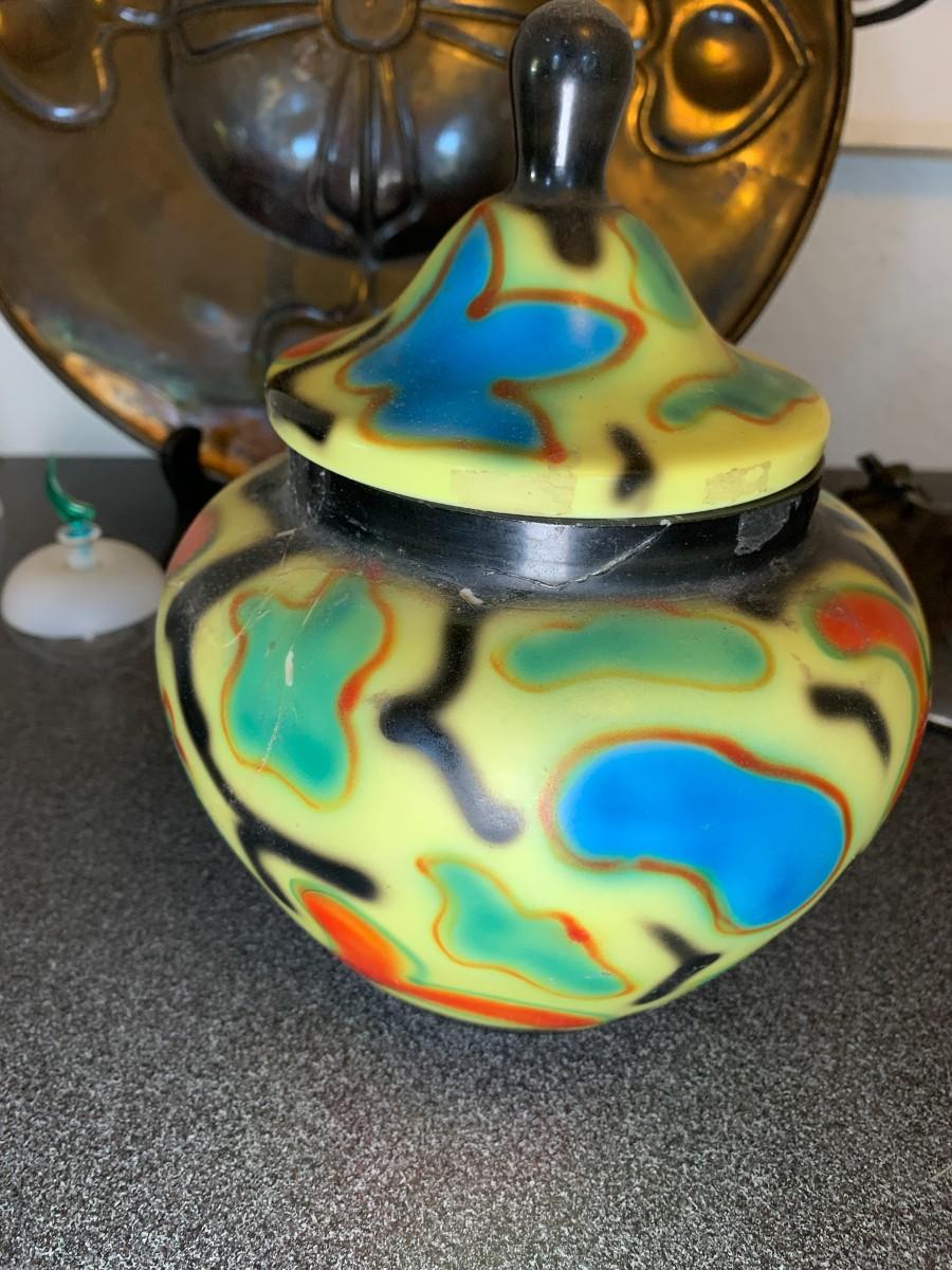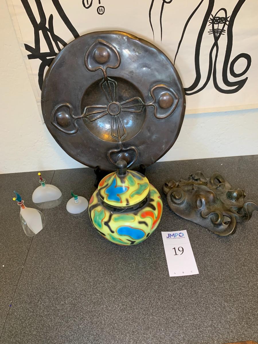 Painted glass bowl with lid 7.5", repaired. Bronze octopus 7x10". 3 art glass bottles with stoppers, tallest is 5". Dark metal decorative plate with damage on back