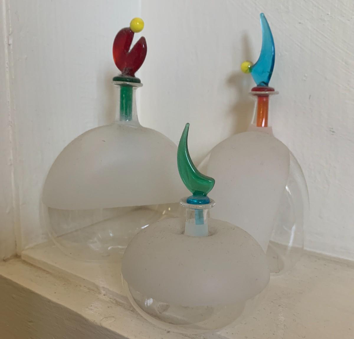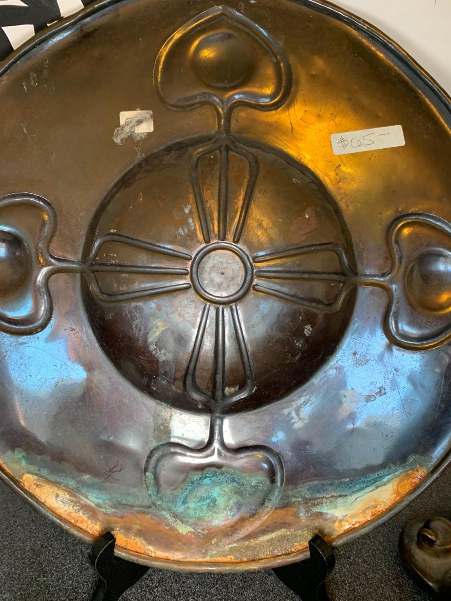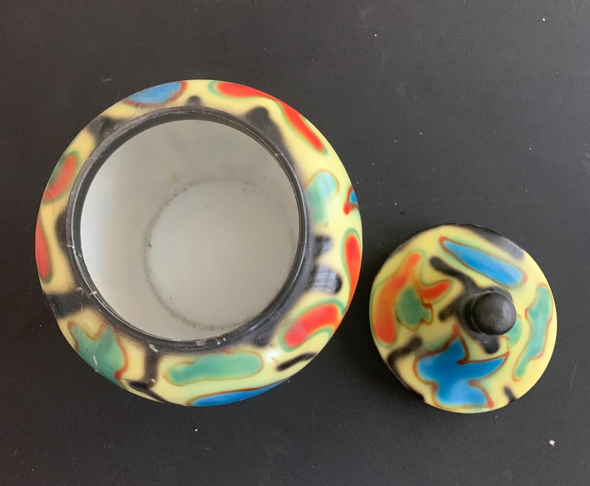 Painted glass bowl with lid 7.5", repaired. Bronze octopus 7x10". 3 art glass bottles with stoppers, tallest is 5". Dark metal decorative plate with damage on back