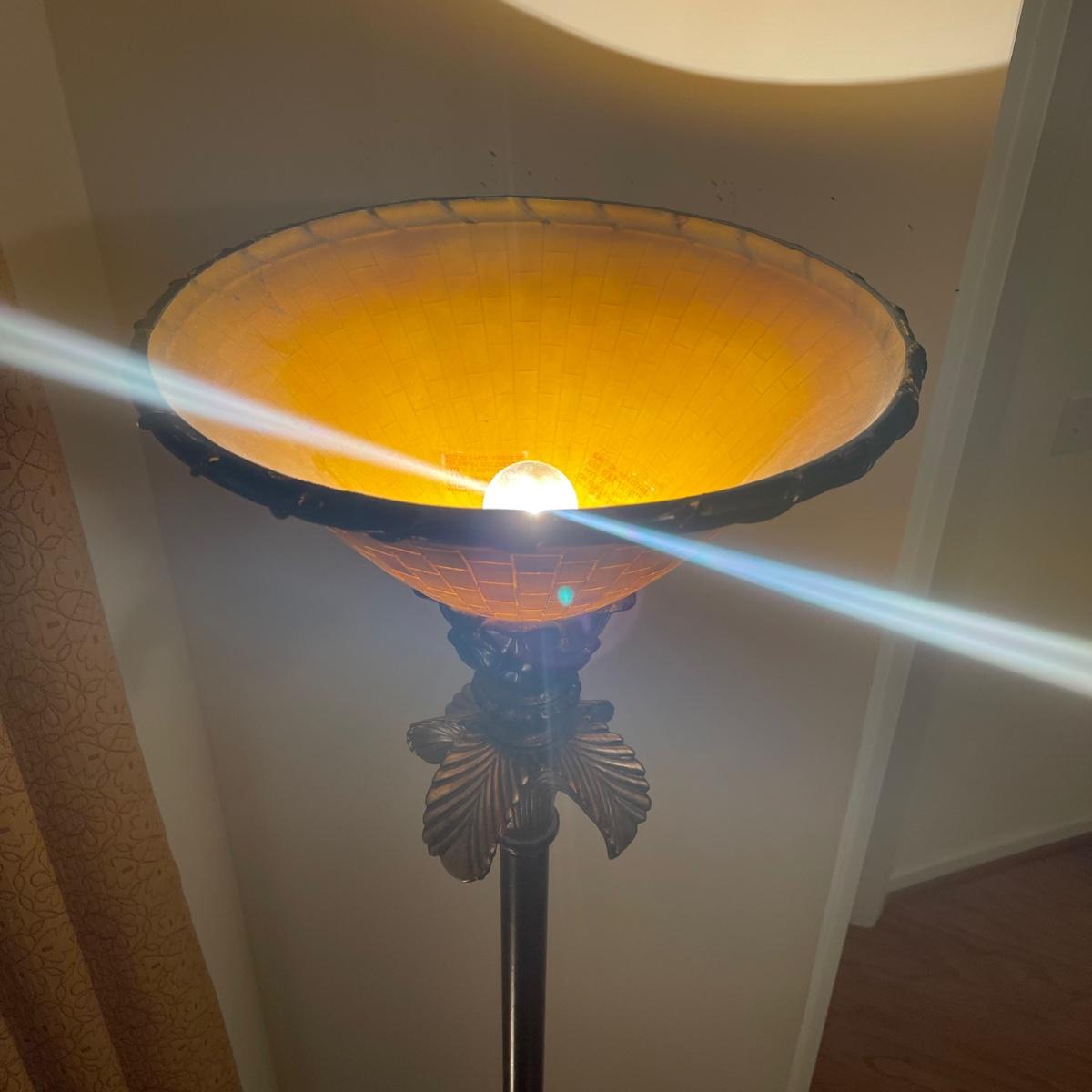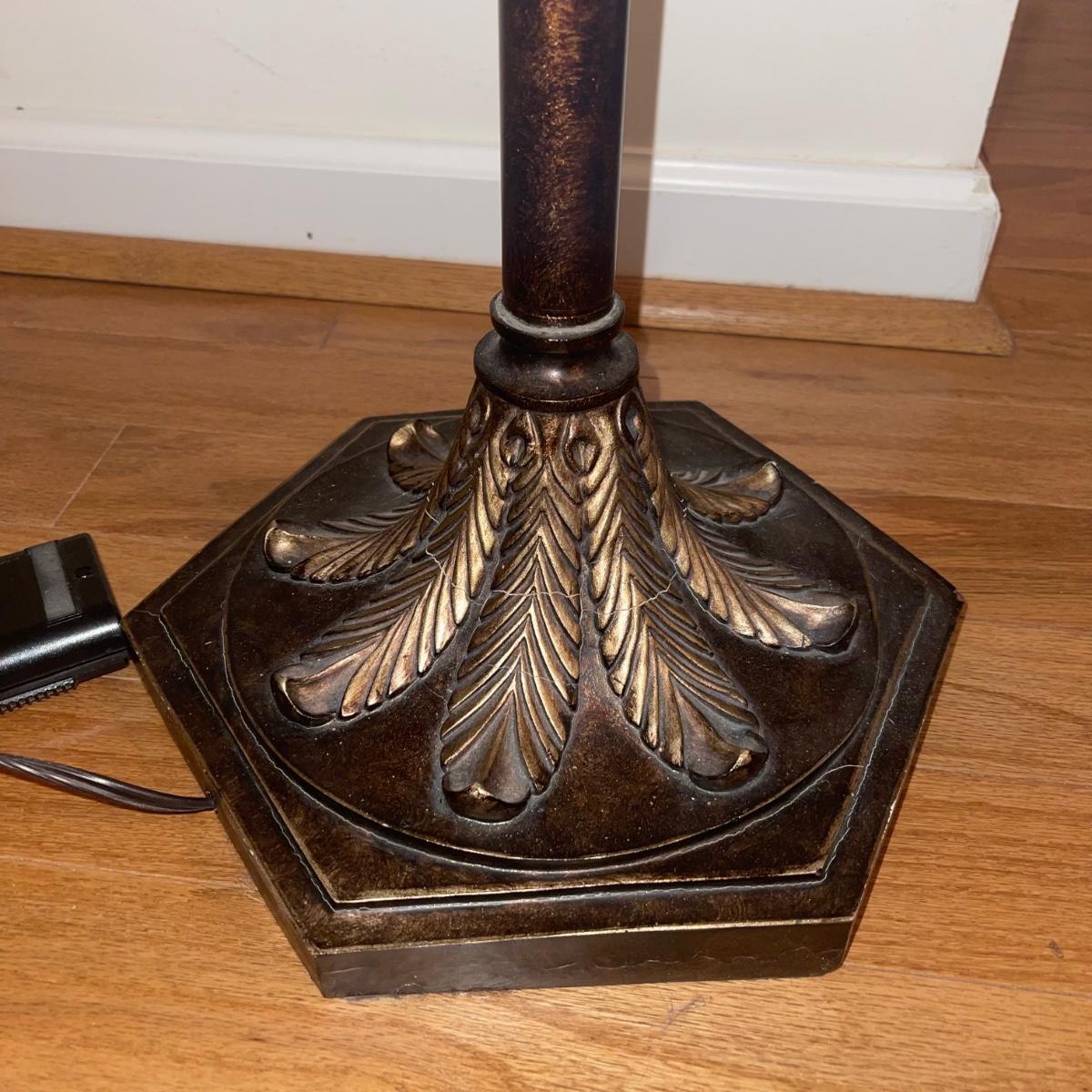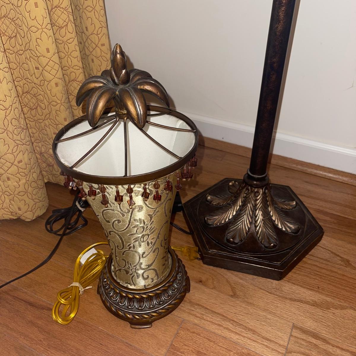 Table and floor lamps with palmetto leaf designs and bronze colored bases. Both lamps turned on when plugged in, the floor lamp has a dimmer on its cord. The table lamp is about 17.5” tall and the floor lamp is about 71.5”.