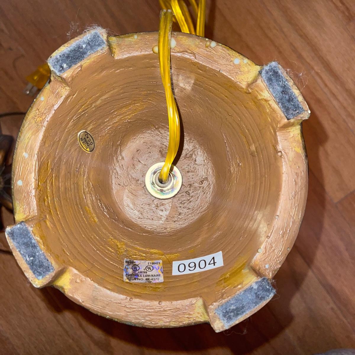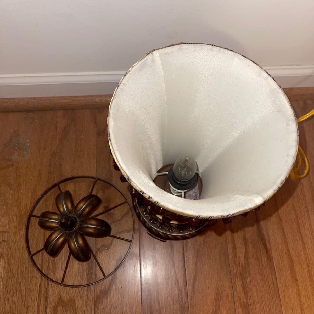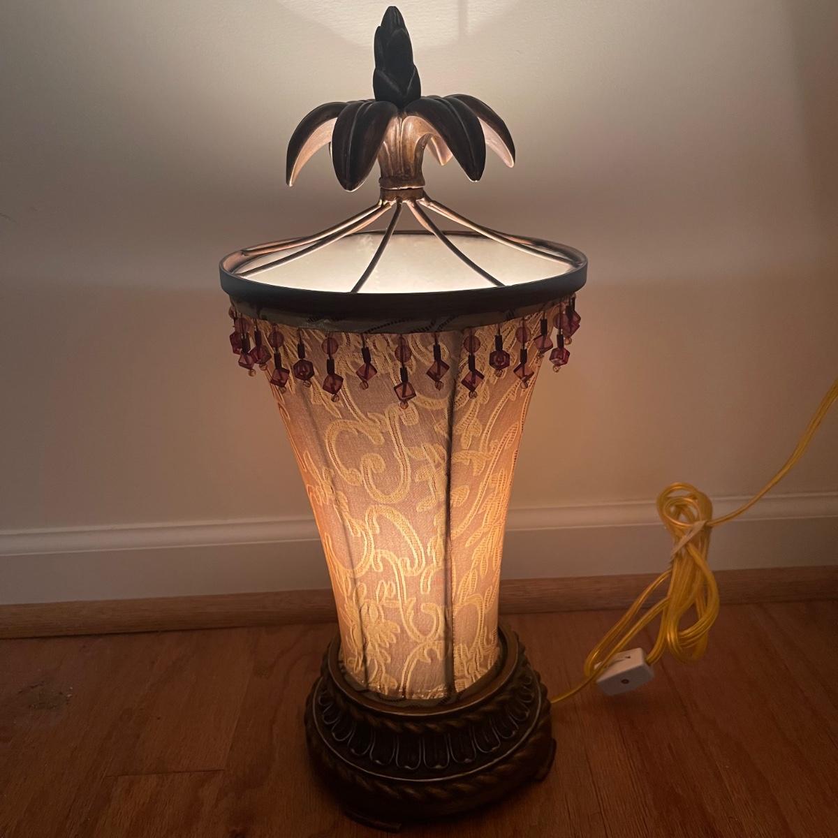 Table and floor lamps with palmetto leaf designs and bronze colored bases. Both lamps turned on when plugged in, the floor lamp has a dimmer on its cord. The table lamp is about 17.5” tall and the floor lamp is about 71.5”.