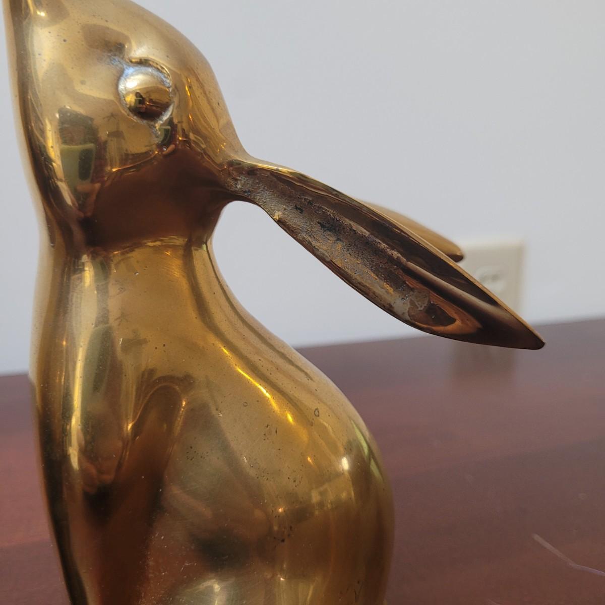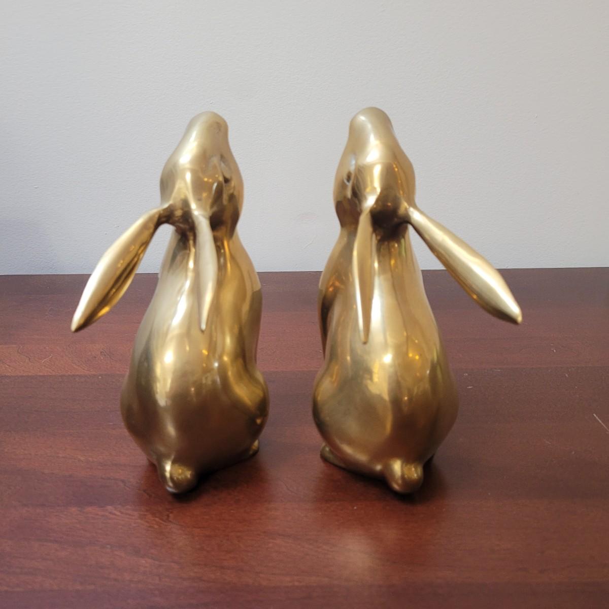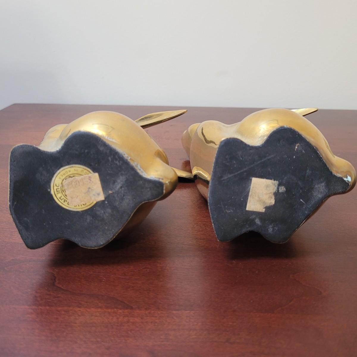This pair of brass rabbit bookends has some residue and scuff marks, possibly some oxidation. See photos for details. Each rabbit measures approximately 2.5” x 4” x 8”H. Sticker appears to read Jack Housman Inc. Made in Korea. Shipping available.