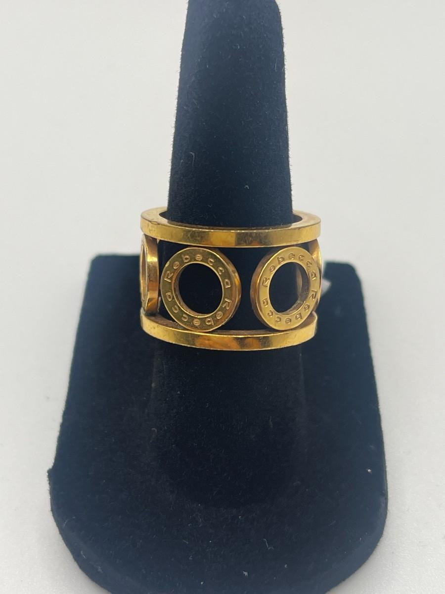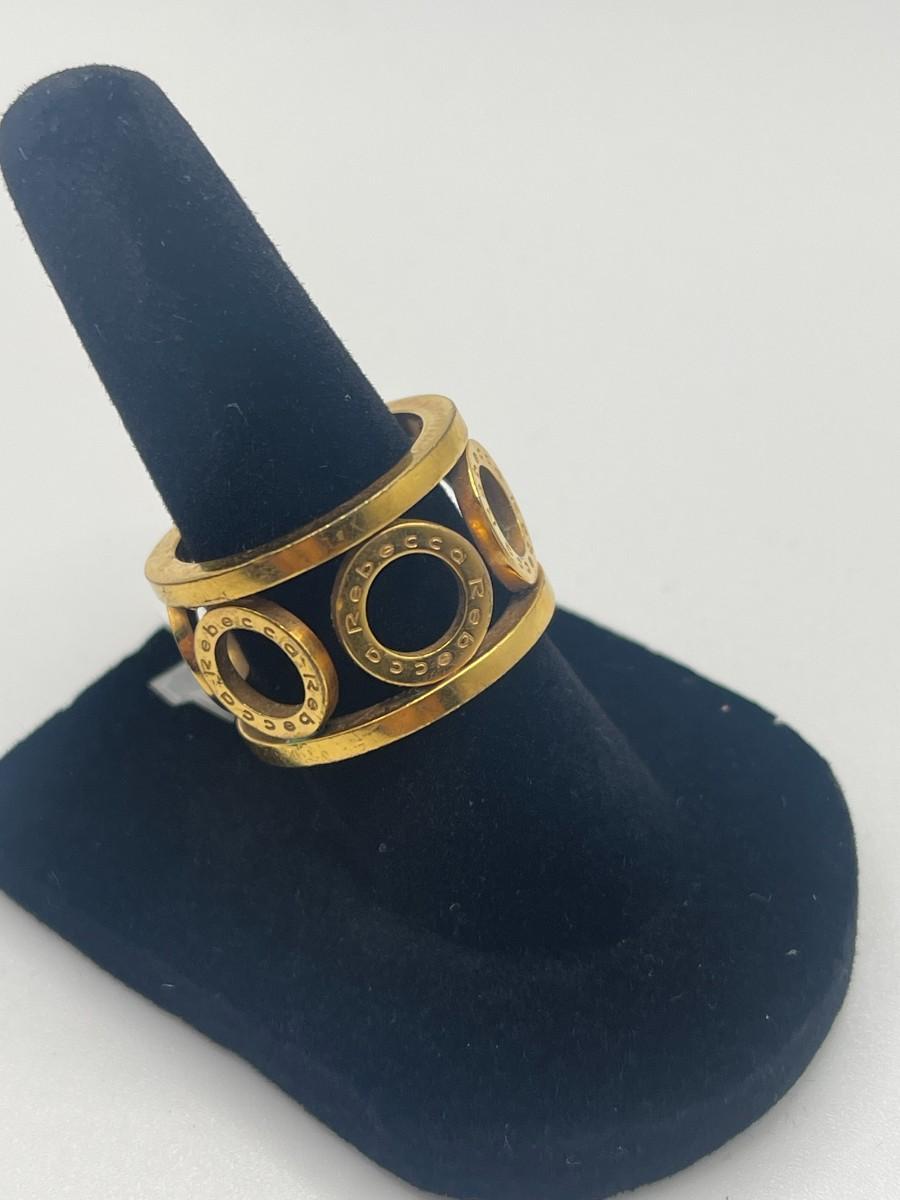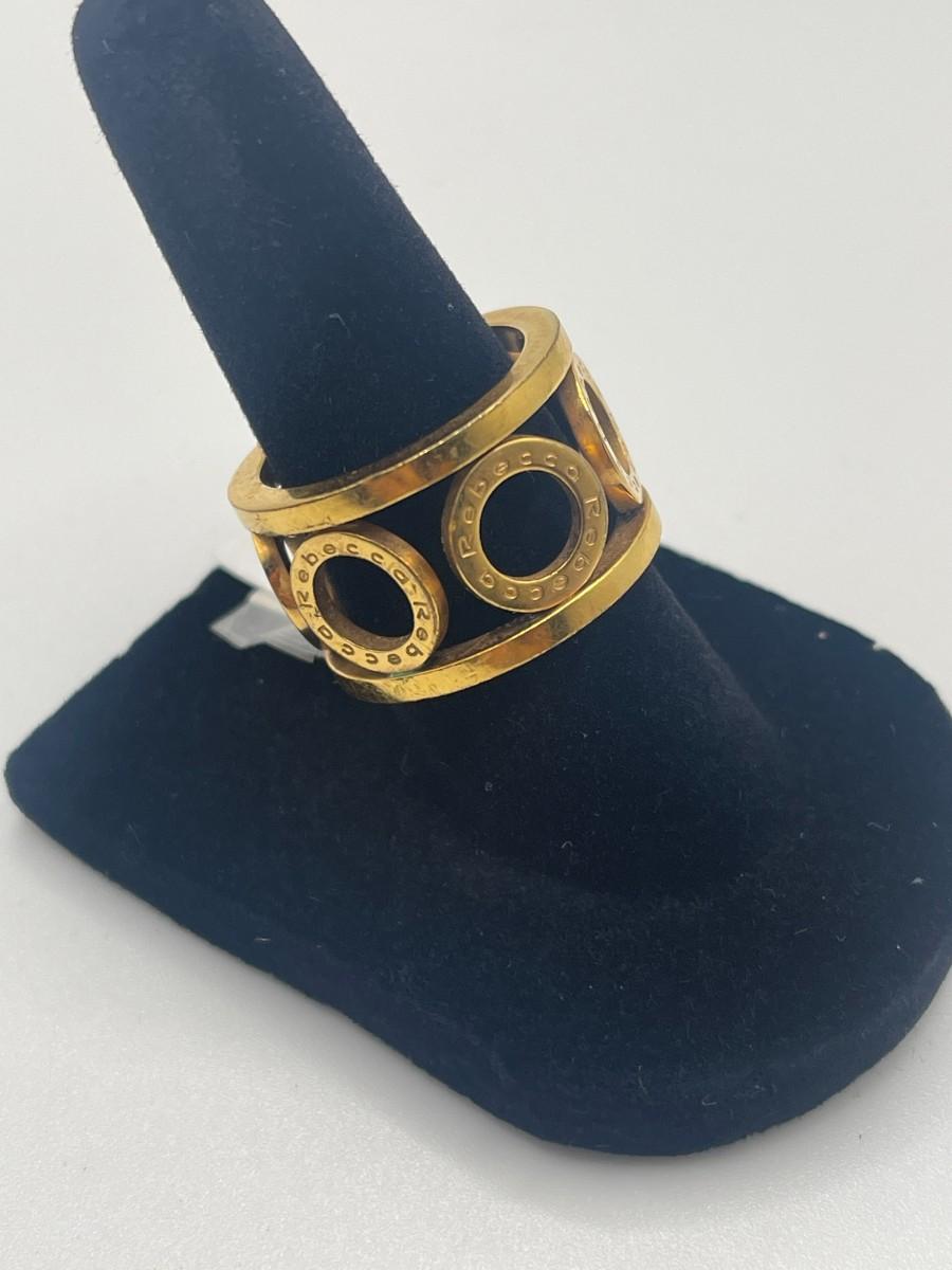 Bronze ring with circle design and gold overlay by Rebecca Gioillelli. Name Rebecca is inscribed on each of the circles. Size 7, good condition with some minor scratching. Made in Italy. Something like this is hard to find in the US and probably retails for about $150.