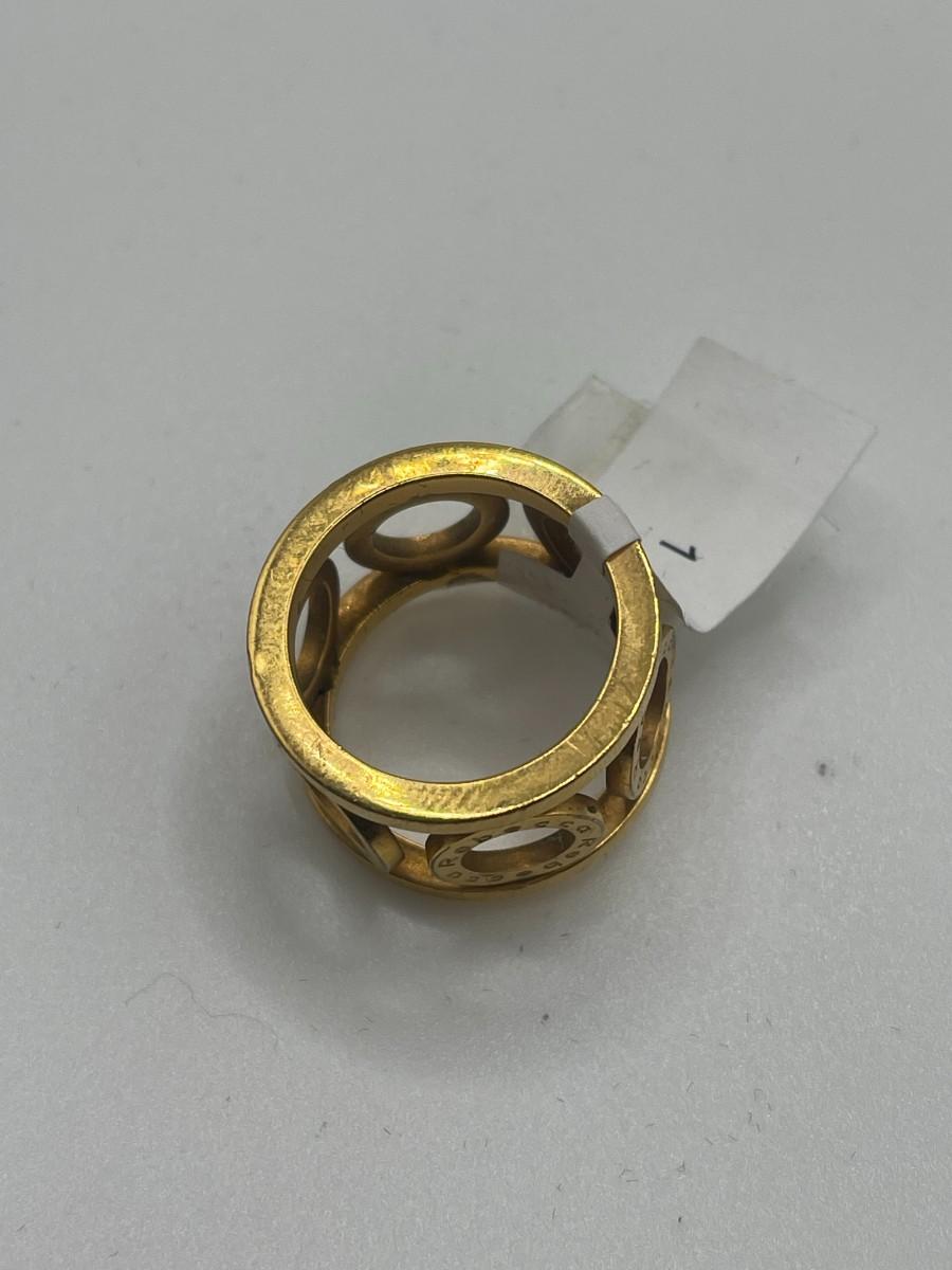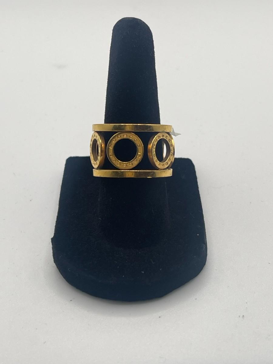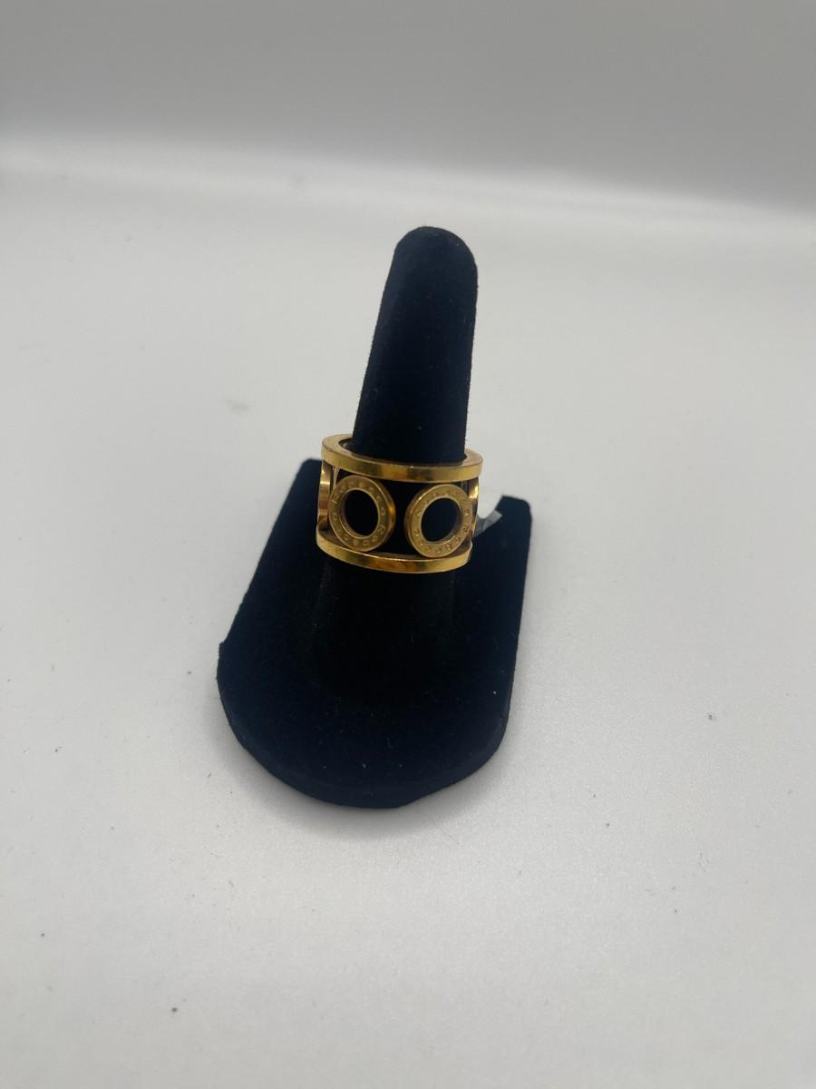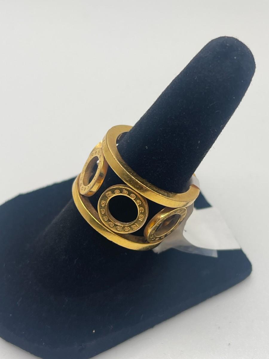 Bronze ring with circle design and gold overlay by Rebecca Gioillelli. Name Rebecca is inscribed on each of the circles. Size 7, good condition with some minor scratching. Made in Italy. Something like this is hard to find in the US and probably retails for about $150.