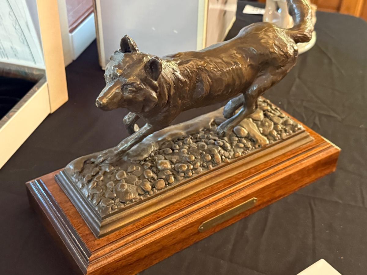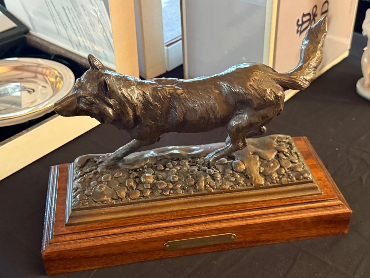 12 1/2” long 5 1/2” wide 8 1/2” tall on wooden base - Lone Wolf