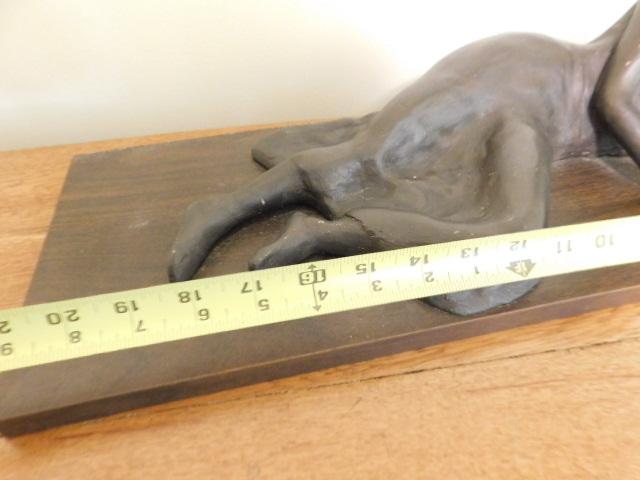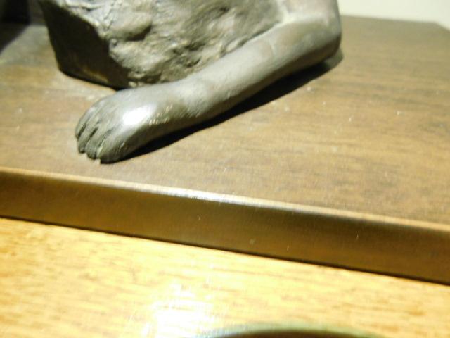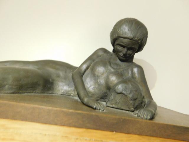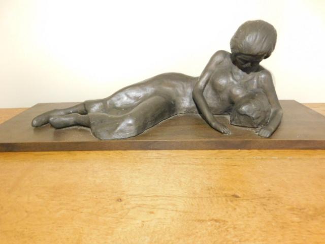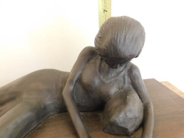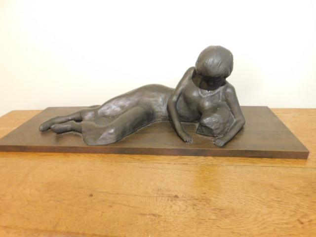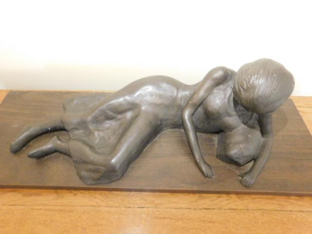 Bronze Statue of a Reclining Woman Set on a Wood Plank Base one arm has been repaired as shown