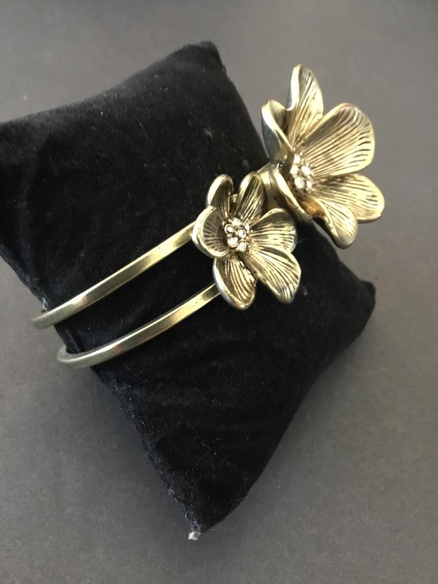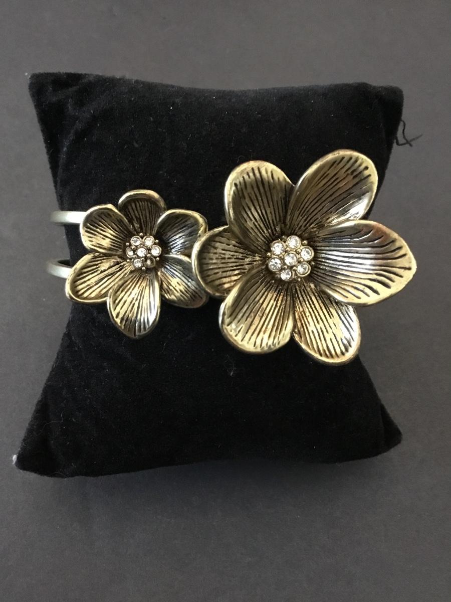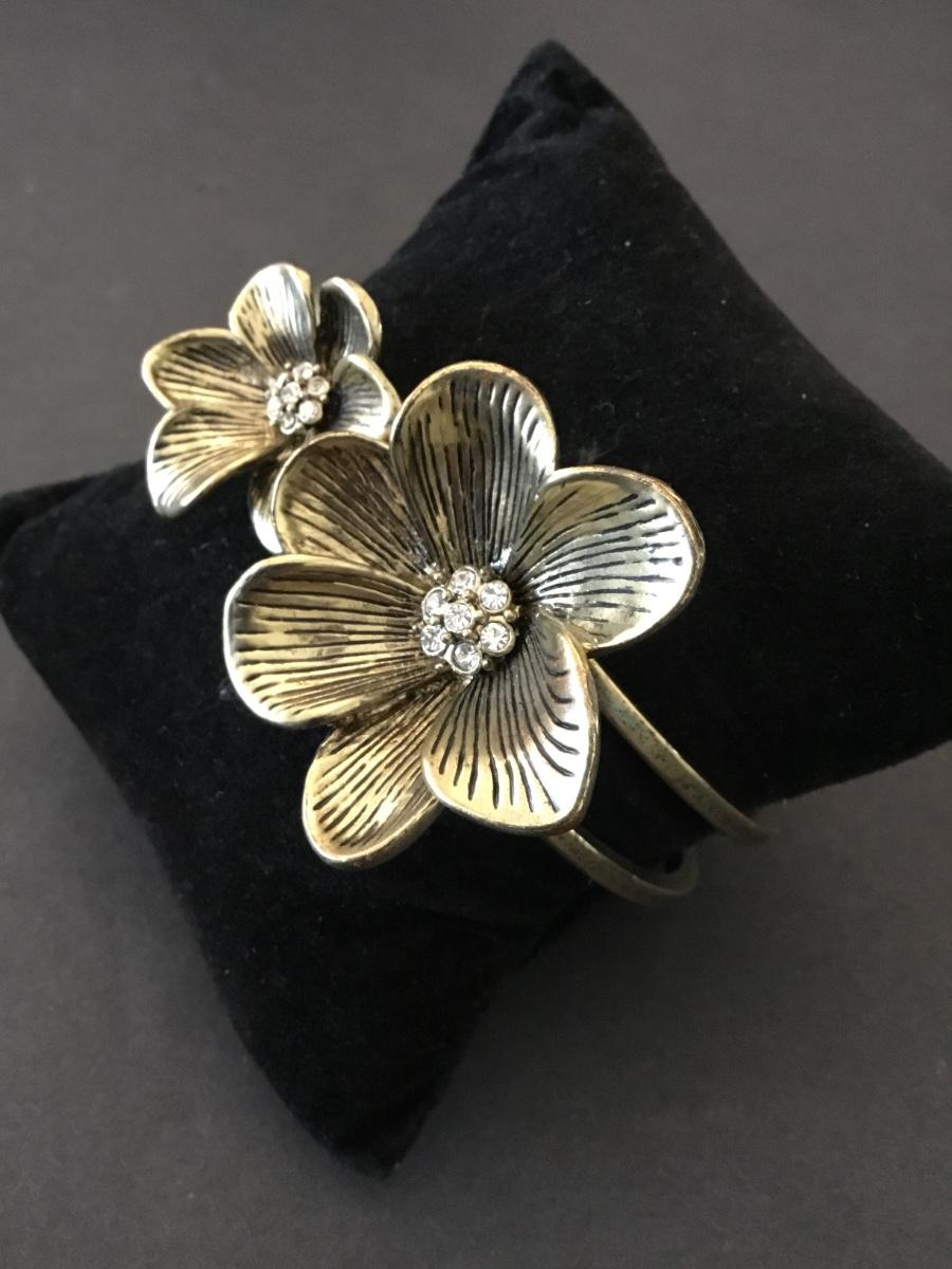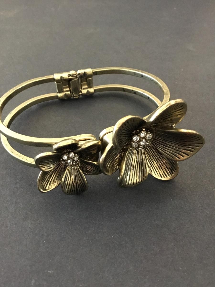 Bronze, toned, flower, rhinestone, hinged bracelet