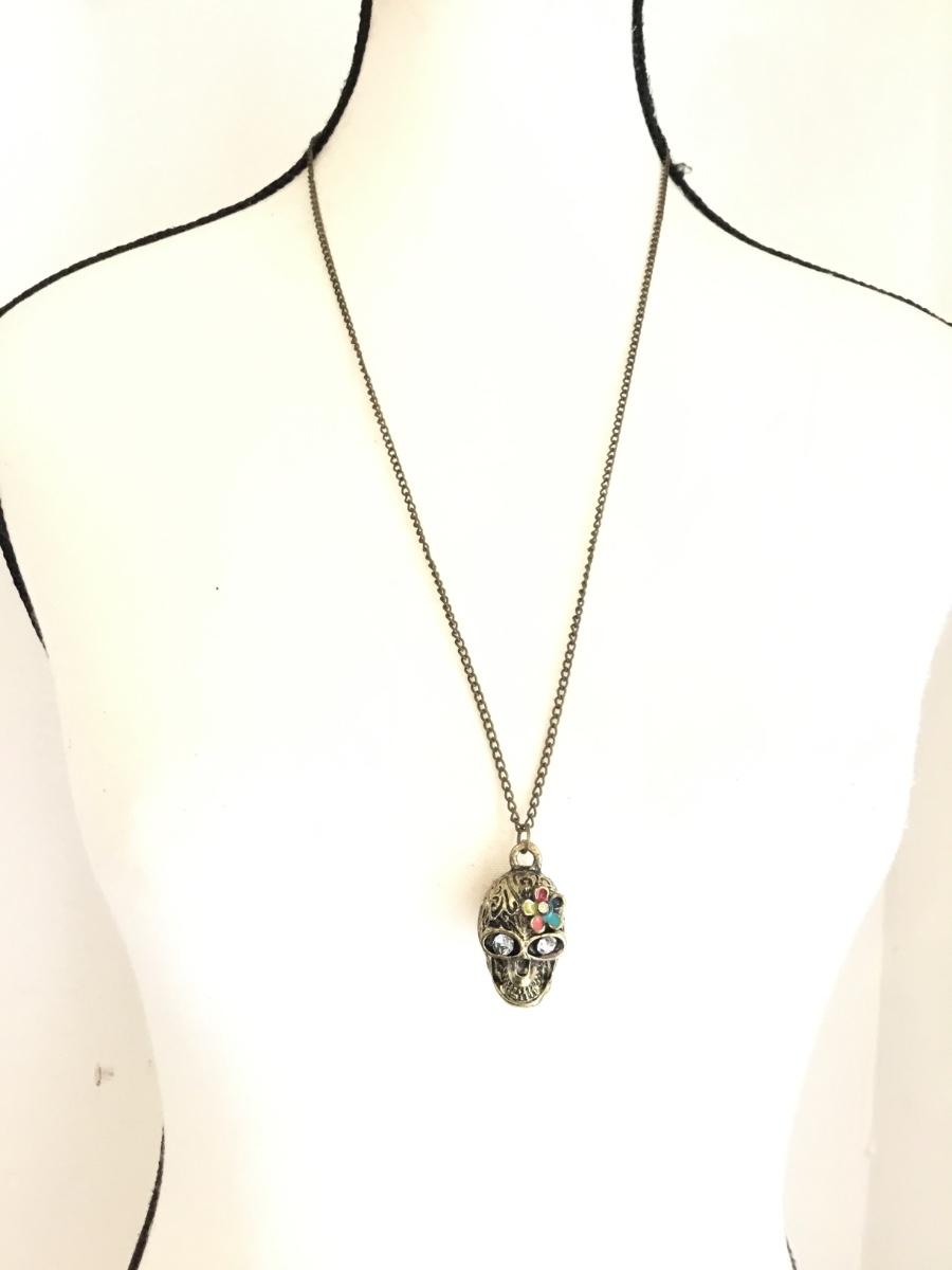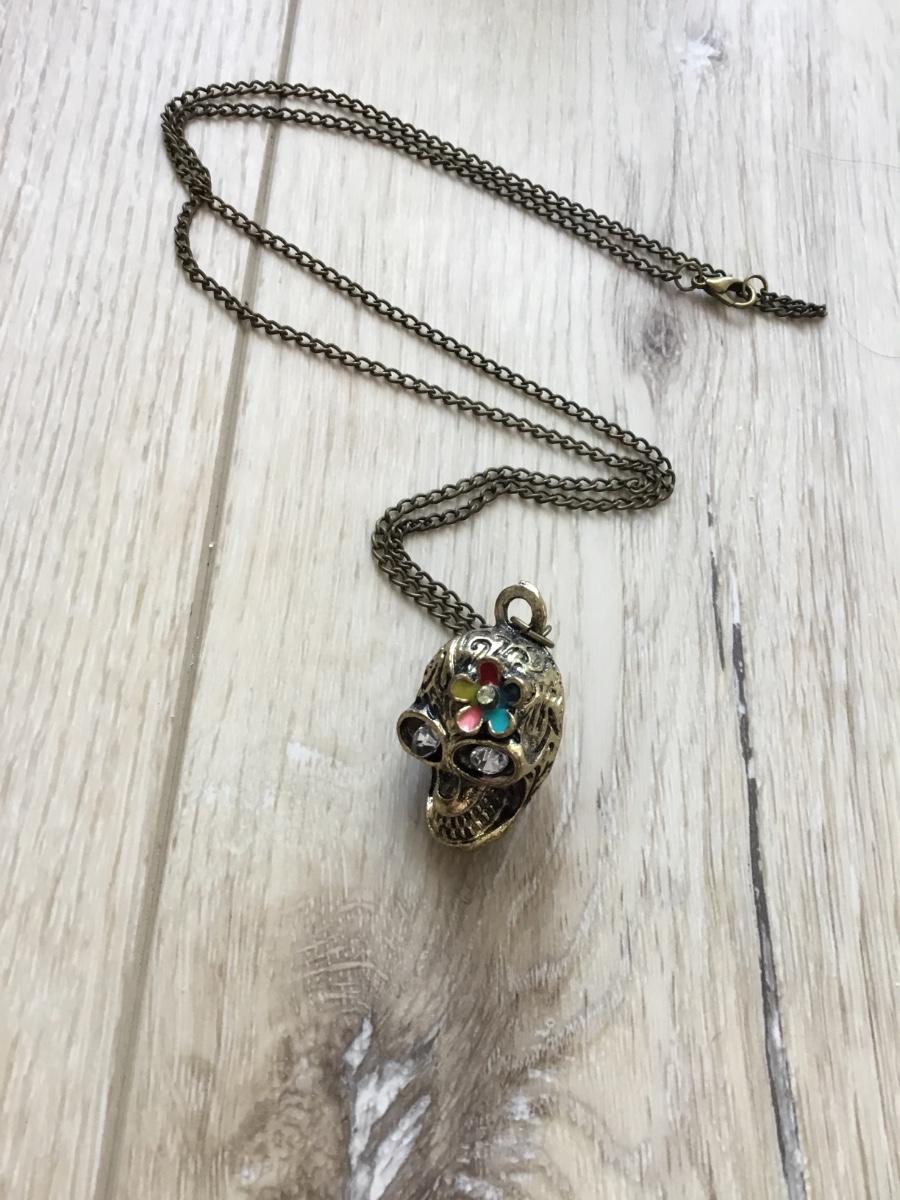 Bronze, toned, skull, , flower, rhinestone, pendant