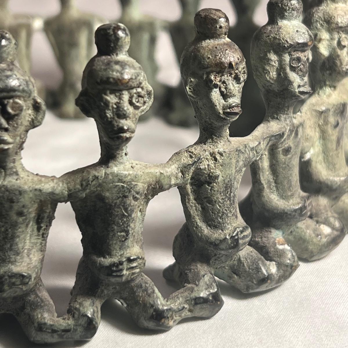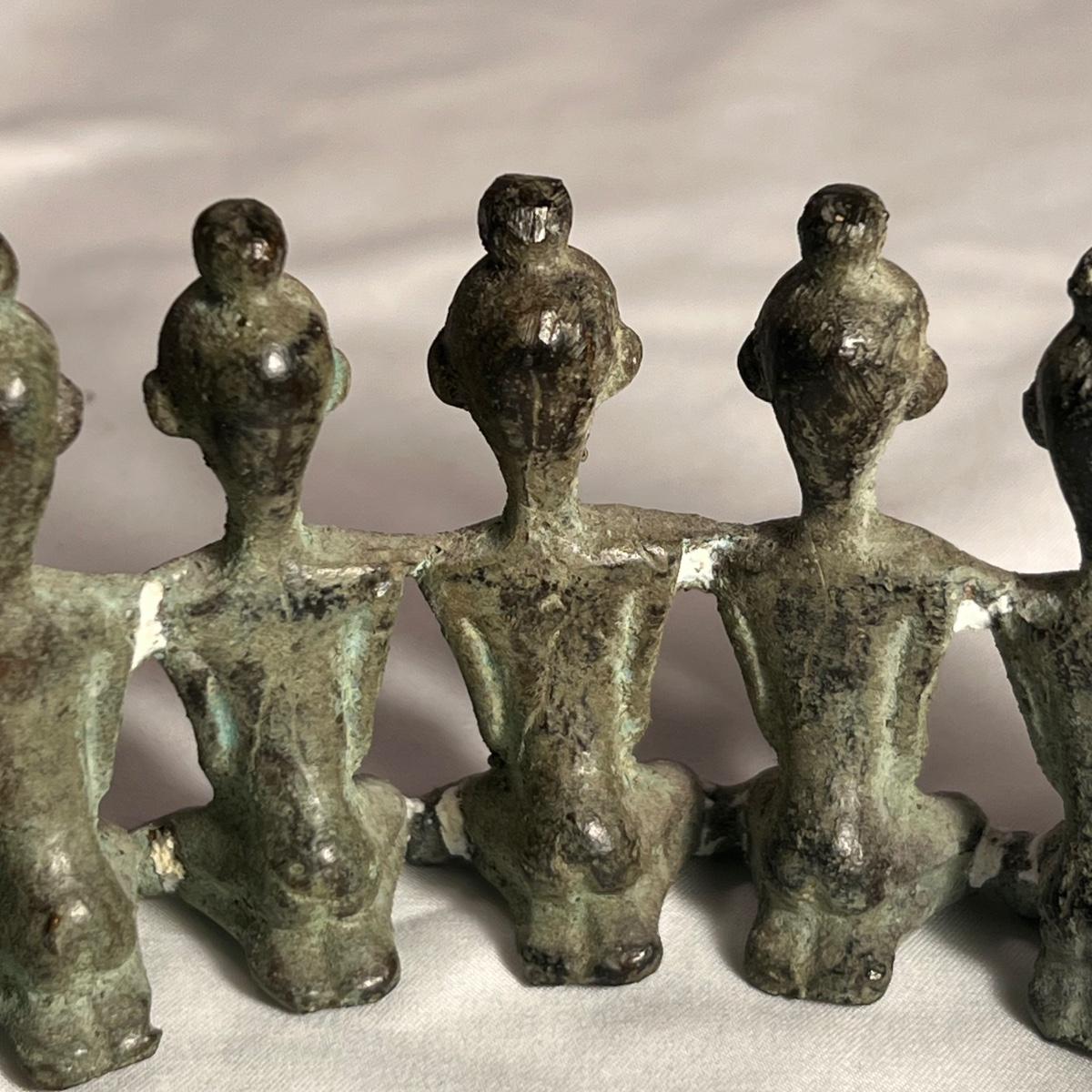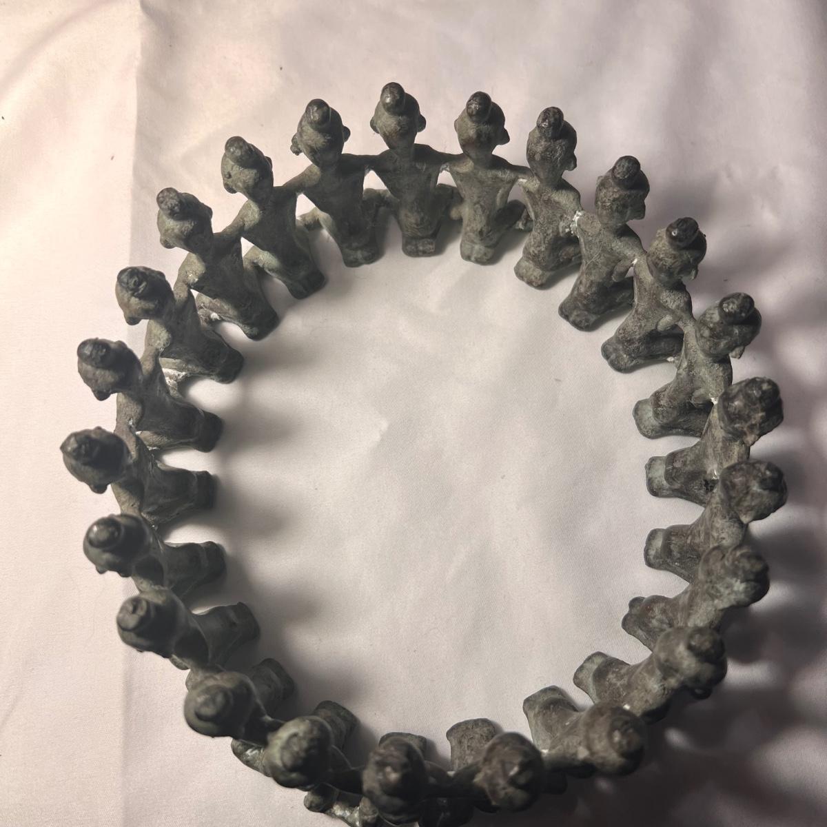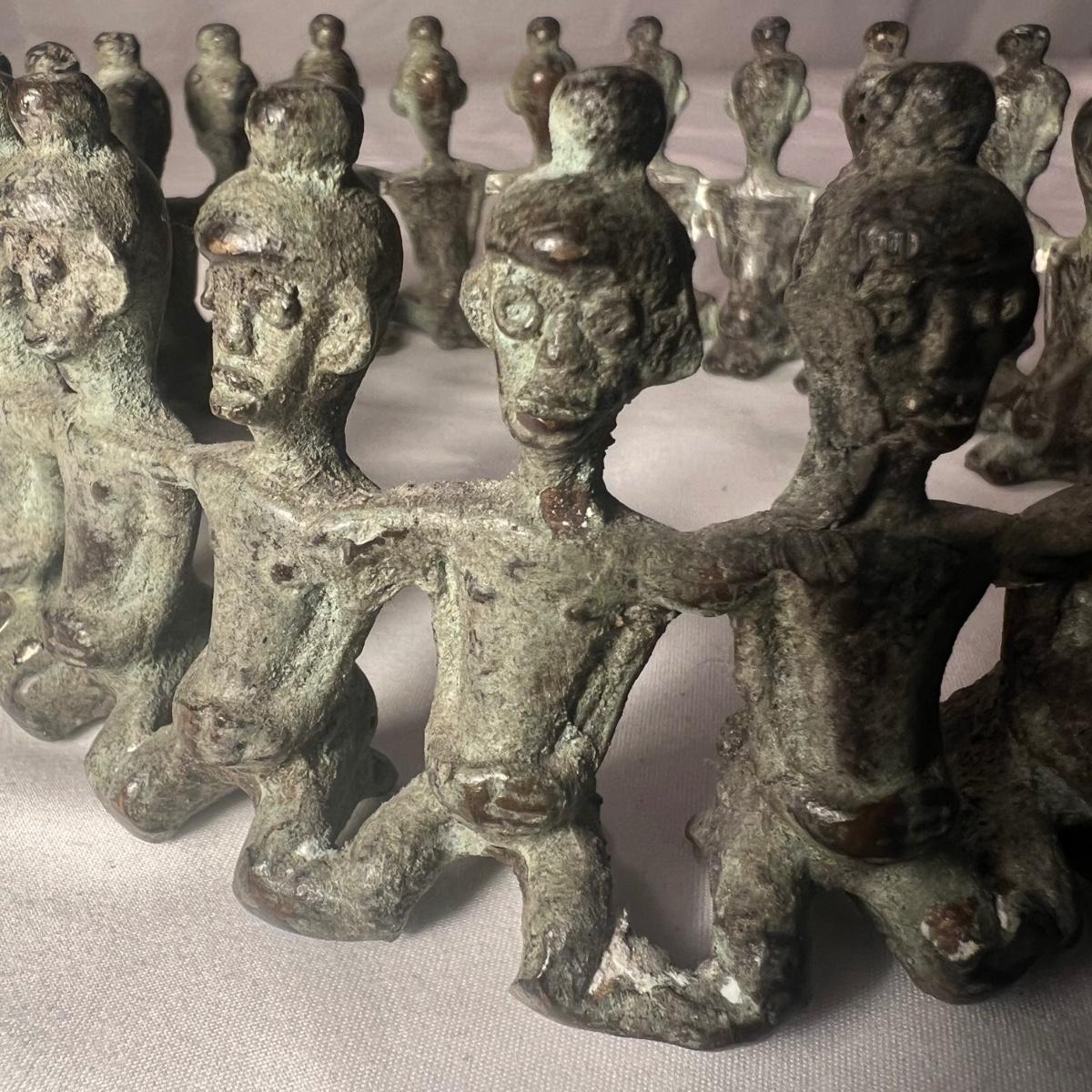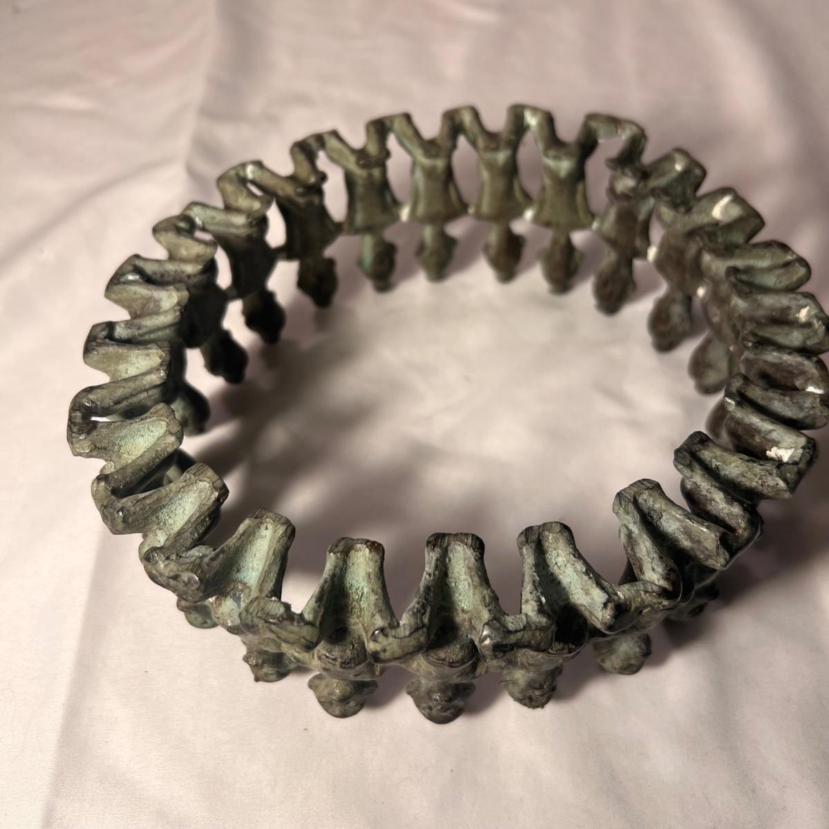 This piece is a heavy metal that appears to be bronze, figures have a blue patina.