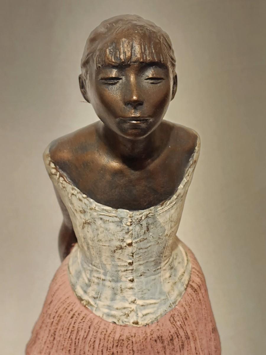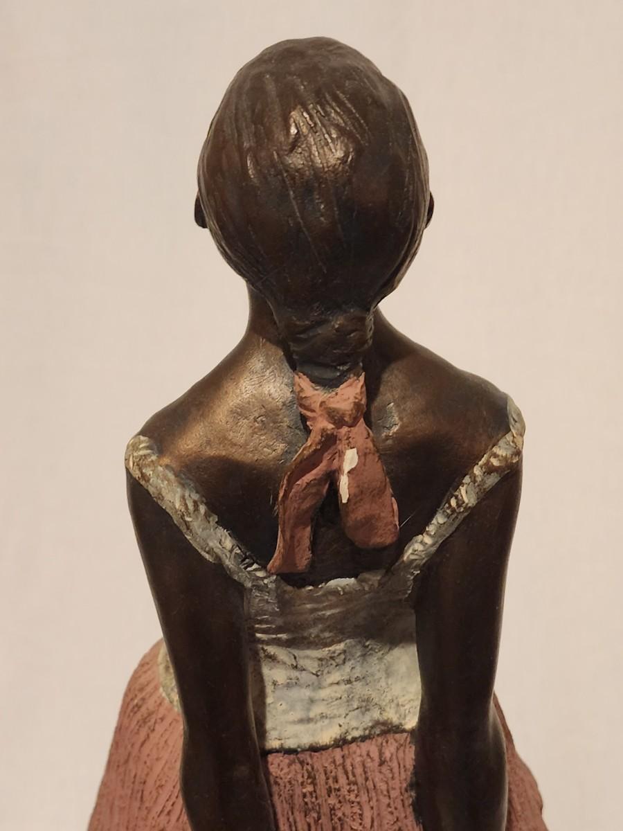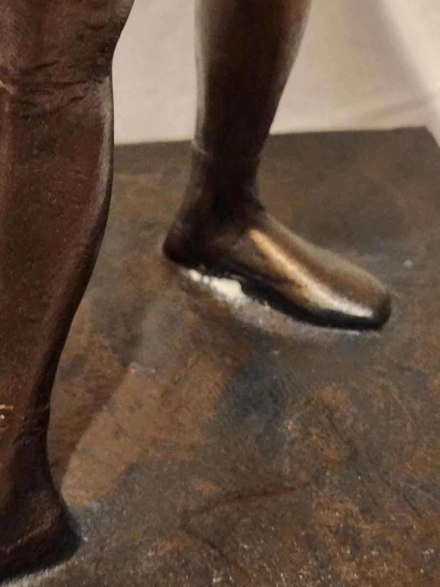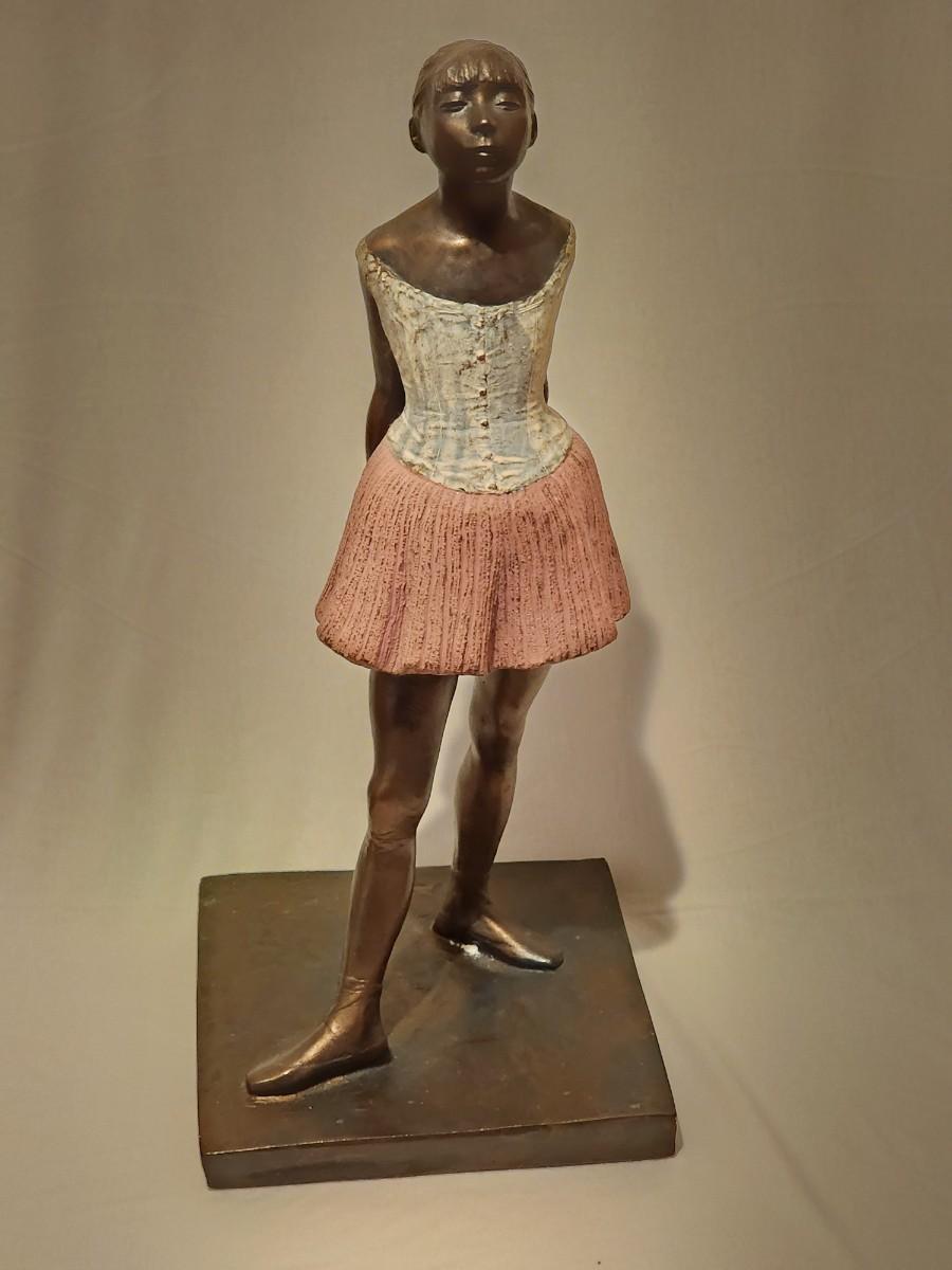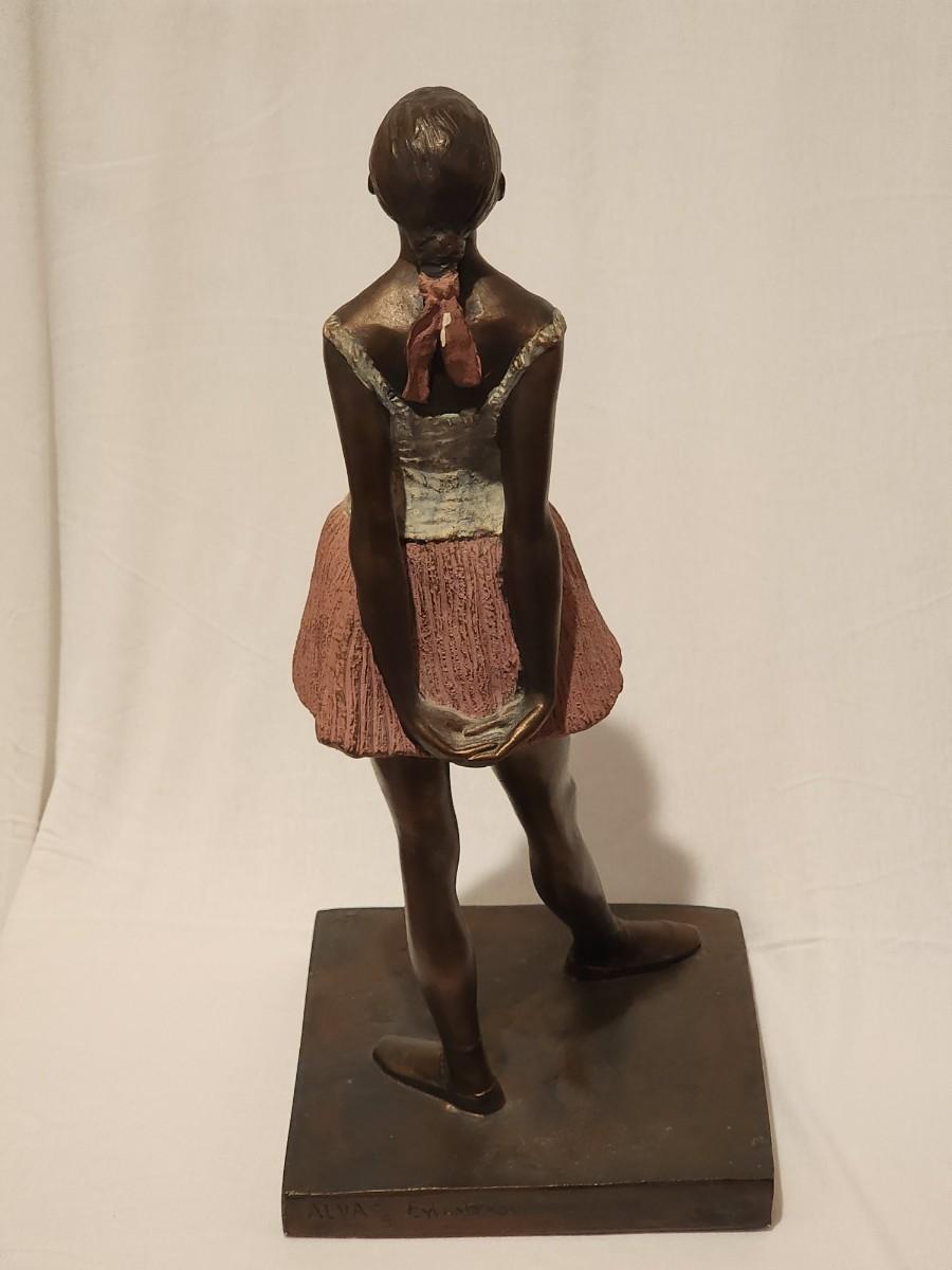 Pretty Degas-style ballerina statue. It looks and feels like brass but is plaster. Some paint loss revealing plaster below in 2 places (left foot and back of braid) as shown in photos.