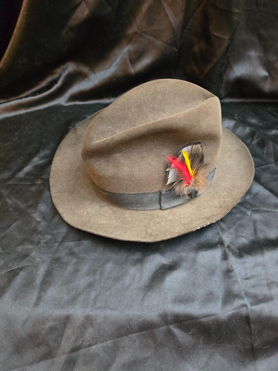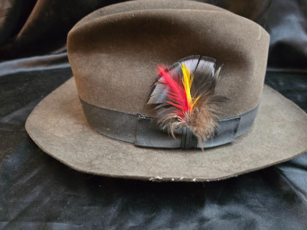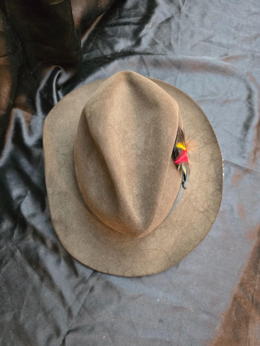 Bronzine felt Stetson Sutley fedora hat with a black grosgrain ribbon and feather accent. Size 7 1/4