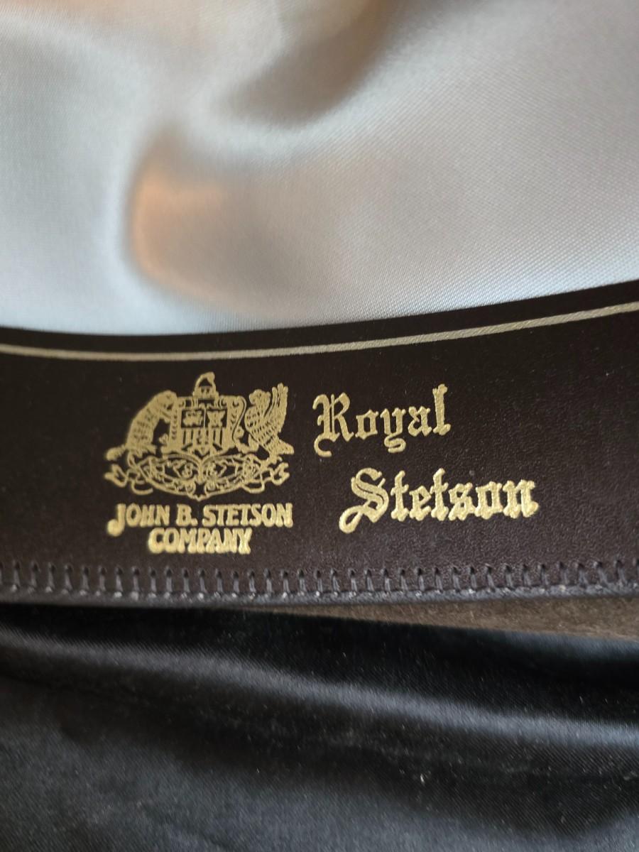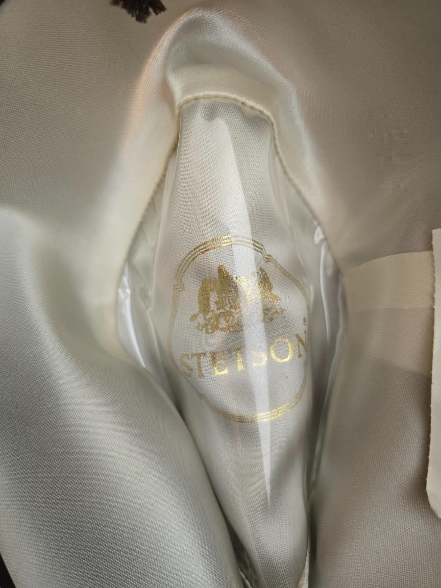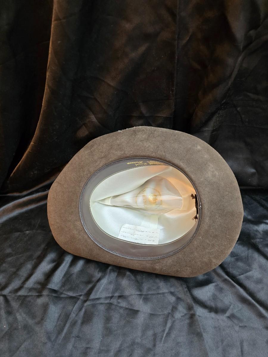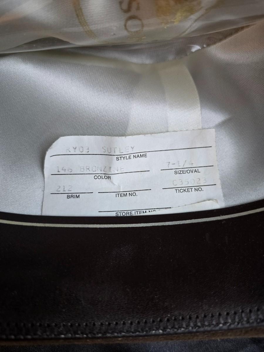 Bronzine felt Stetson Sutley fedora hat with a black grosgrain ribbon and feather accent. Size 7 1/4