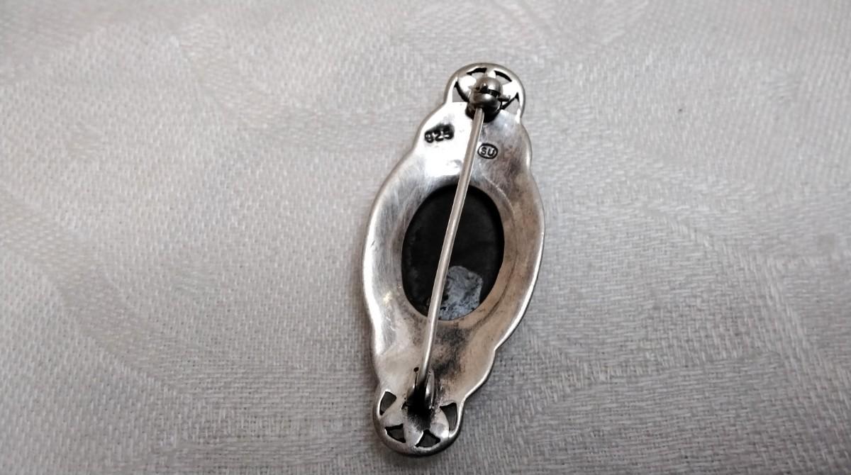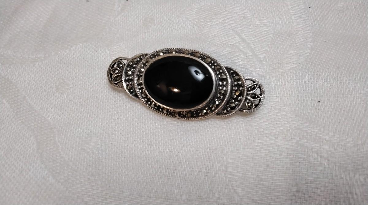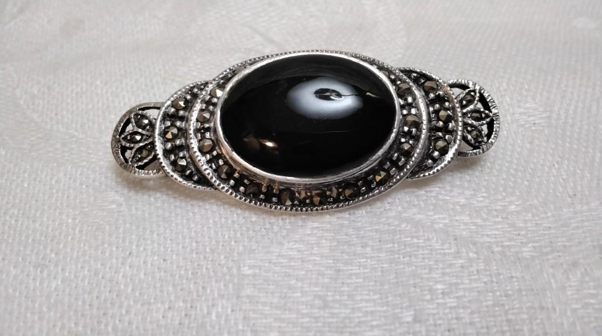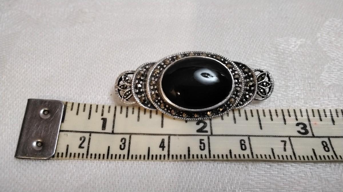 Vintage Italian Onyx and Marcasite 925 Brooch