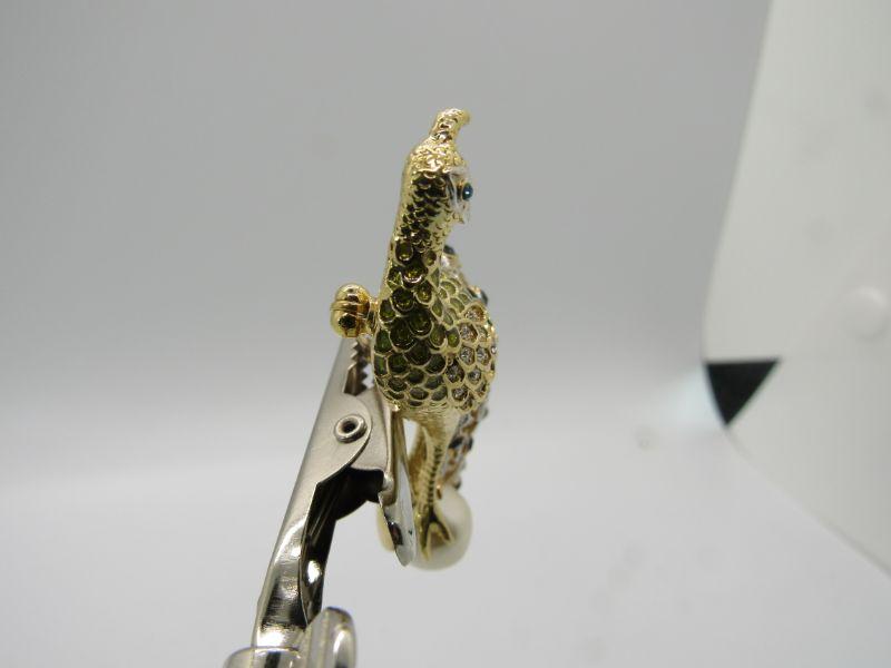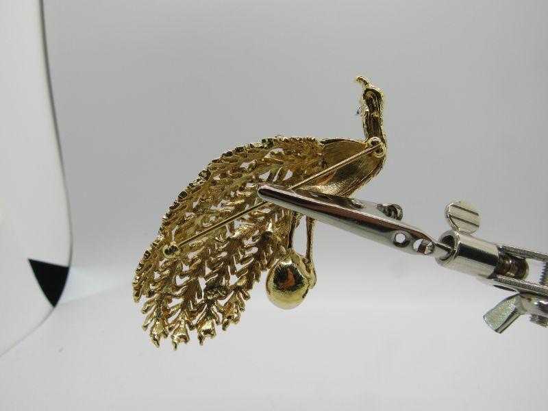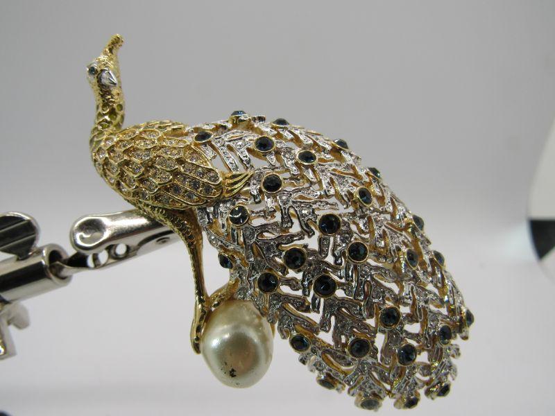 Gold tone and rhinestone peacock brooch. Large faux pearl under its feet. No missing stones.