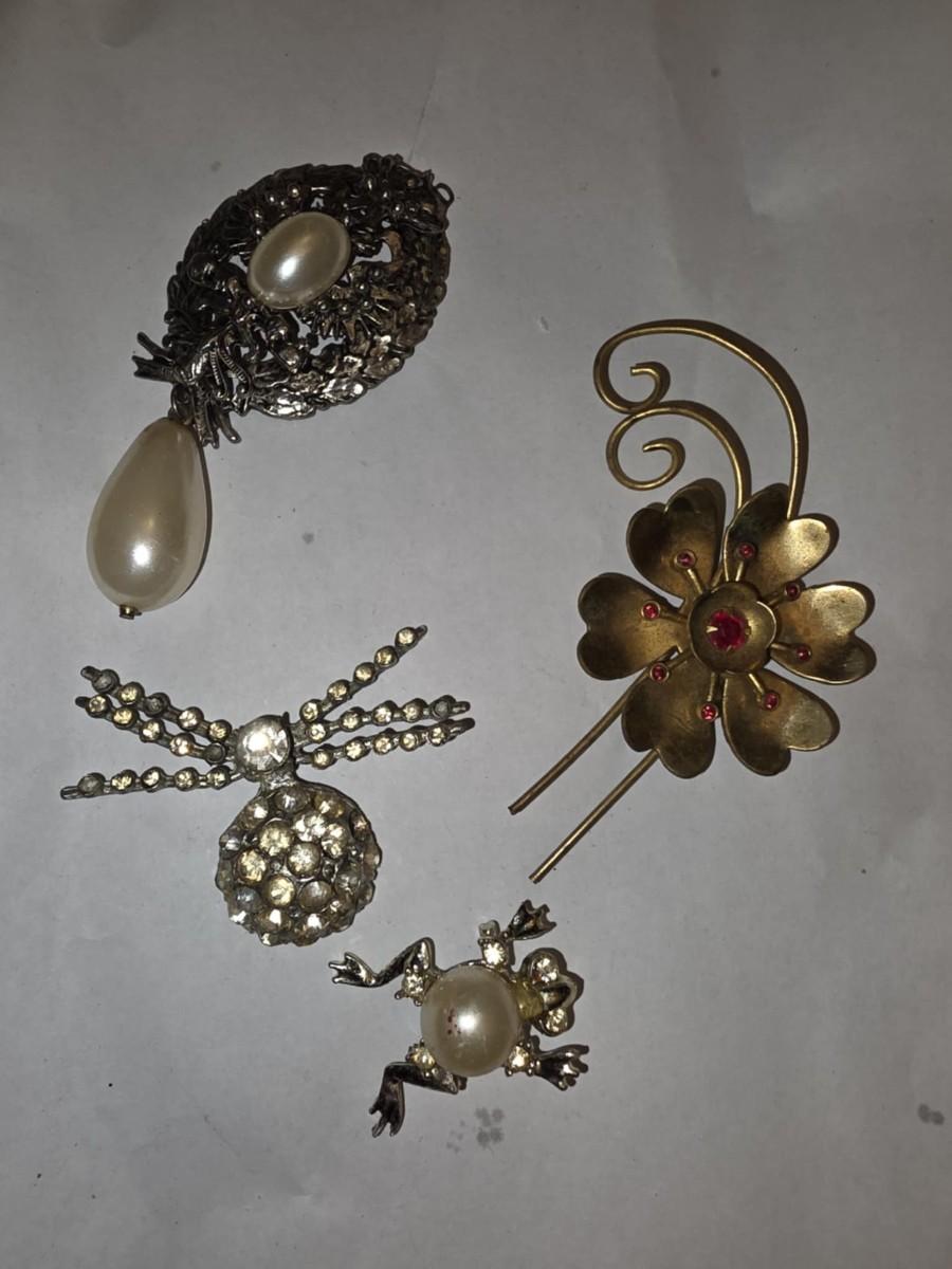 the pearl drop doesn't have the pin on back still nor does the spider. The gold tone flower and pearl drop are 4 inches long for reference