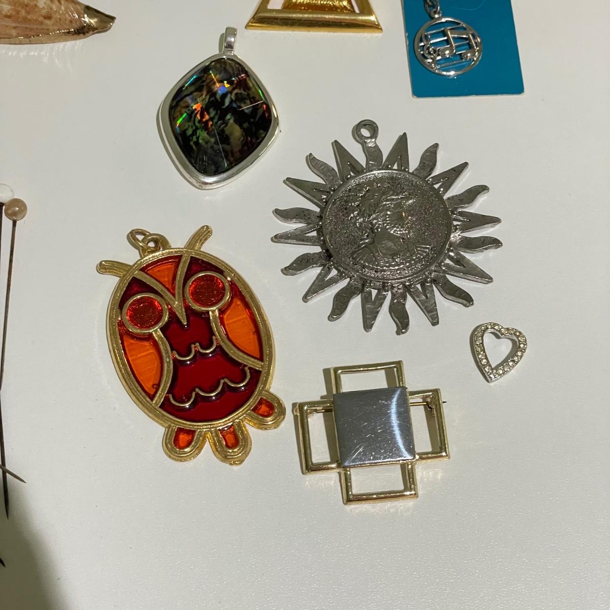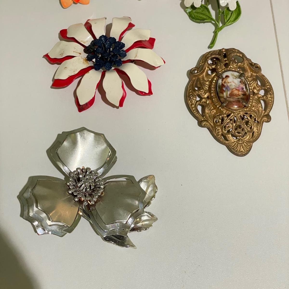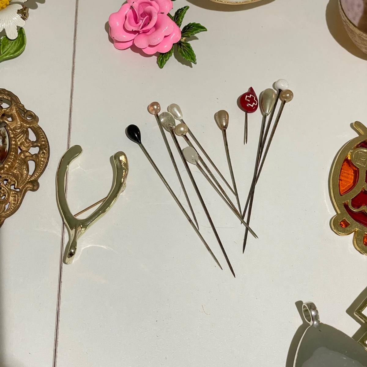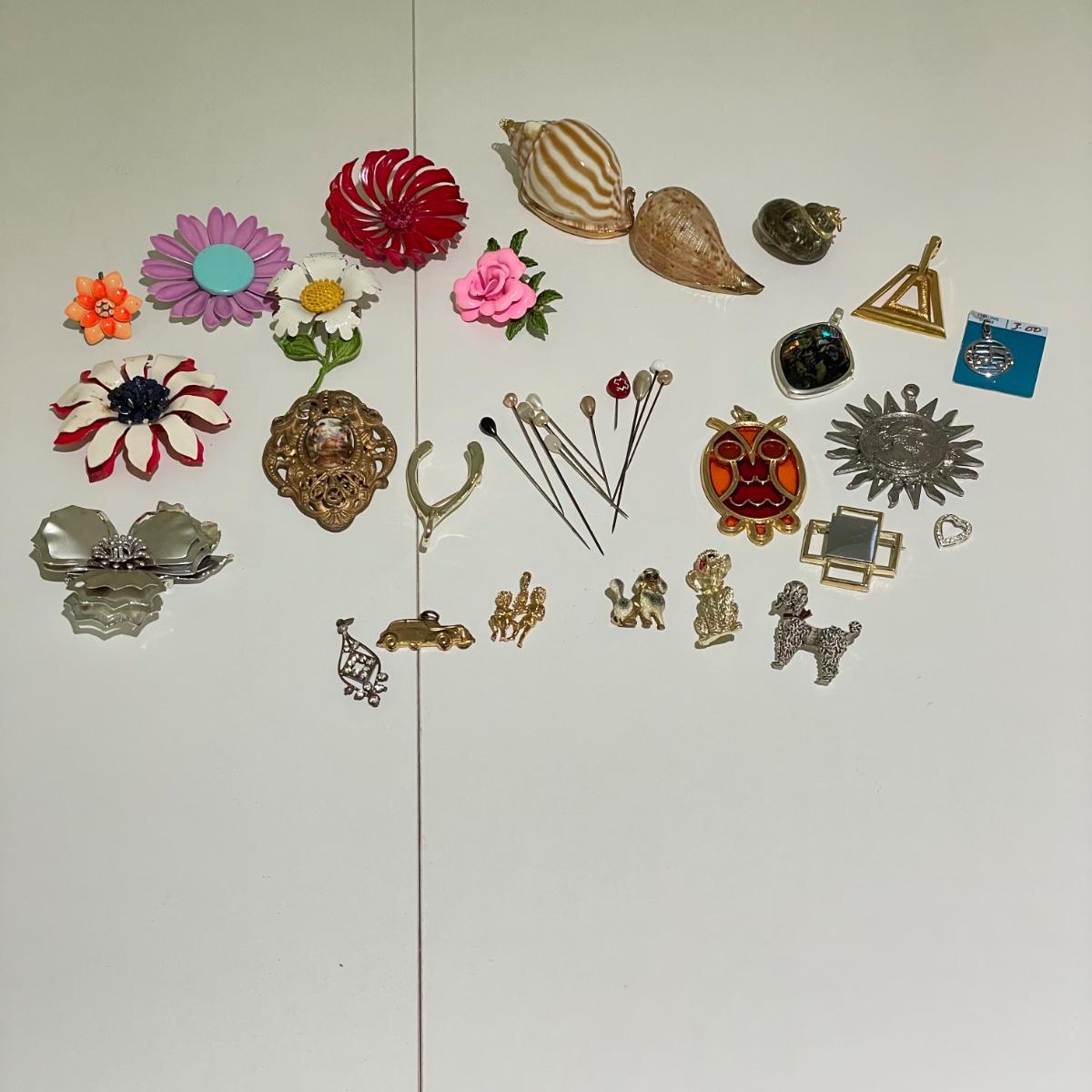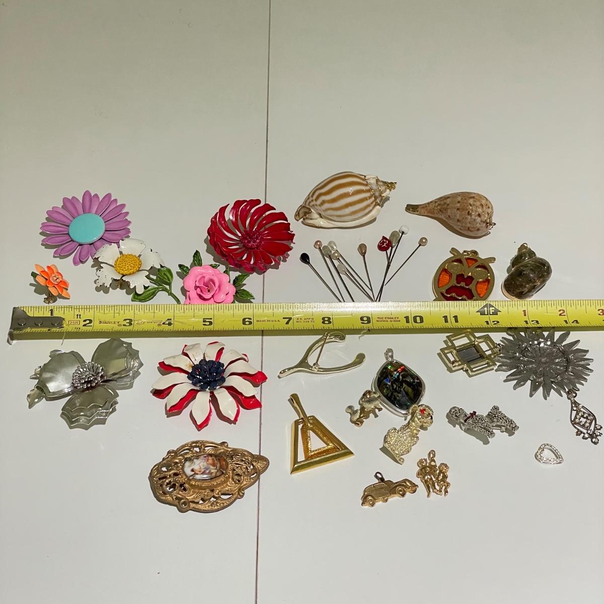 A nice collection of pins, brooches and pendants. Most items are metal, there is one tag that states sterling, but it’s marking isn’t clear. Most are unmarked, material includes metal, shell and one pink flower may be ceramic along with a Victorian centerpiece. See images. Shipping available.