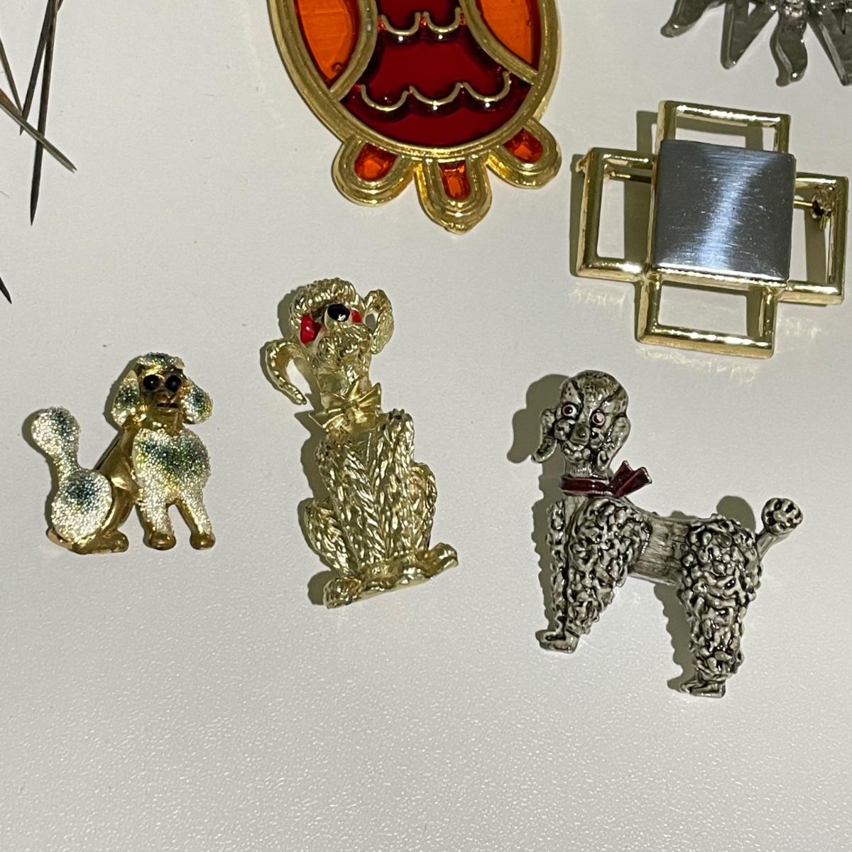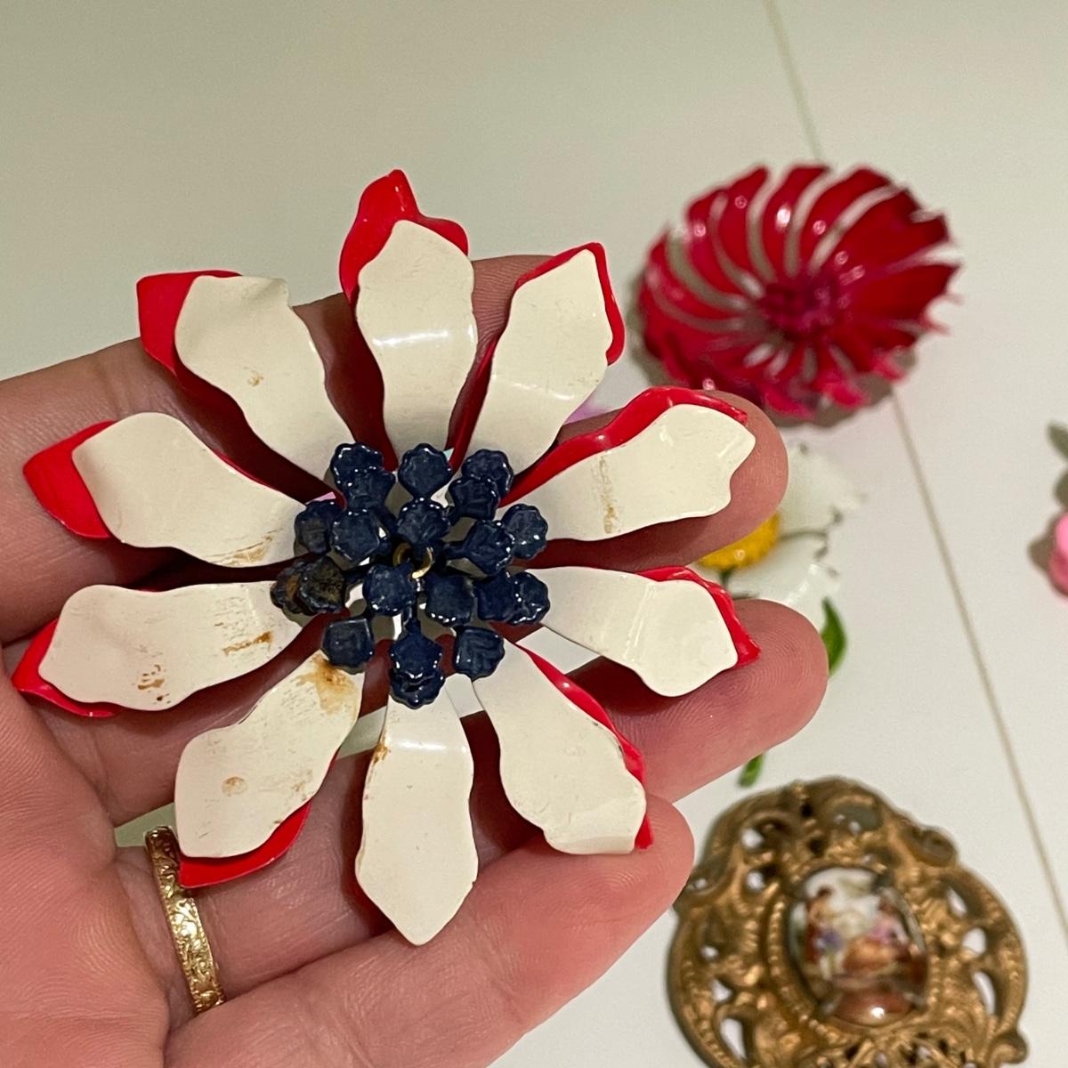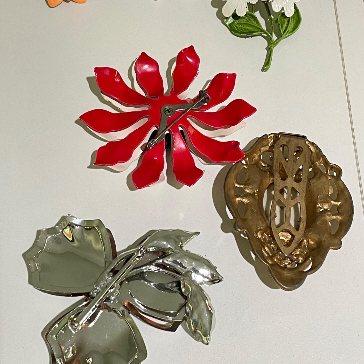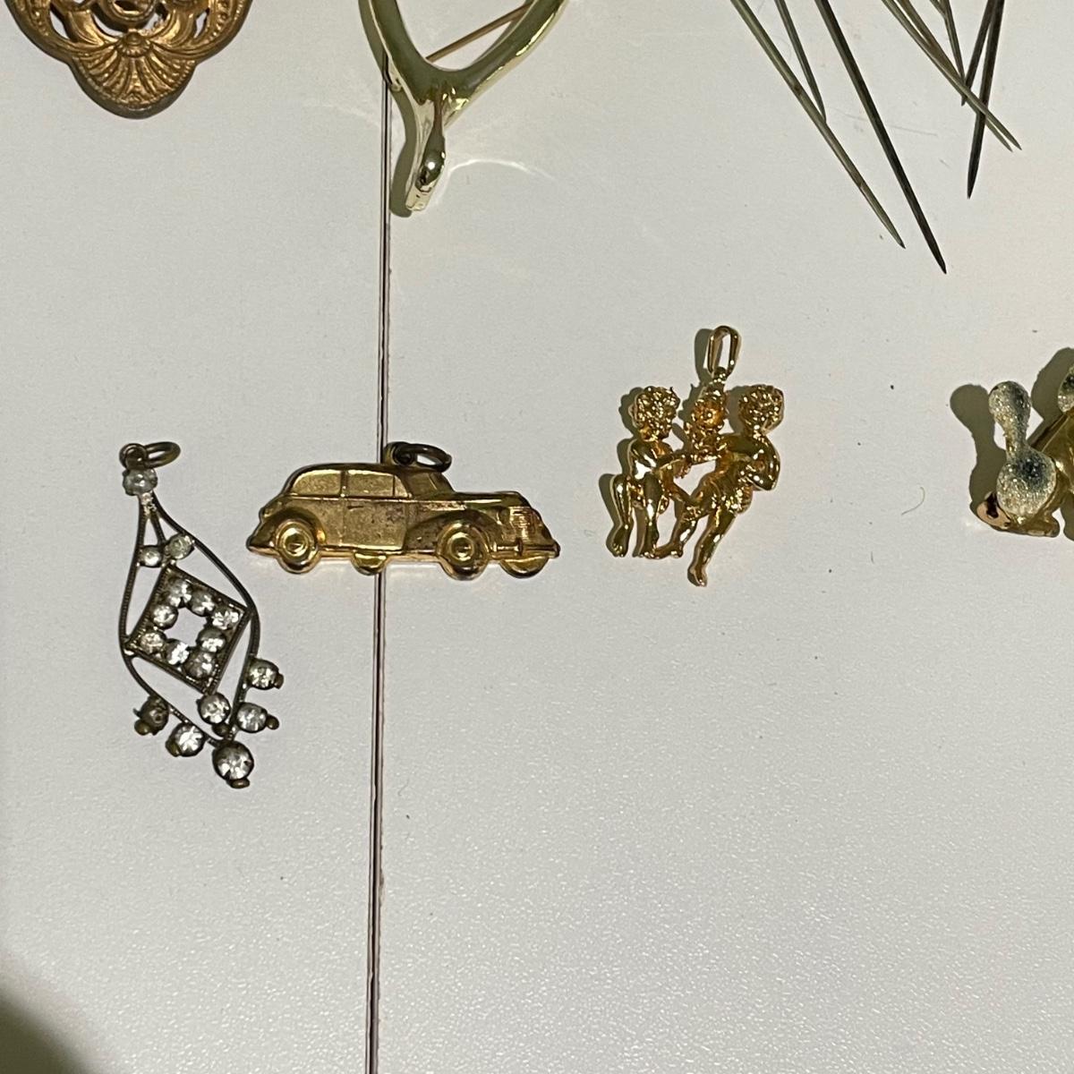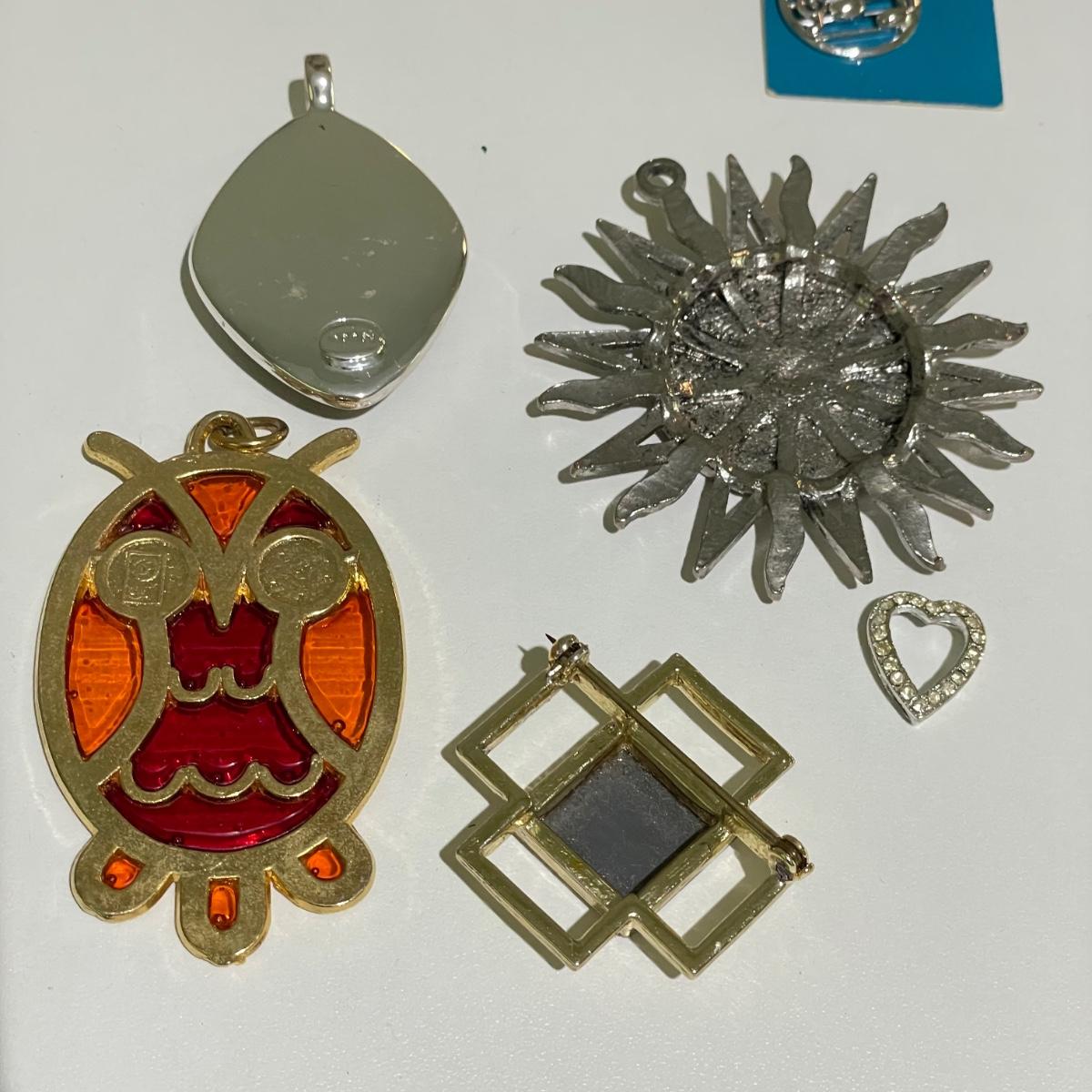 A nice collection of pins, brooches and pendants. Most items are metal, there is one tag that states sterling, but it’s marking isn’t clear. Most are unmarked, material includes metal, shell and one pink flower may be ceramic along with a Victorian centerpiece. See images. Shipping available.