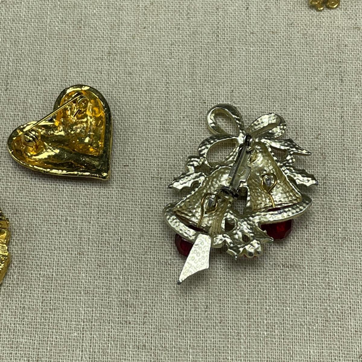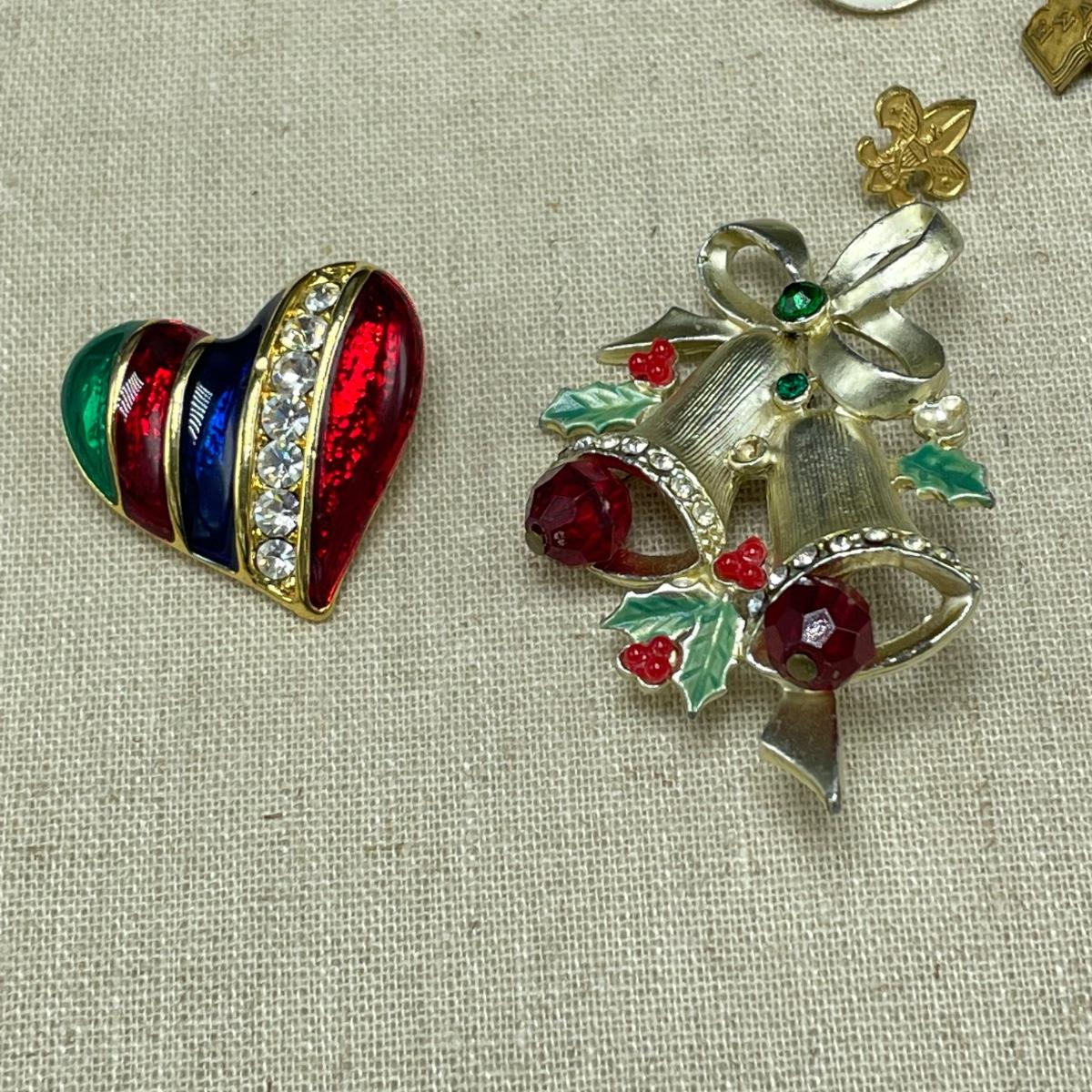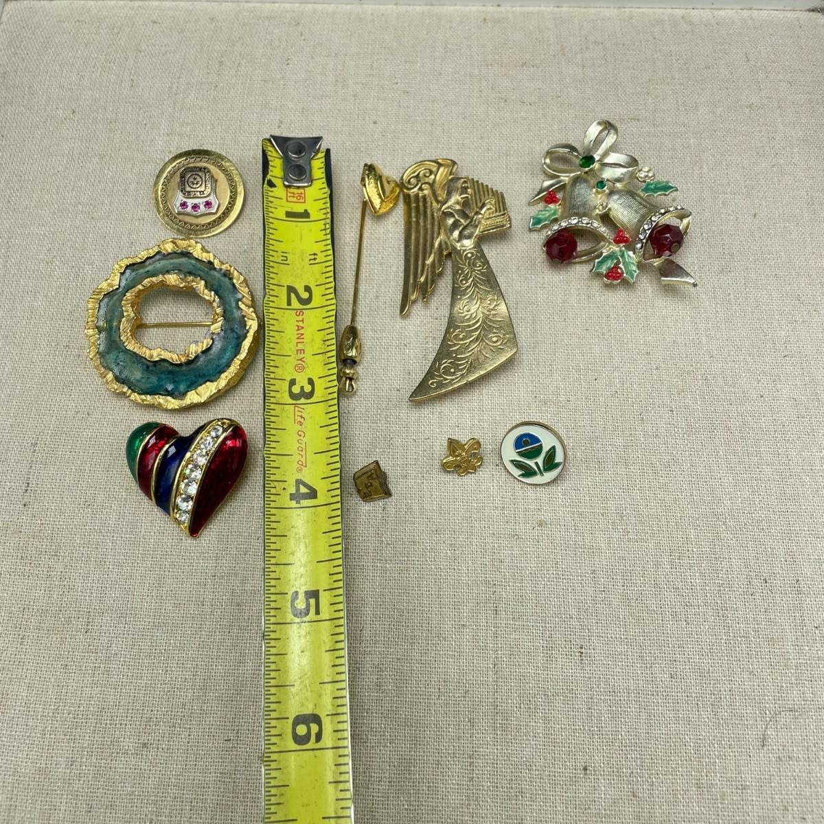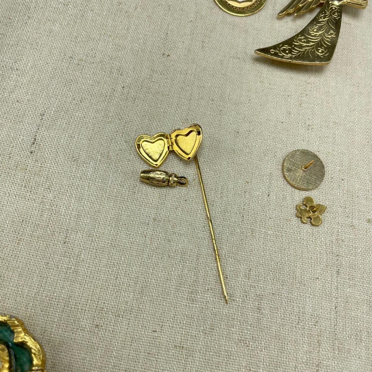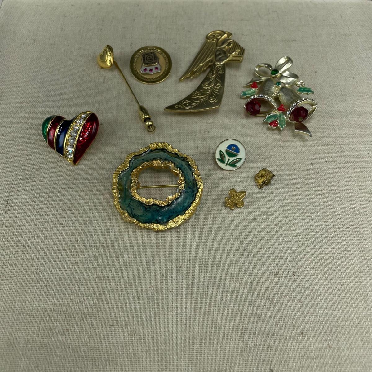 Three vintage pins, five brooches and one locket hat pin. One brooch has Ruby style gems and it’s dated 1956. Markings are shown in photos. Three pins do not have backs. See images. Shipping available.