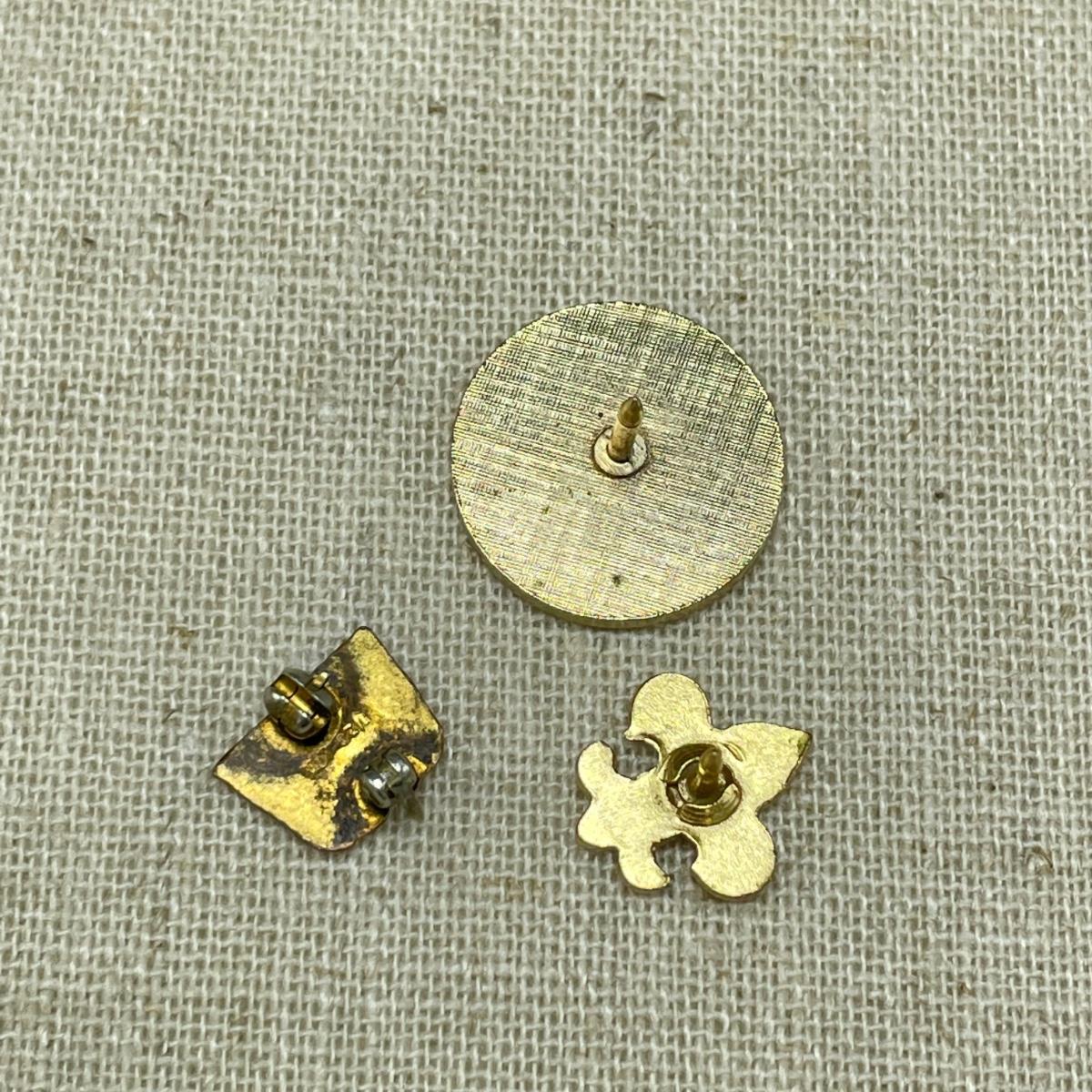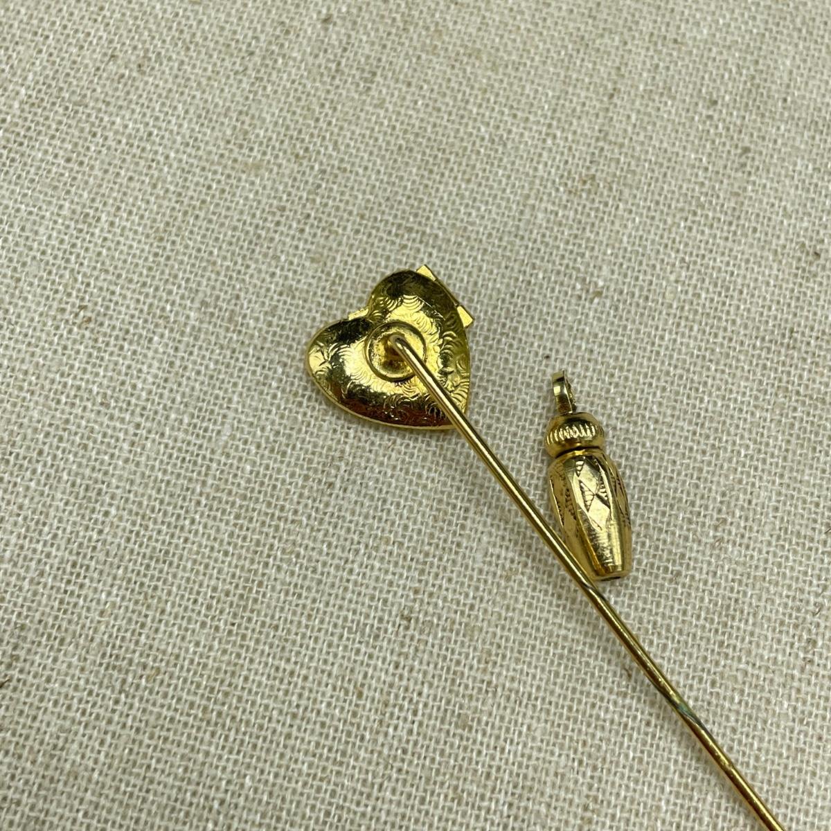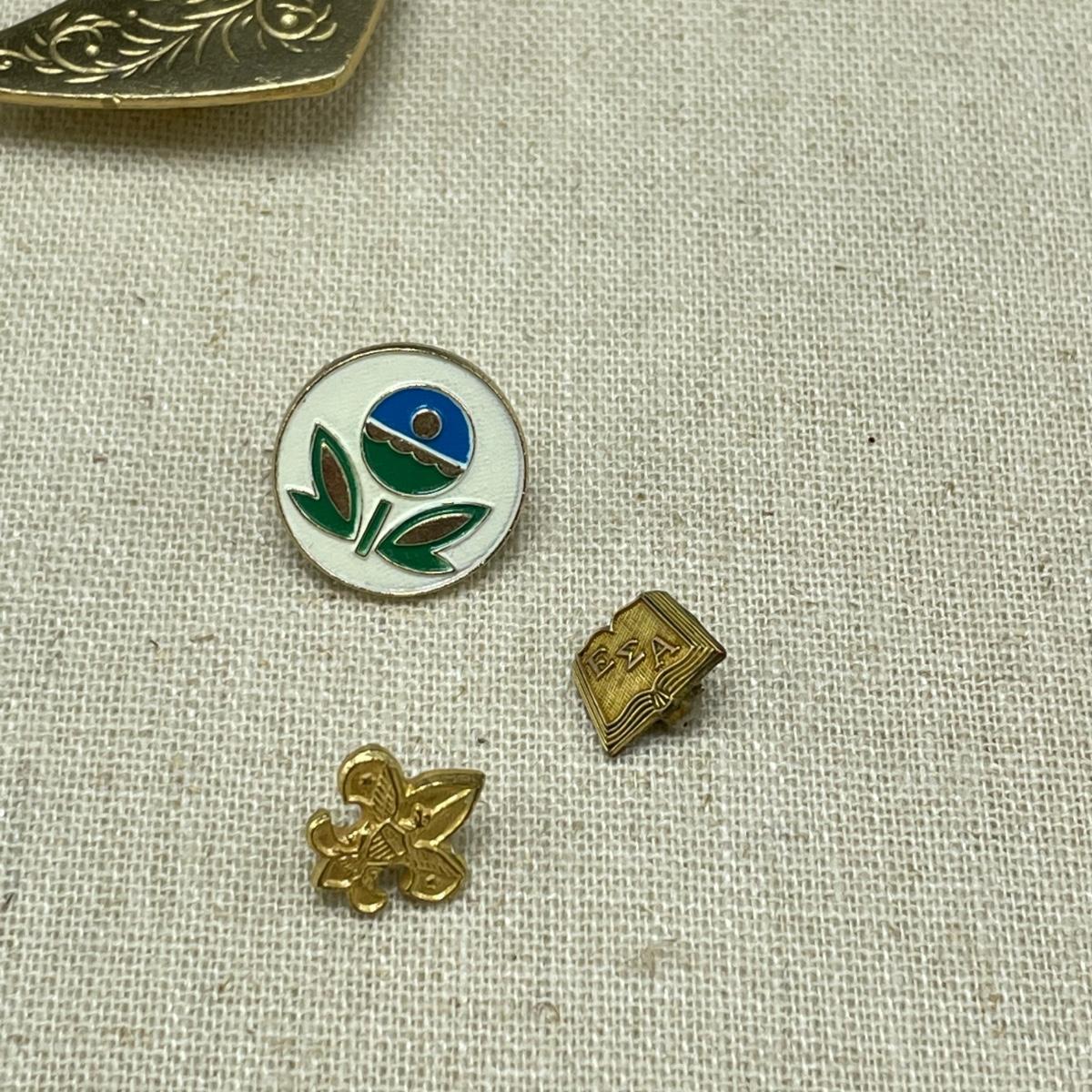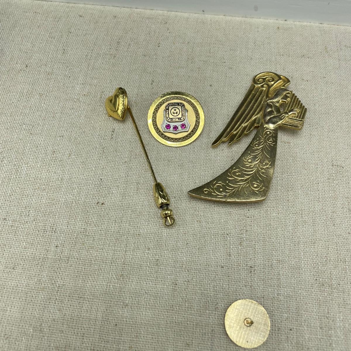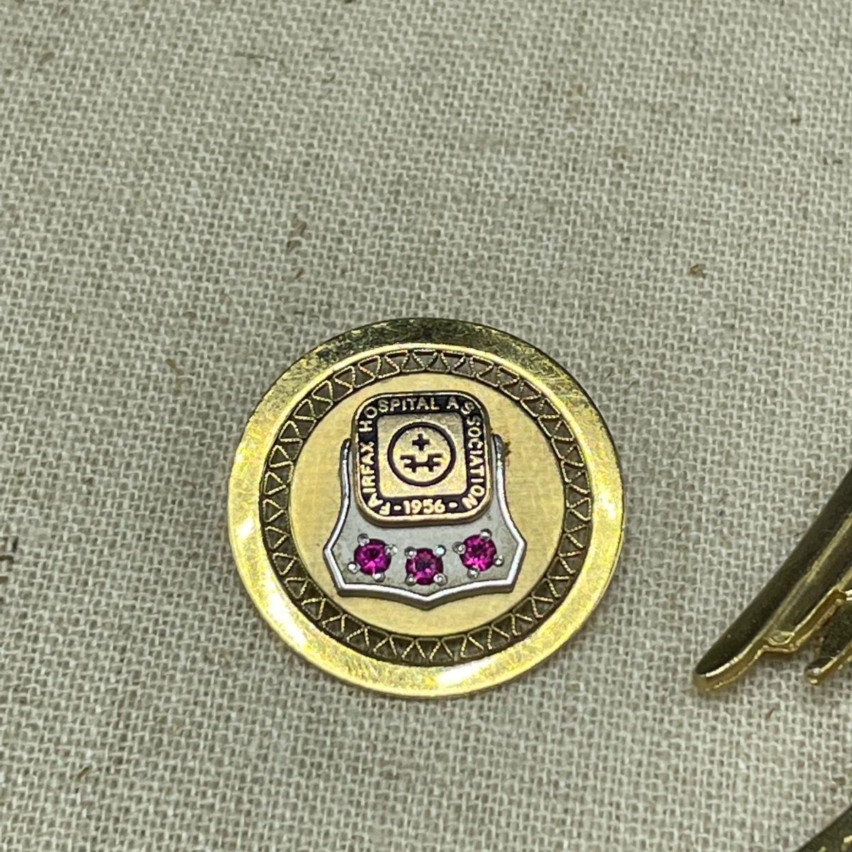 Three vintage pins, five brooches and one locket hat pin. One brooch has Ruby style gems and it’s dated 1956. Markings are shown in photos. Three pins do not have backs. See images. Shipping available.