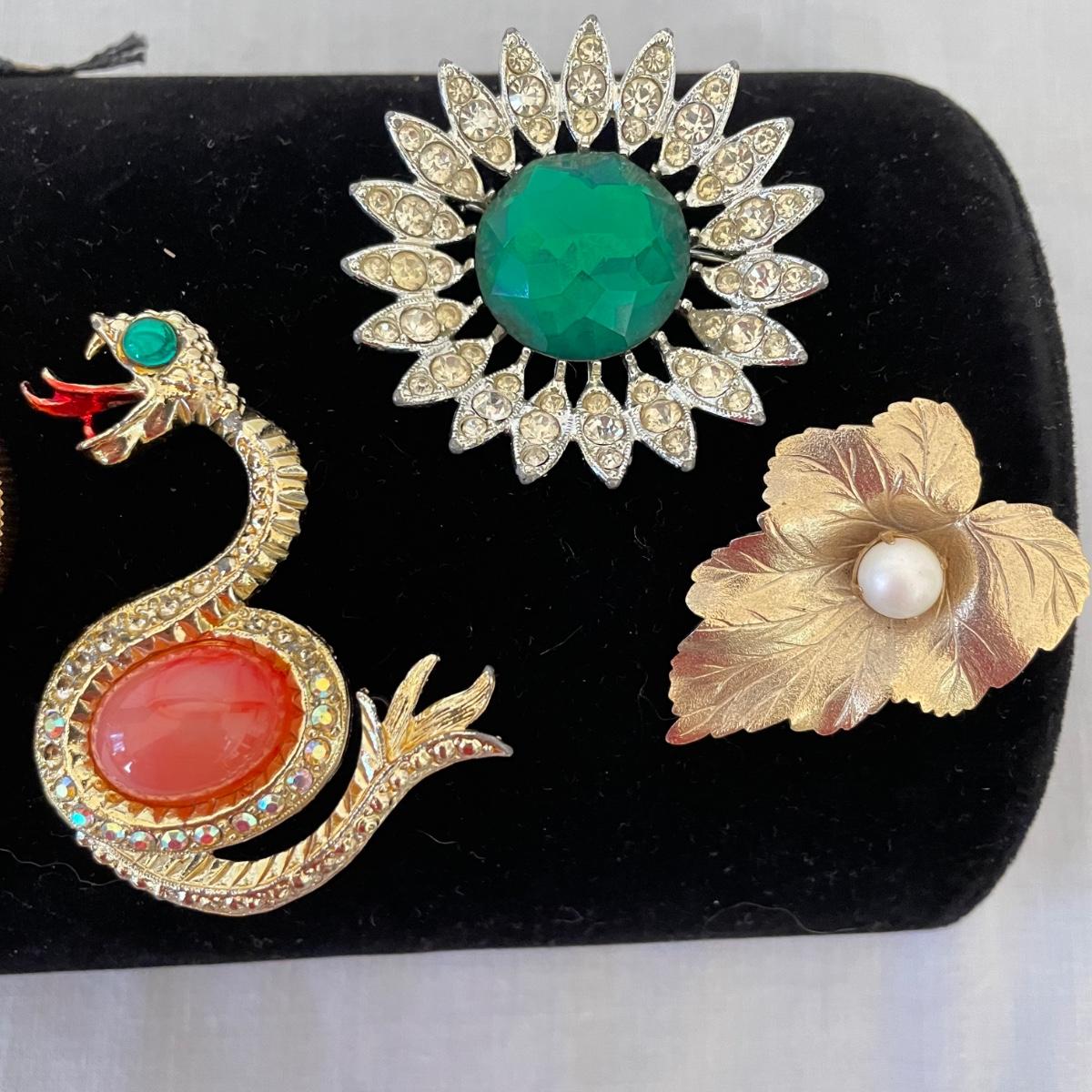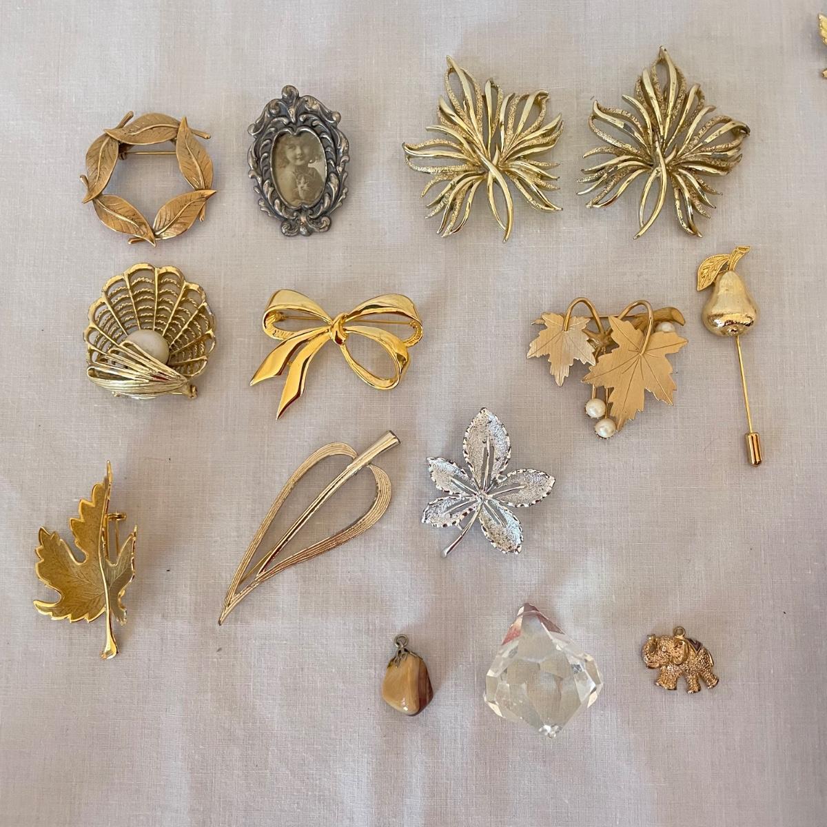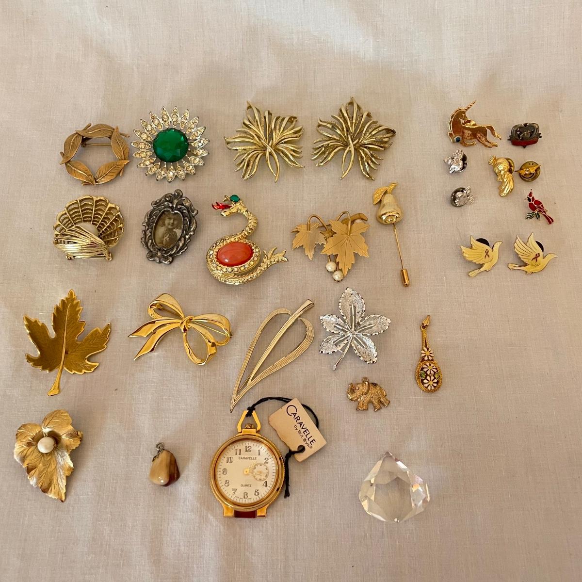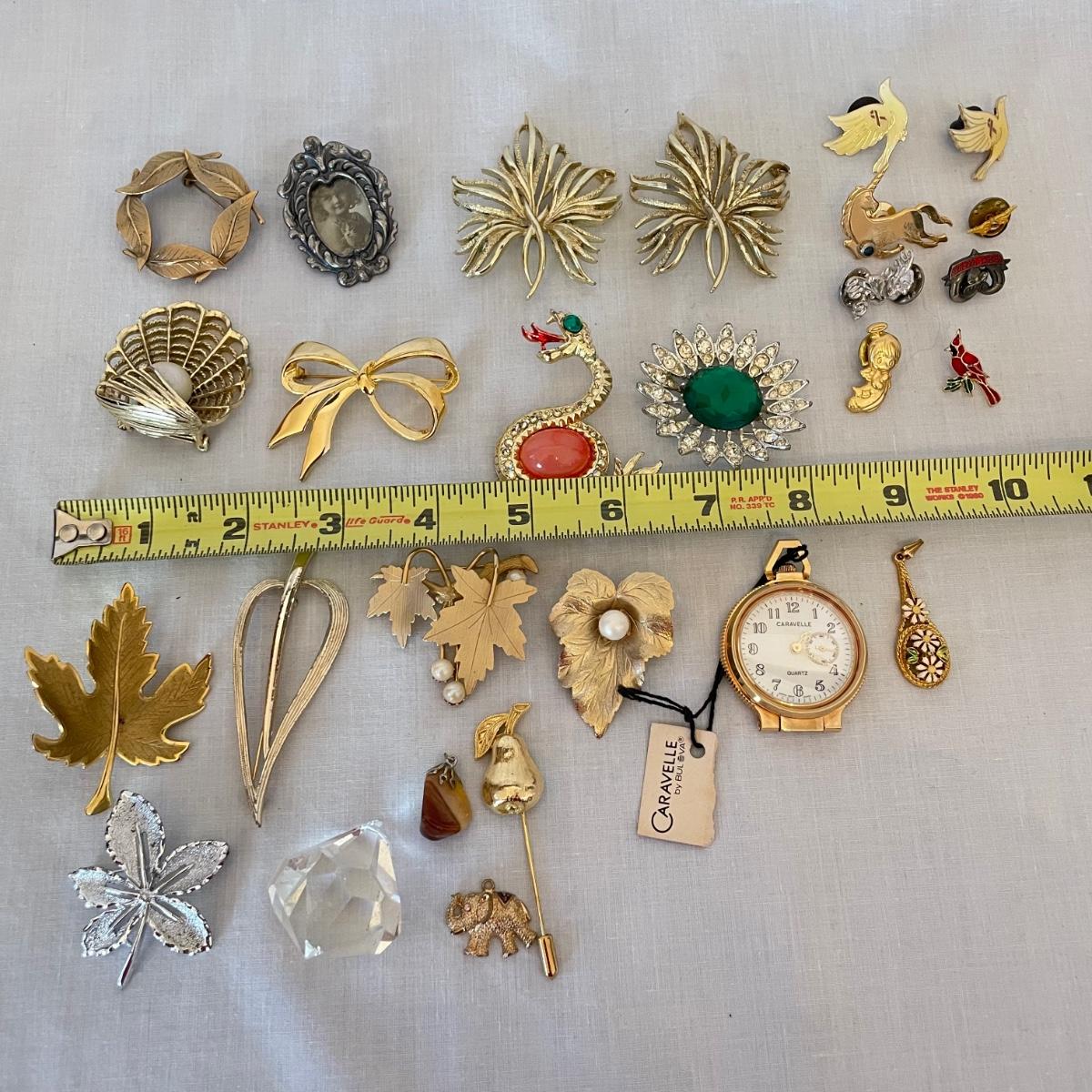 Nice selection of brooches, pins and pendants. A Caravelle Bulova watch pendant with retail tag still attached, a large crystal style pendant with a hole drilled for a chain. Jewelry includes retro style brooches, enamel, maple leaves, a pear hat pin, a photo frame and more. See images. Shipping available. All sales are final. No returns or refunds. Please bid accordingly.