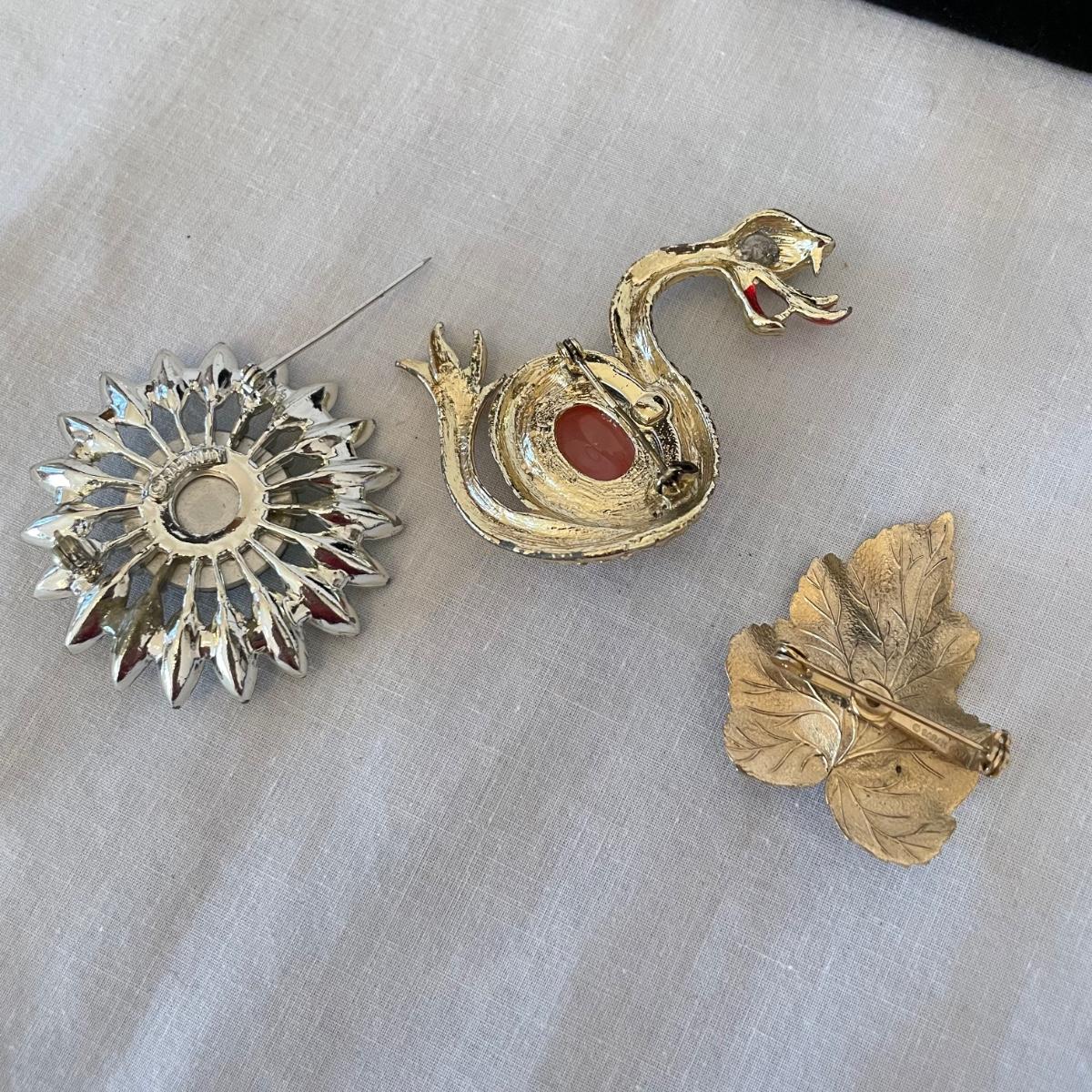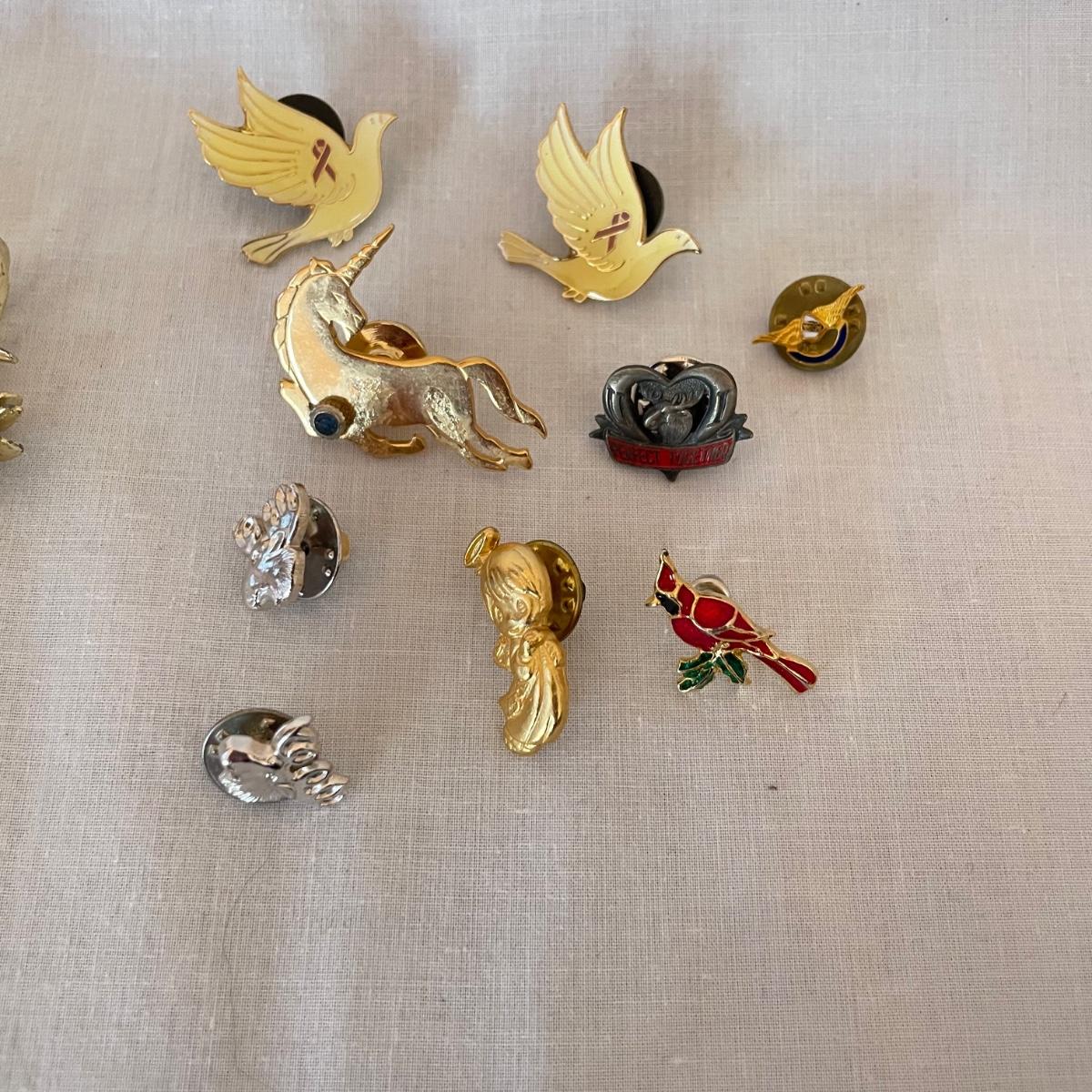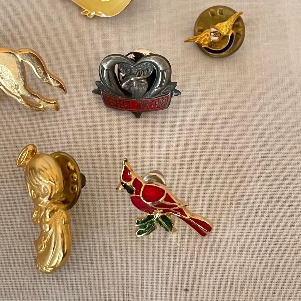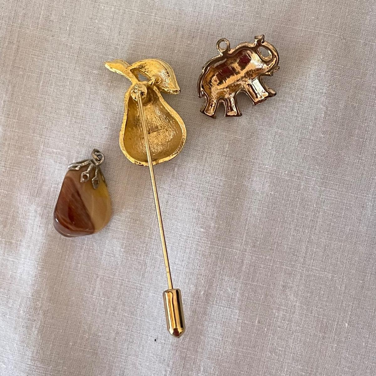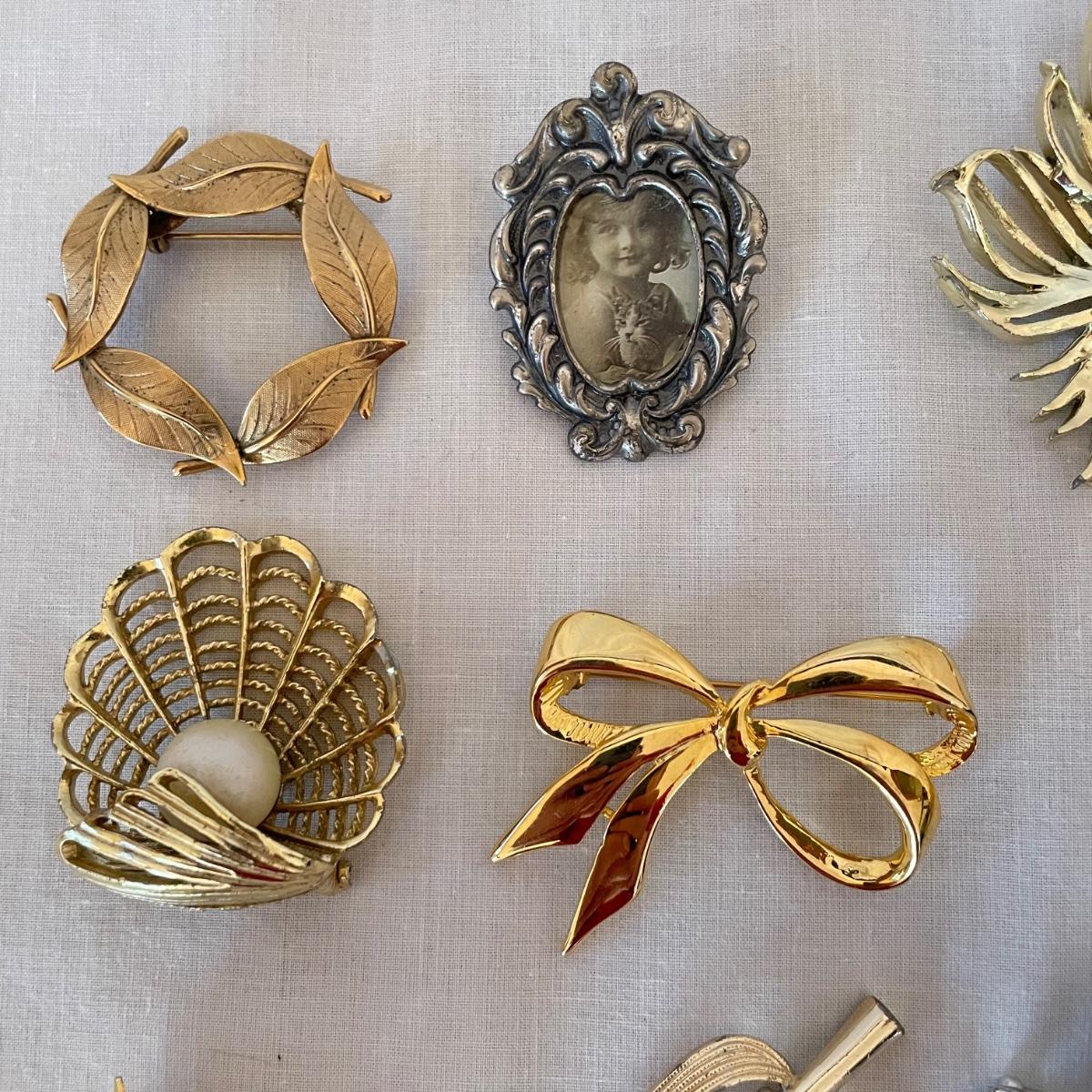 Nice selection of brooches, pins and pendants. A Caravelle Bulova watch pendant with retail tag still attached, a large crystal style pendant with a hole drilled for a chain. Jewelry includes retro style brooches, enamel, maple leaves, a pear hat pin, a photo frame and more. See images. Shipping available. All sales are final. No returns or refunds. Please bid accordingly.