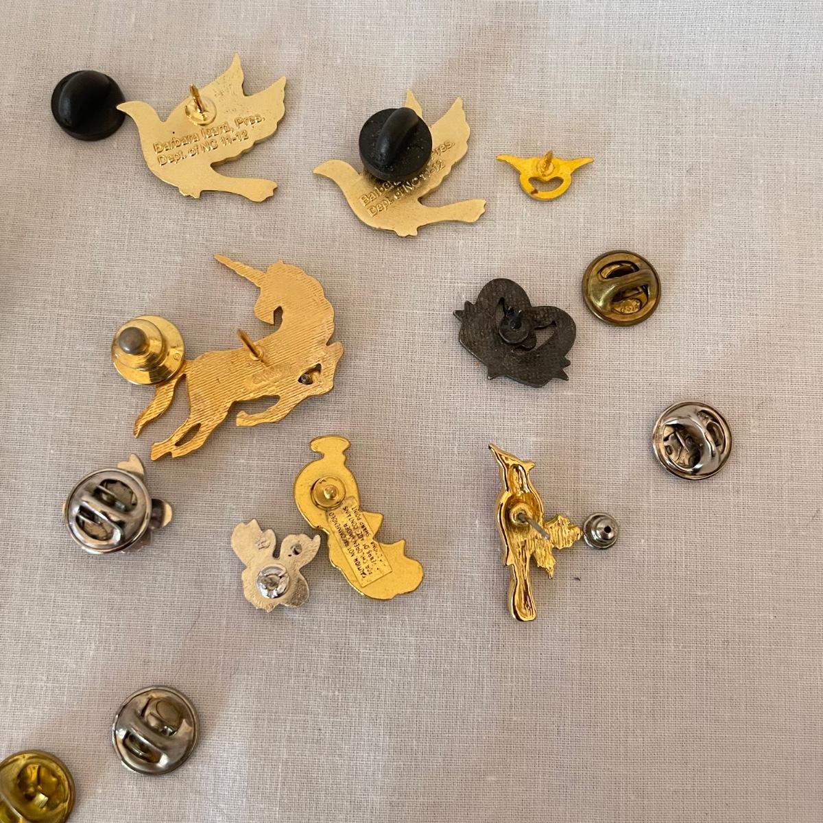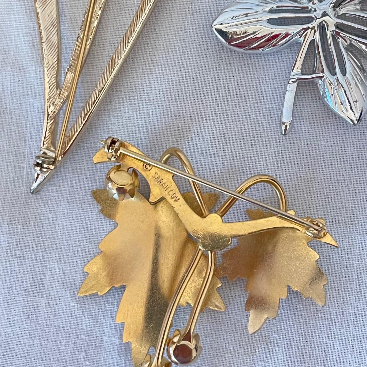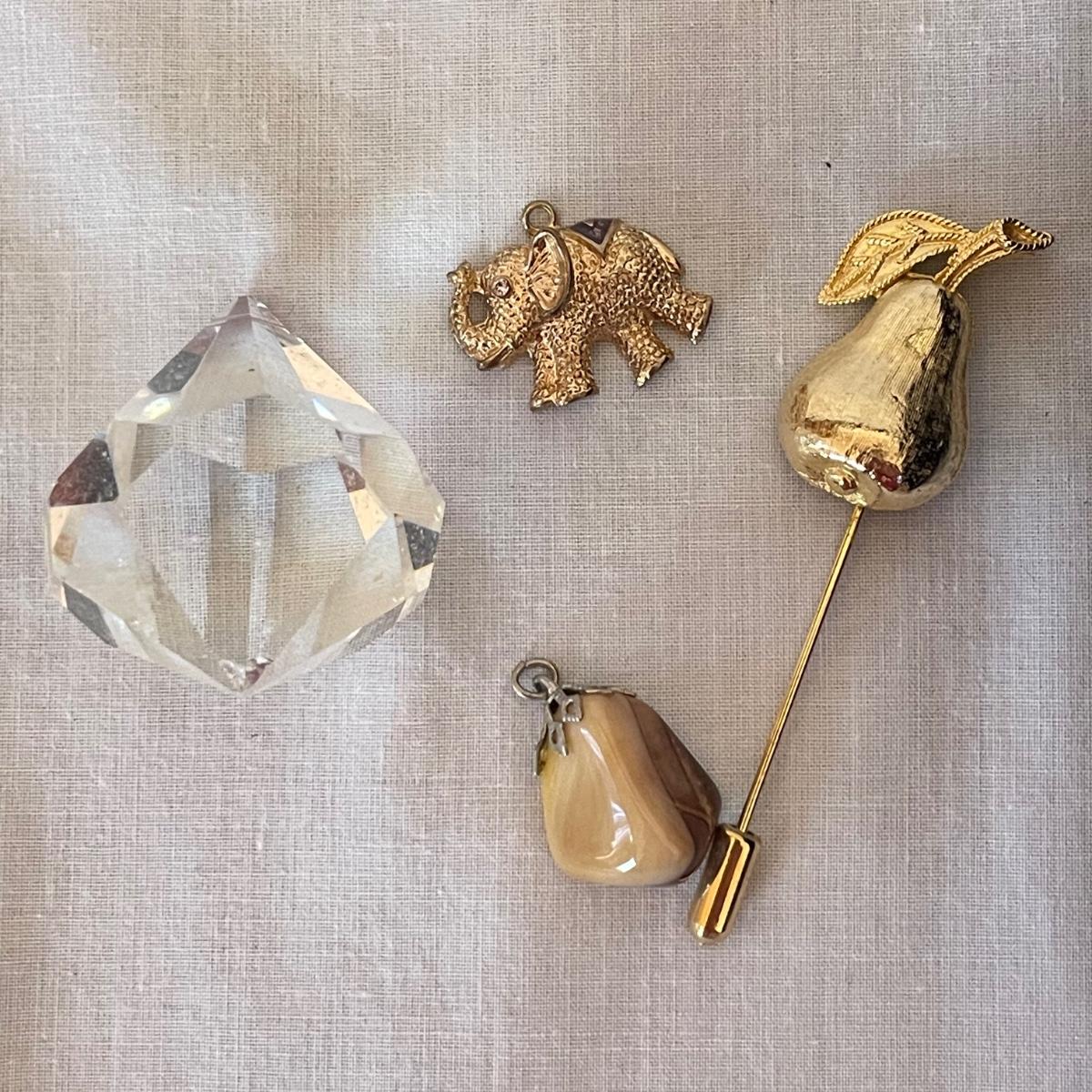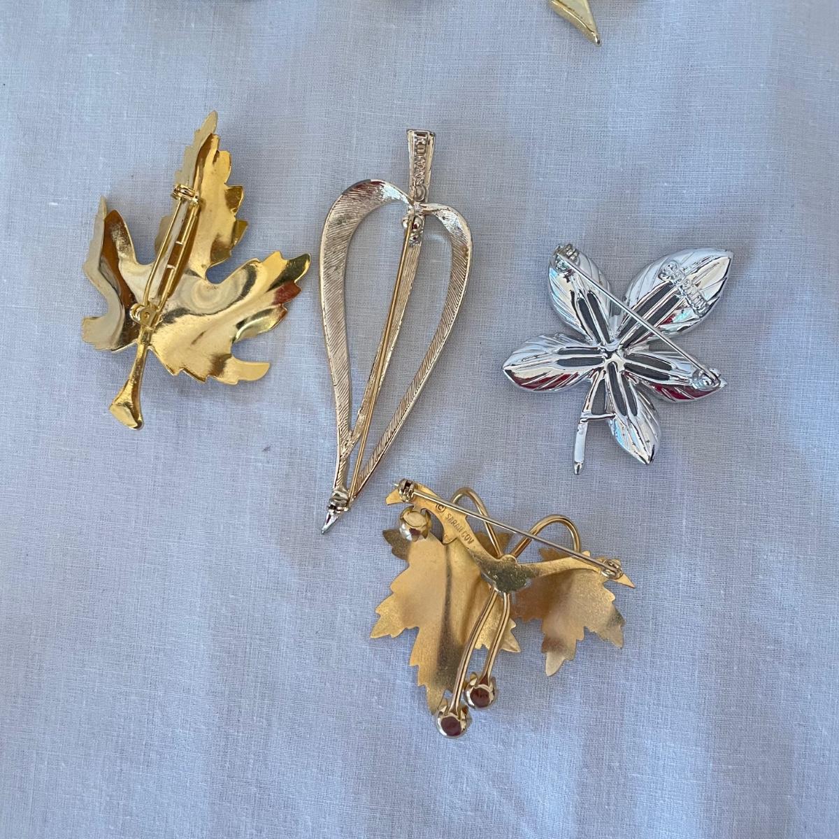 Nice selection of brooches, pins and pendants. A Caravelle Bulova watch pendant with retail tag still attached, a large crystal style pendant with a hole drilled for a chain. Jewelry includes retro style brooches, enamel, maple leaves, a pear hat pin, a photo frame and more. See images. Shipping available. All sales are final. No returns or refunds. Please bid accordingly.