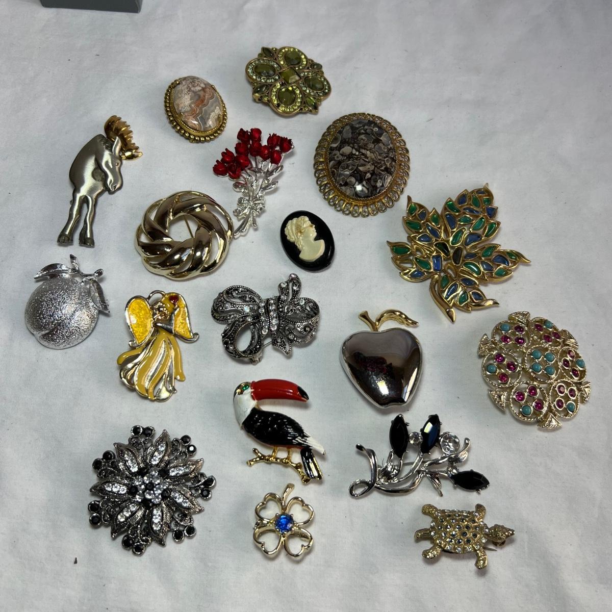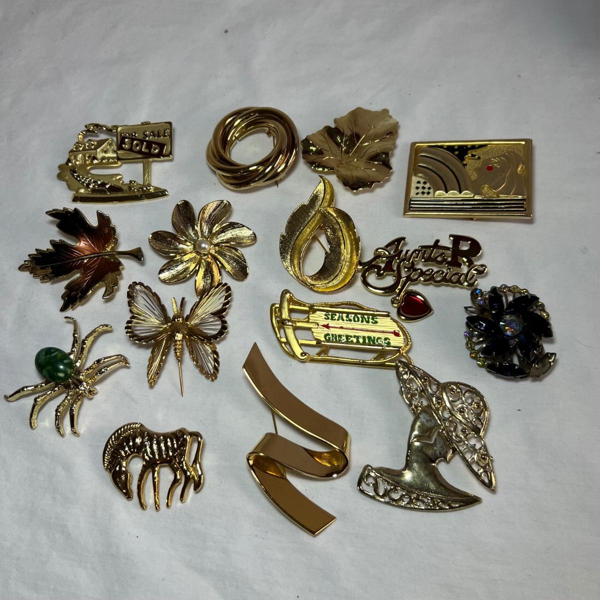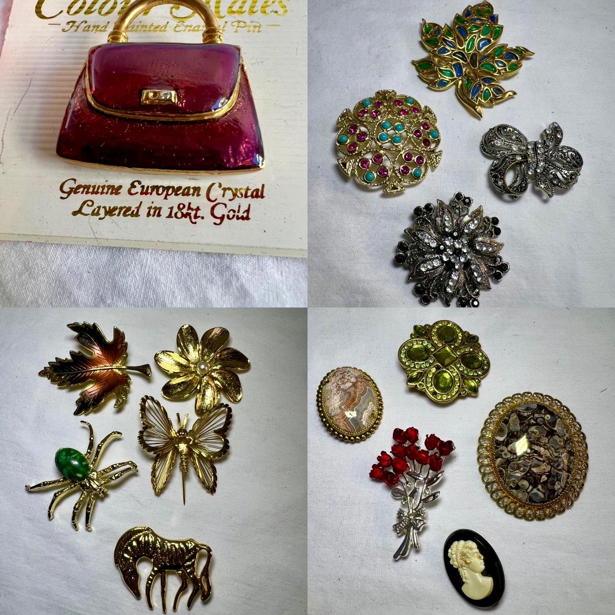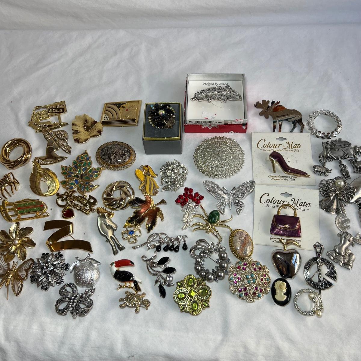 40 plus brooches and 2 scarf pins in this large lot of gold and silver colored metal items. Two brooches are new and are tagged genuine European crystal layered in 18KT. All sales are final, no refunds so please bid accordingly.