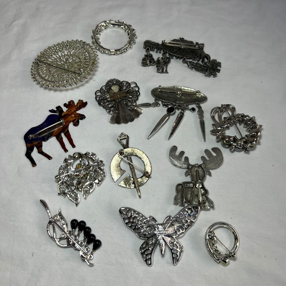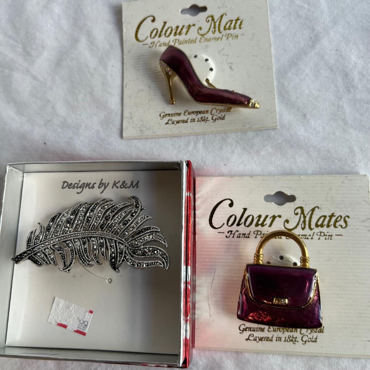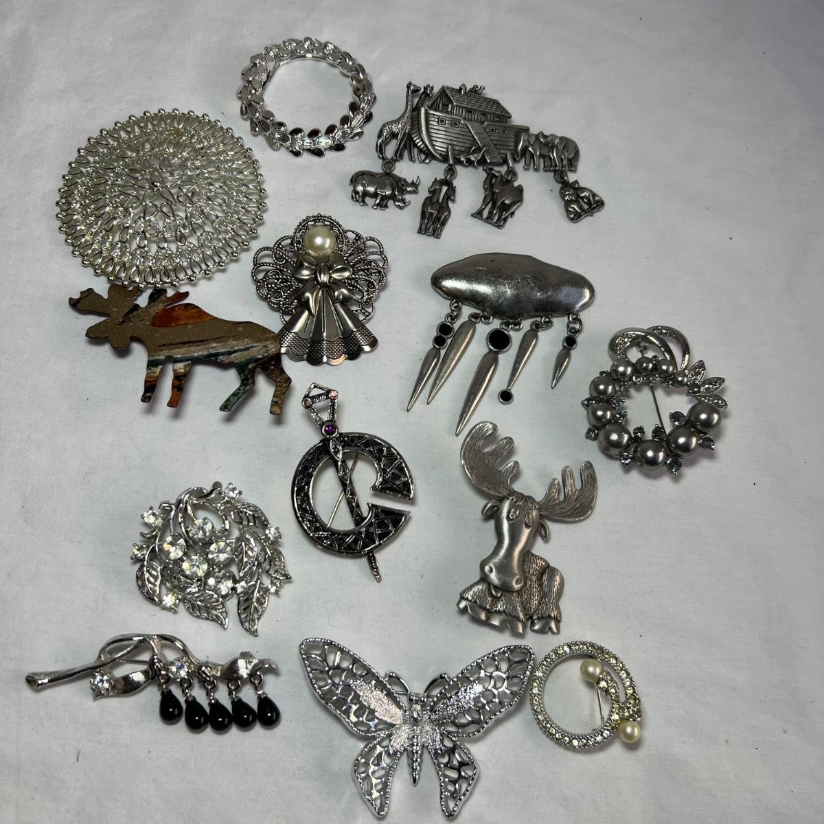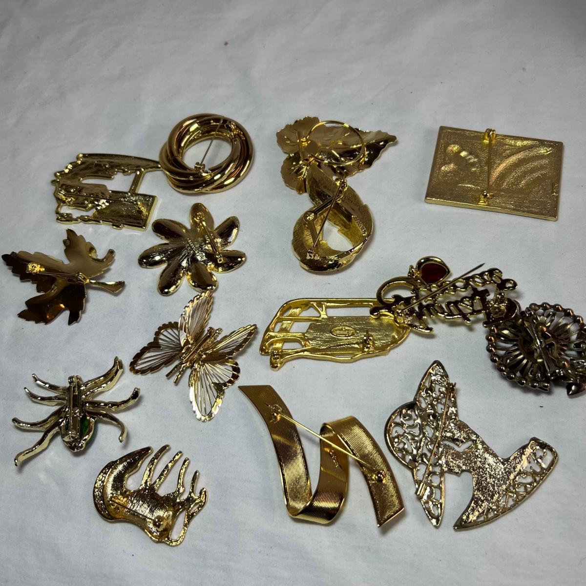 40 plus brooches and 2 scarf pins in this large lot of gold and silver colored metal items. Two brooches are new and are tagged genuine European crystal layered in 18KT. All sales are final, no refunds so please bid accordingly.