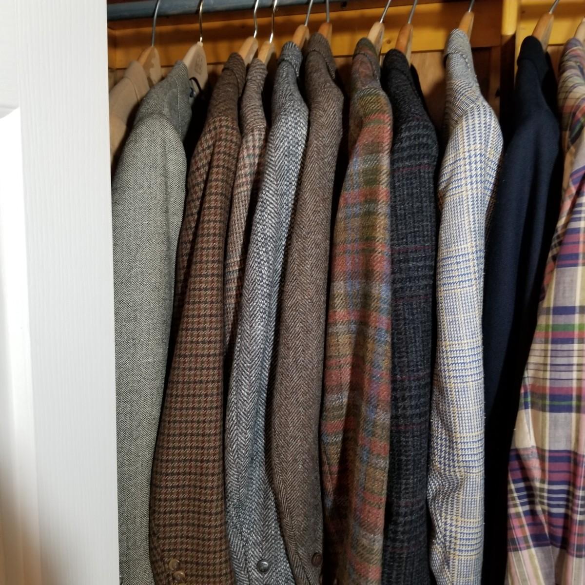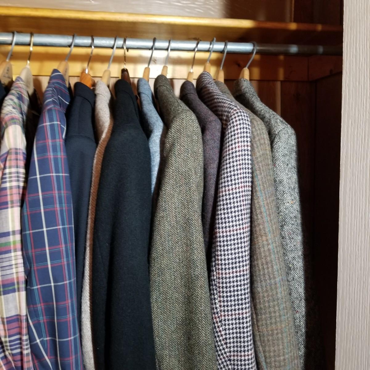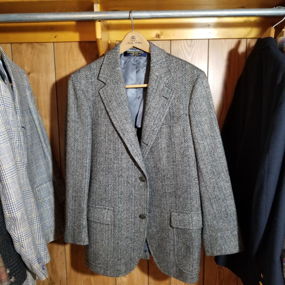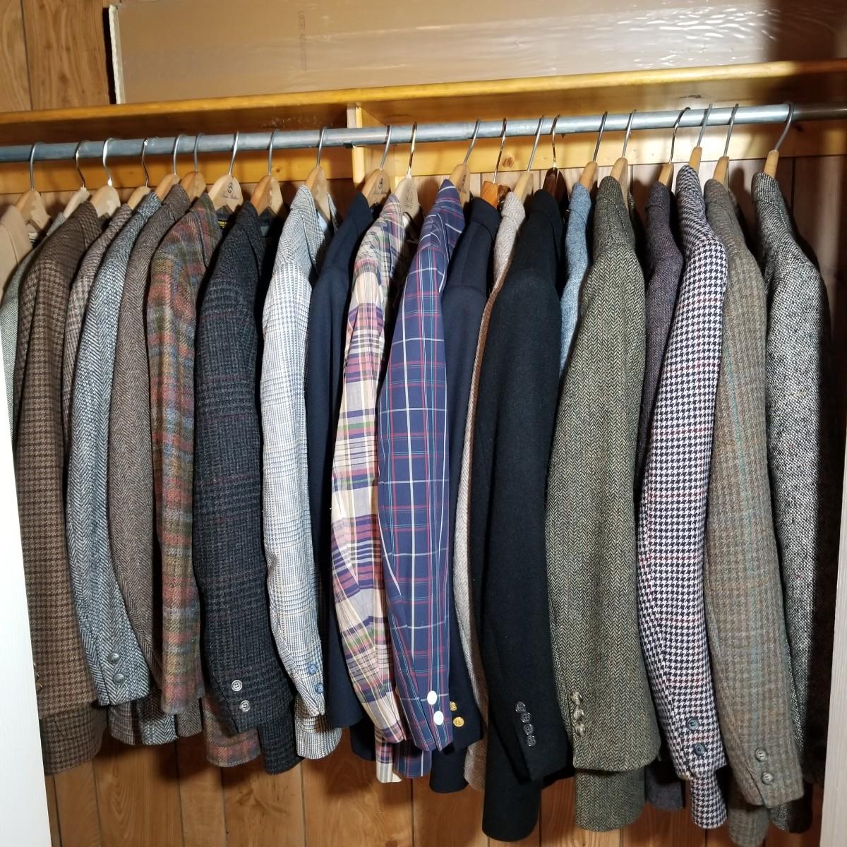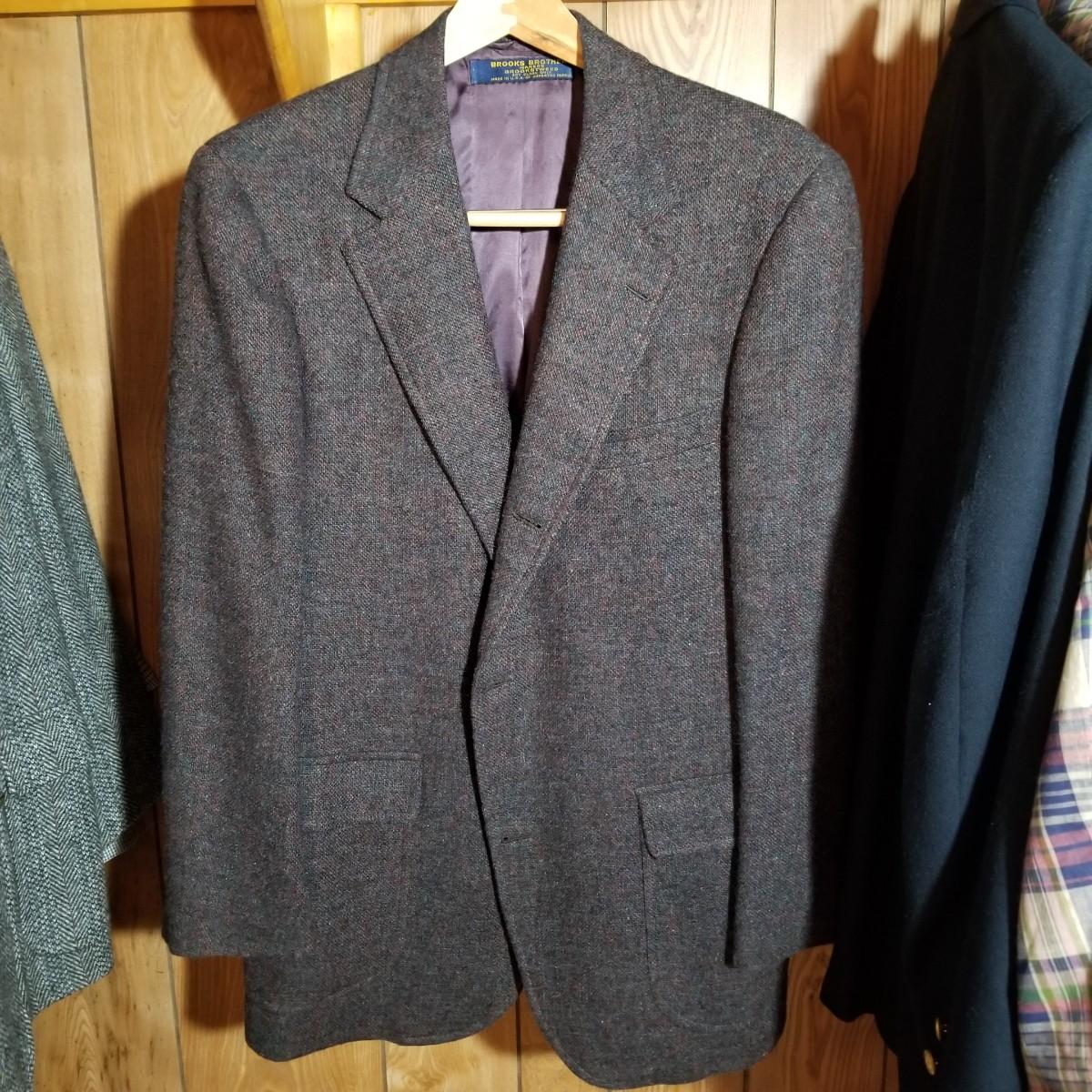 Twenty-one jackets and coats, all Brooks Brothers except for one Jos. A Banks item. Wool, wool/polyester blends, mixture of tweeds, solids and more. Sizes from thirty-six to thirty-eight regular. All items in good condition, on hangers. Hangers are included with this lot. Local pickup only.