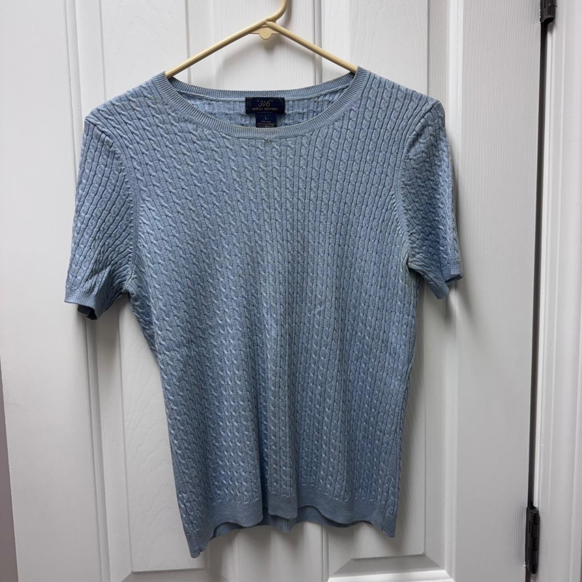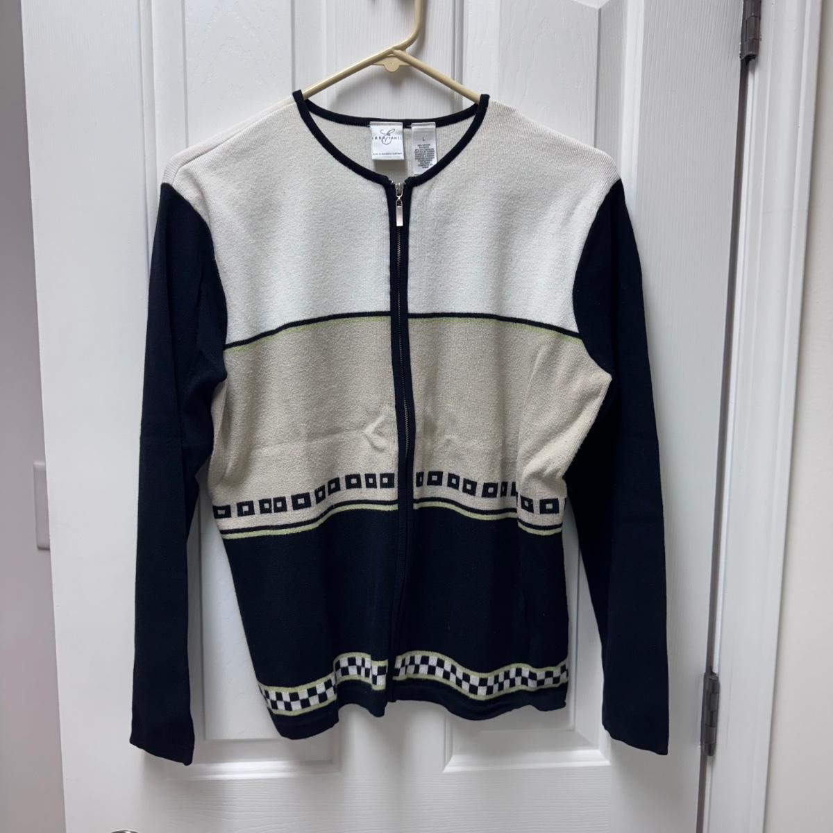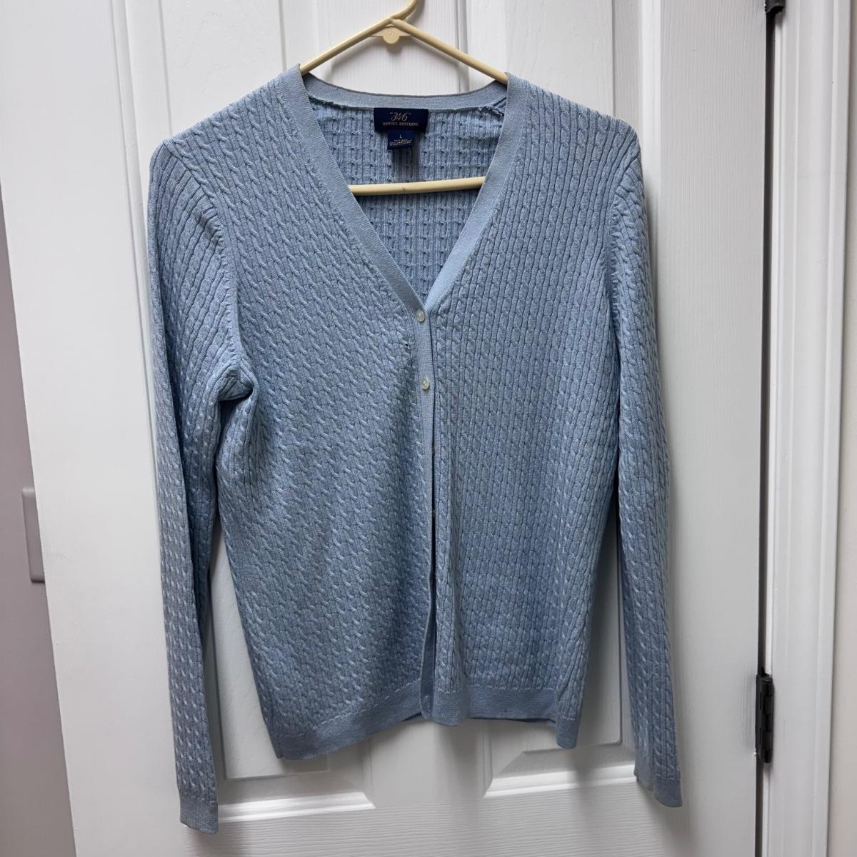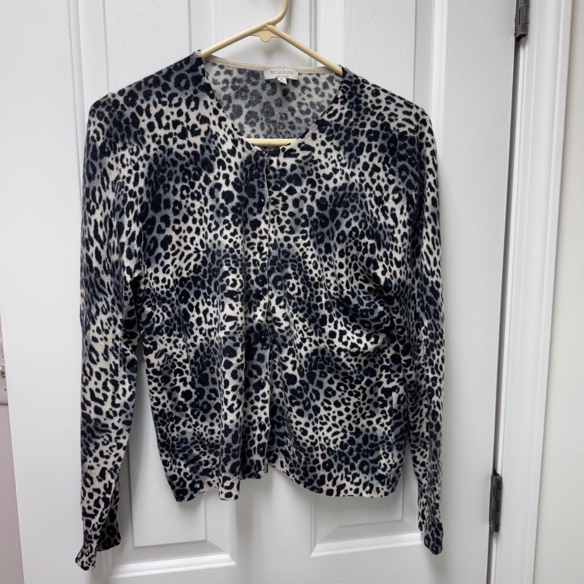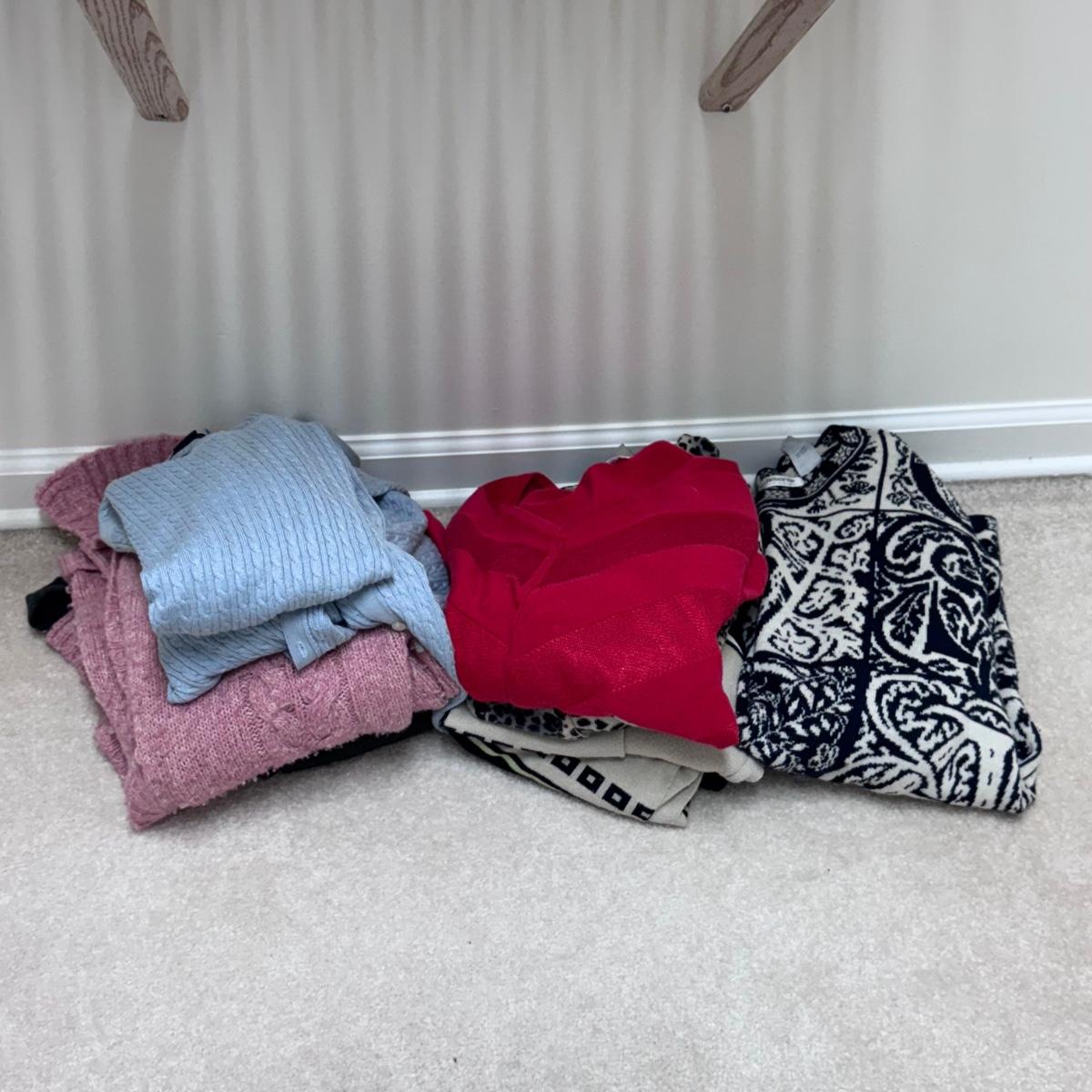 This lot includes one sweater dress from New Directions, one pink L.L Bean cardigan, a light blue short sleeve sweater with matching cardigan from Brooks Brothers, and a matching sweater vest and zip up cardigan by Emma James. It also includes a 100% cashmere animal print sweater by Madison, a red sweater from Calvin Klein, and one Liz Claiborne sweater. See pictures for sizes of each item. The Brooks Brothers matching sweater set is stained and has a small amount of mold on the tag - see pictures included. It appears to be cleanable. Shipping available.
