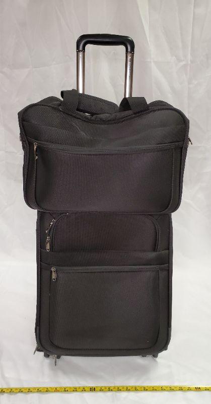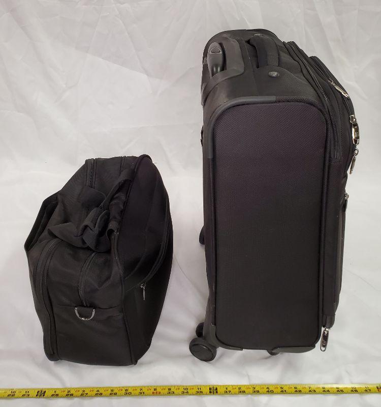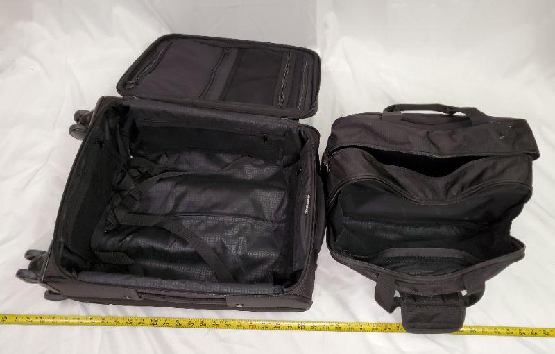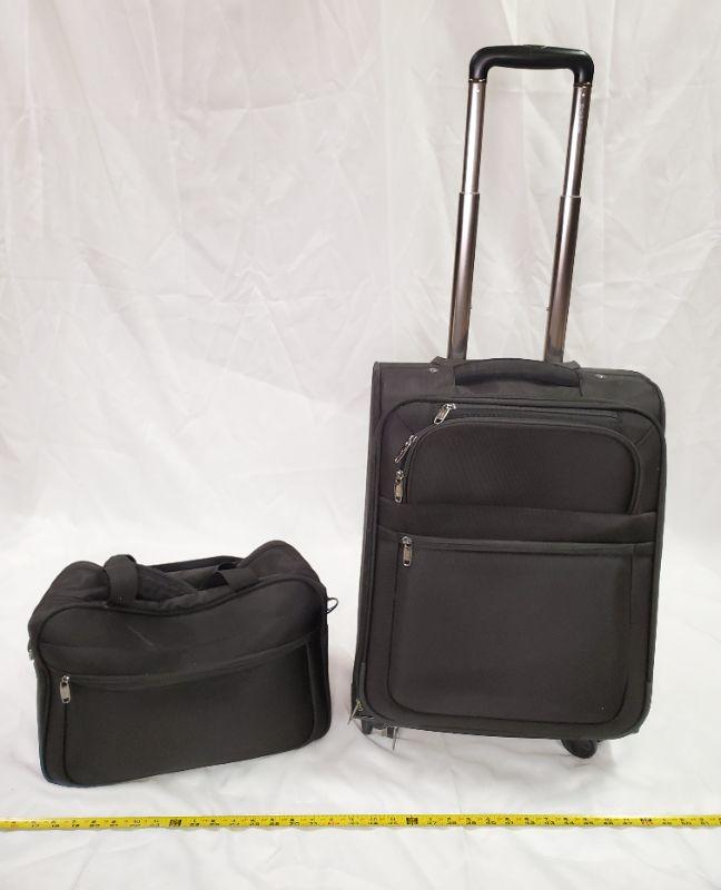 2 pieces of luggage, both Brookstone brand. The little duffle bag has a pocket that slides over the retractable handle of the larger one for easy travel, how awesome is that?! Nice condition!! The larger one has a retractable handle and wheels.