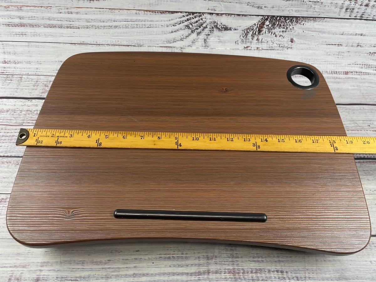 Item is in great condition and is essential to help you work whenever you want to. The portable lap desk is approximately 19” wide and 5” tall.