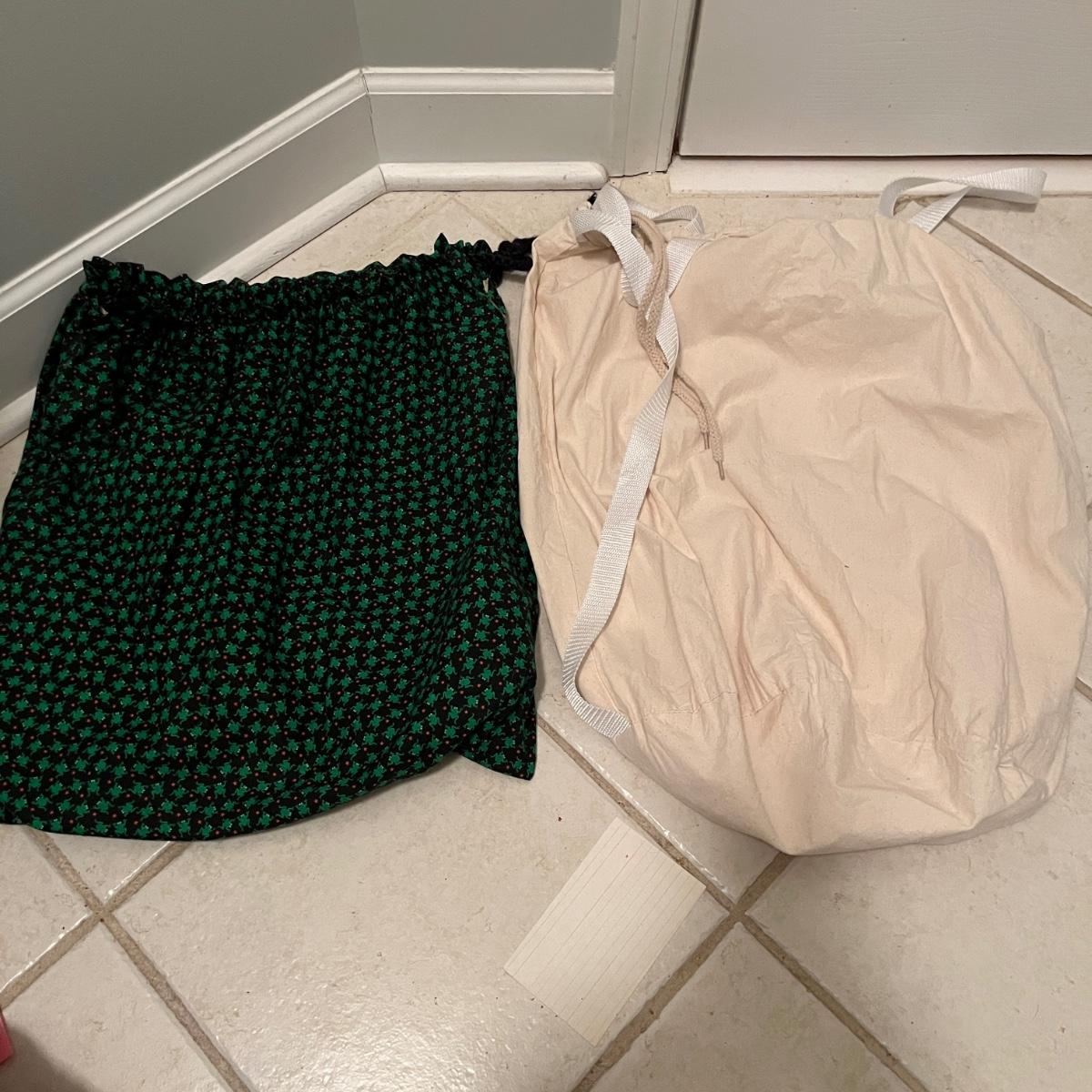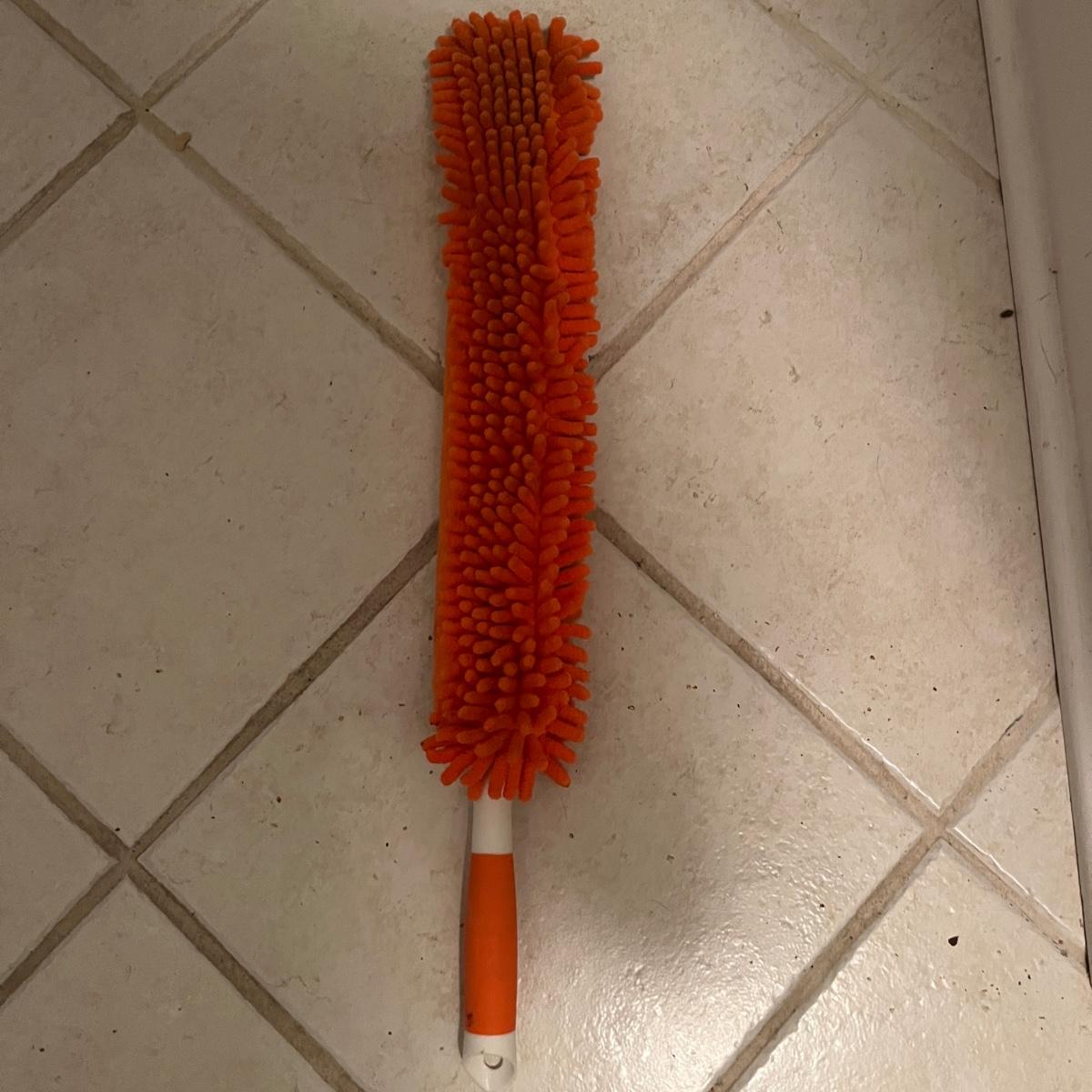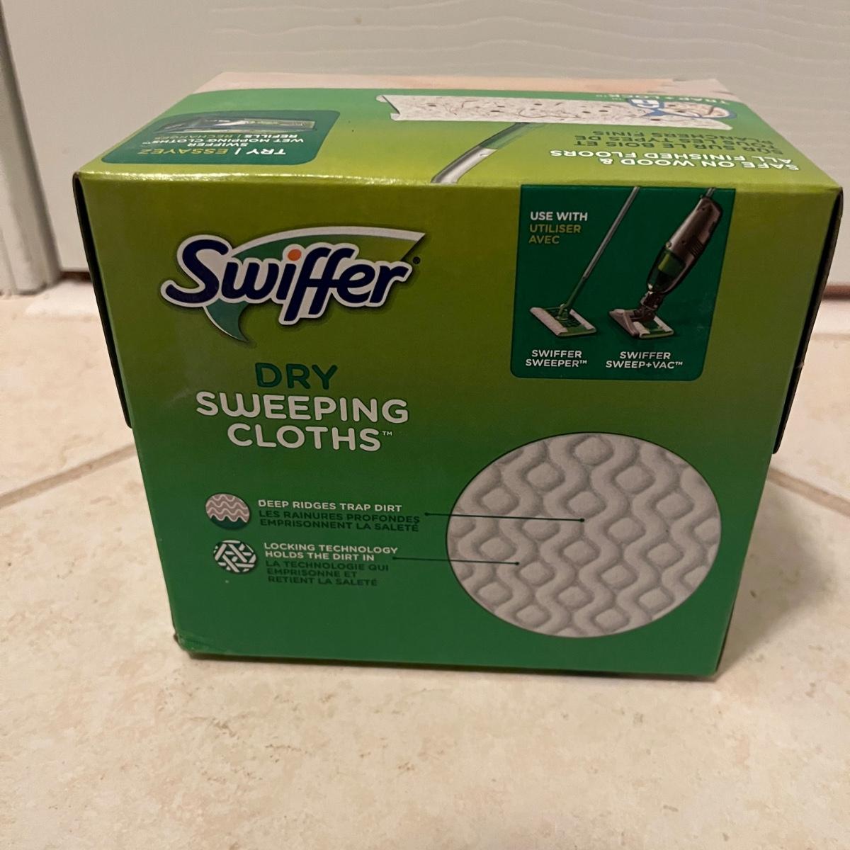 Lot includes two brooms, dustpans, mop, Swiffer, hand duster, laundry bags and more.