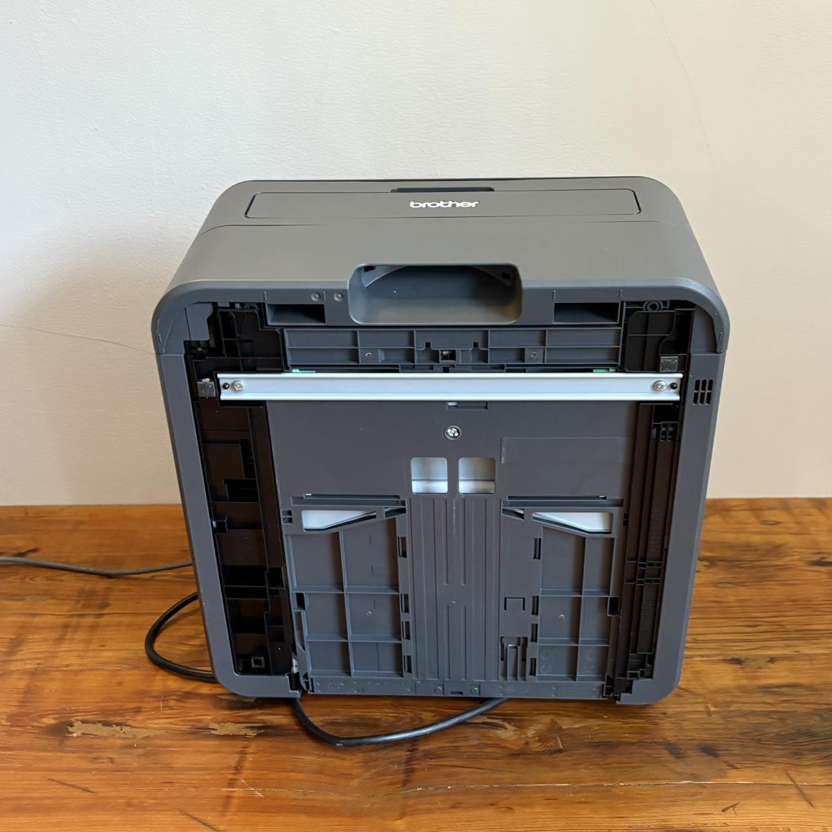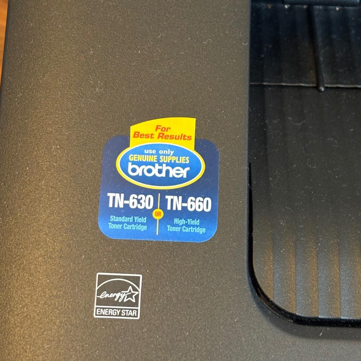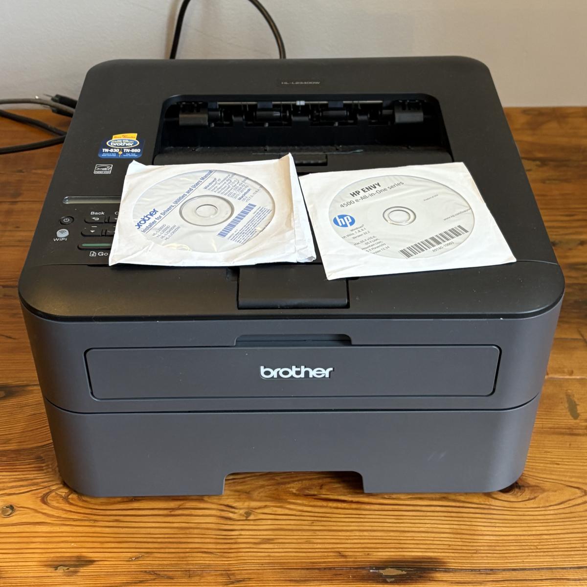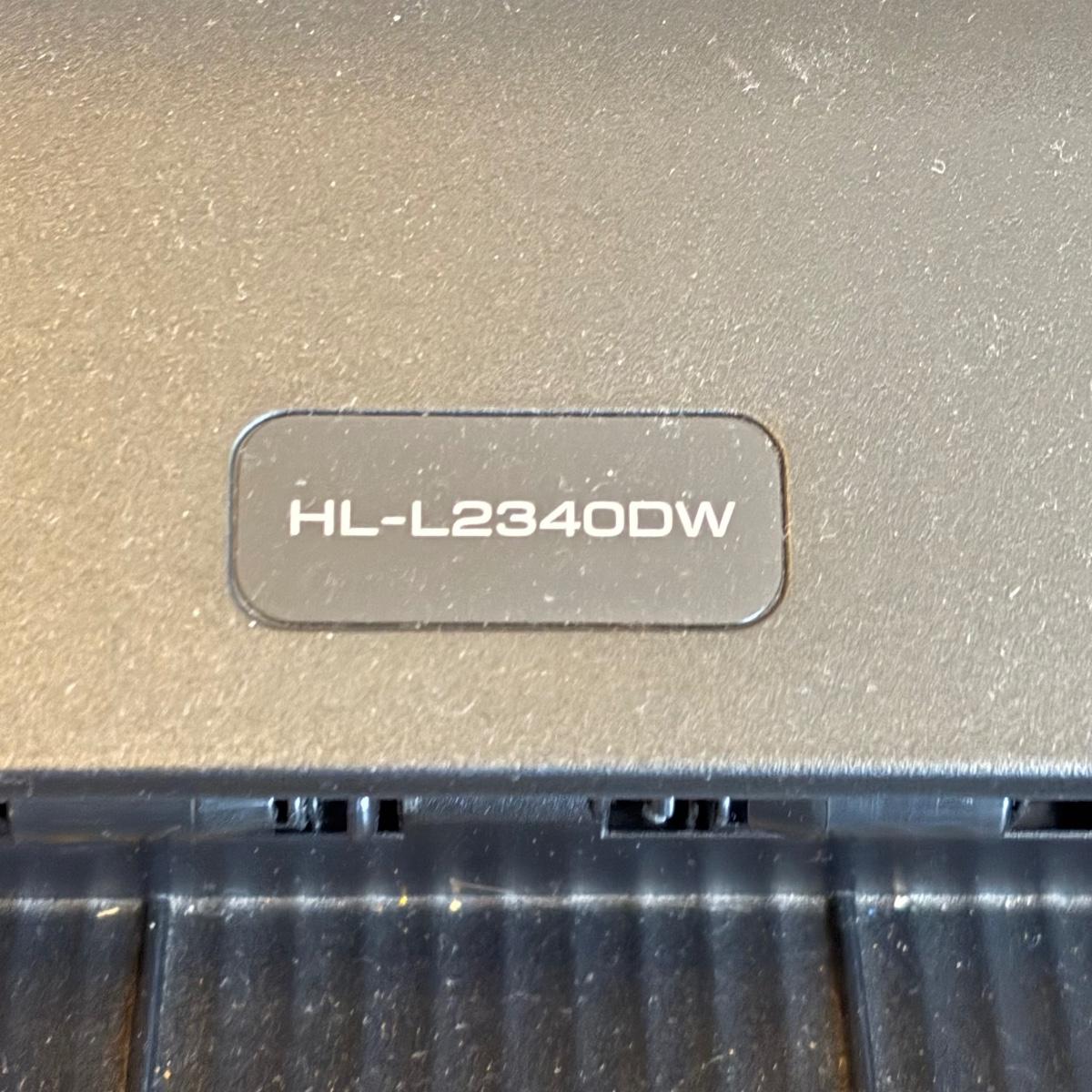 Brother compact monochrome laser printer is designed for home or small office use and is model HL - L2340DW. The measurements are approximately 14" x 14" x 7"H. It comes with 2 CDs, see pictures for reference. Printer powered on when plugged in.